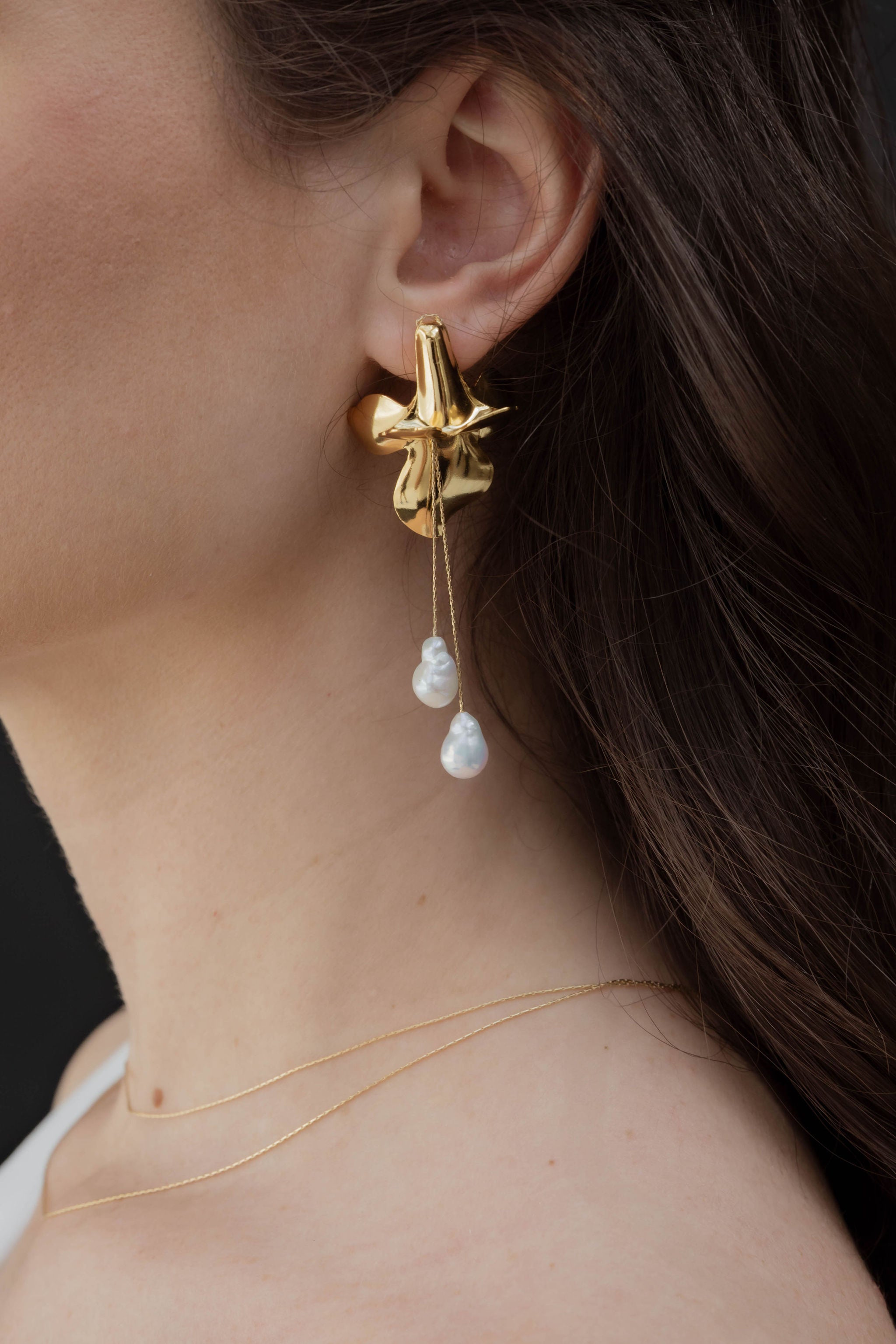 This unique creation consists of a stylized arum flower , forming the base of the buckle, in 24k gold-plated brass, from which fall two fine sterling silver chains , each adorned with a magnificent natural pear-shaped baroque pearl . The whole draws a fluid, airy and terribly feminine silhouette.