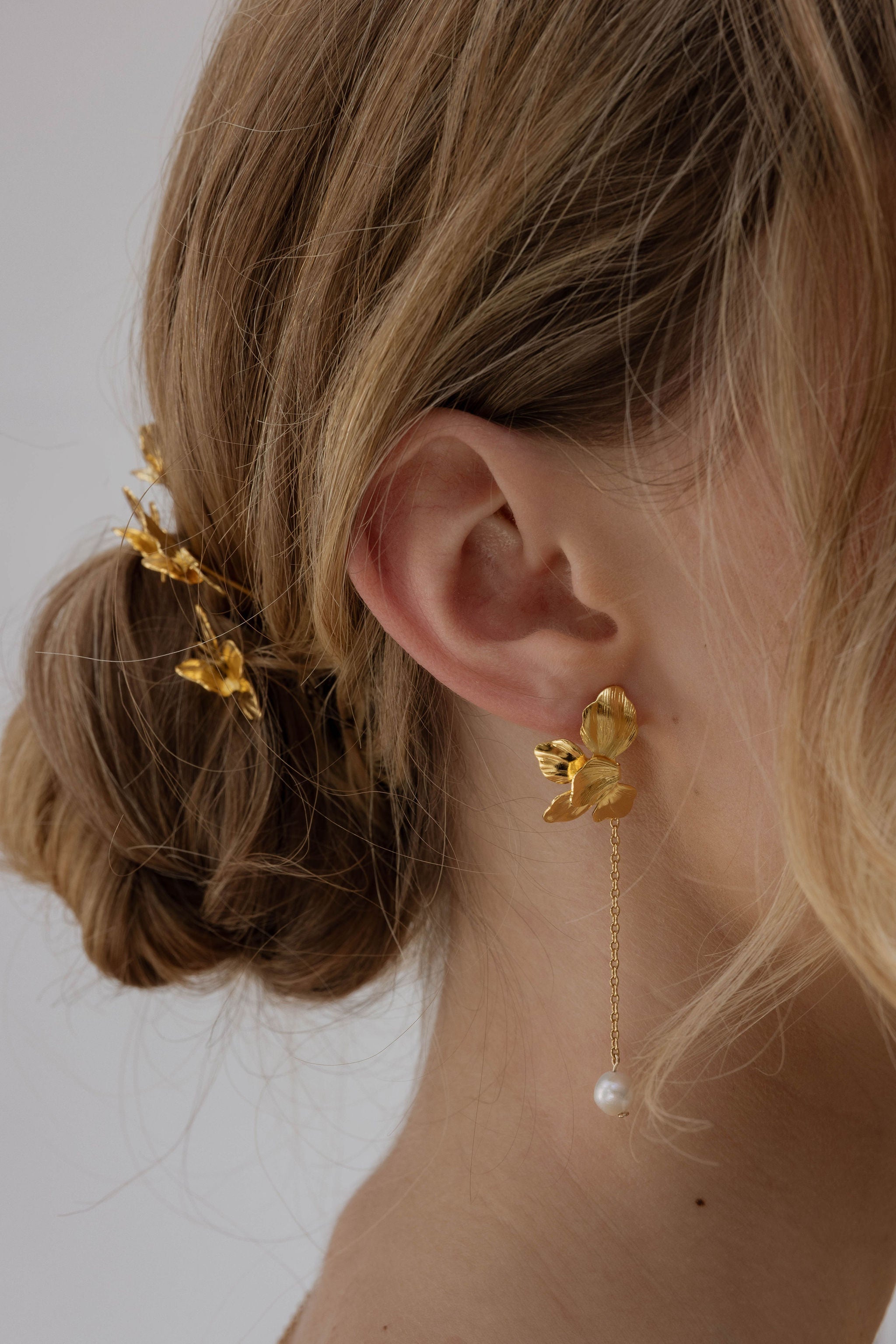Each pair is handcrafted in our workshop, from flowers with delicately sculpted petals , plated in 24k gold or silver, for a romantic and sophisticated look. These long and symmetrical earrings are enhanced by a fine chain that delicately lets a natural cultured pearl hang, round and luminous.