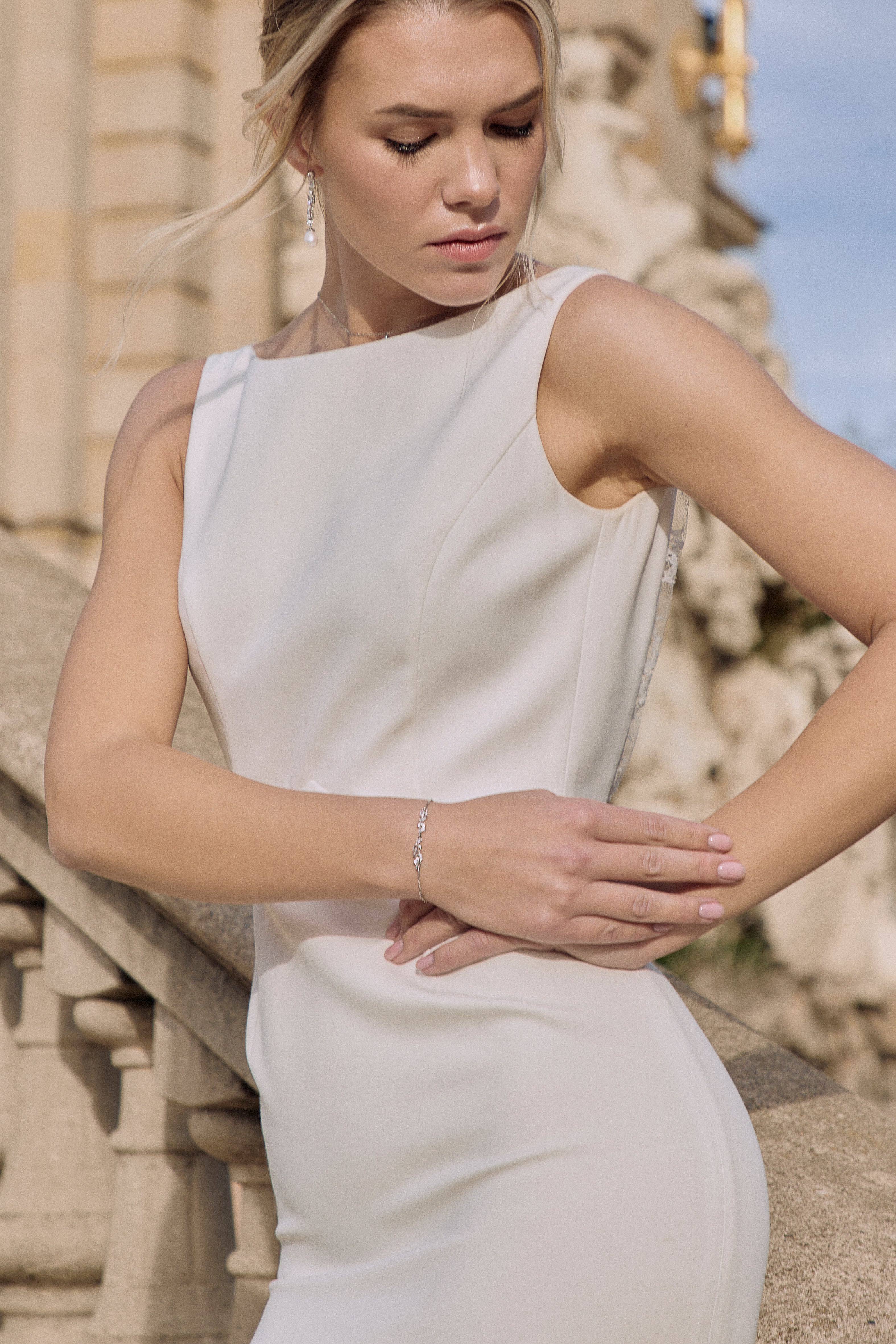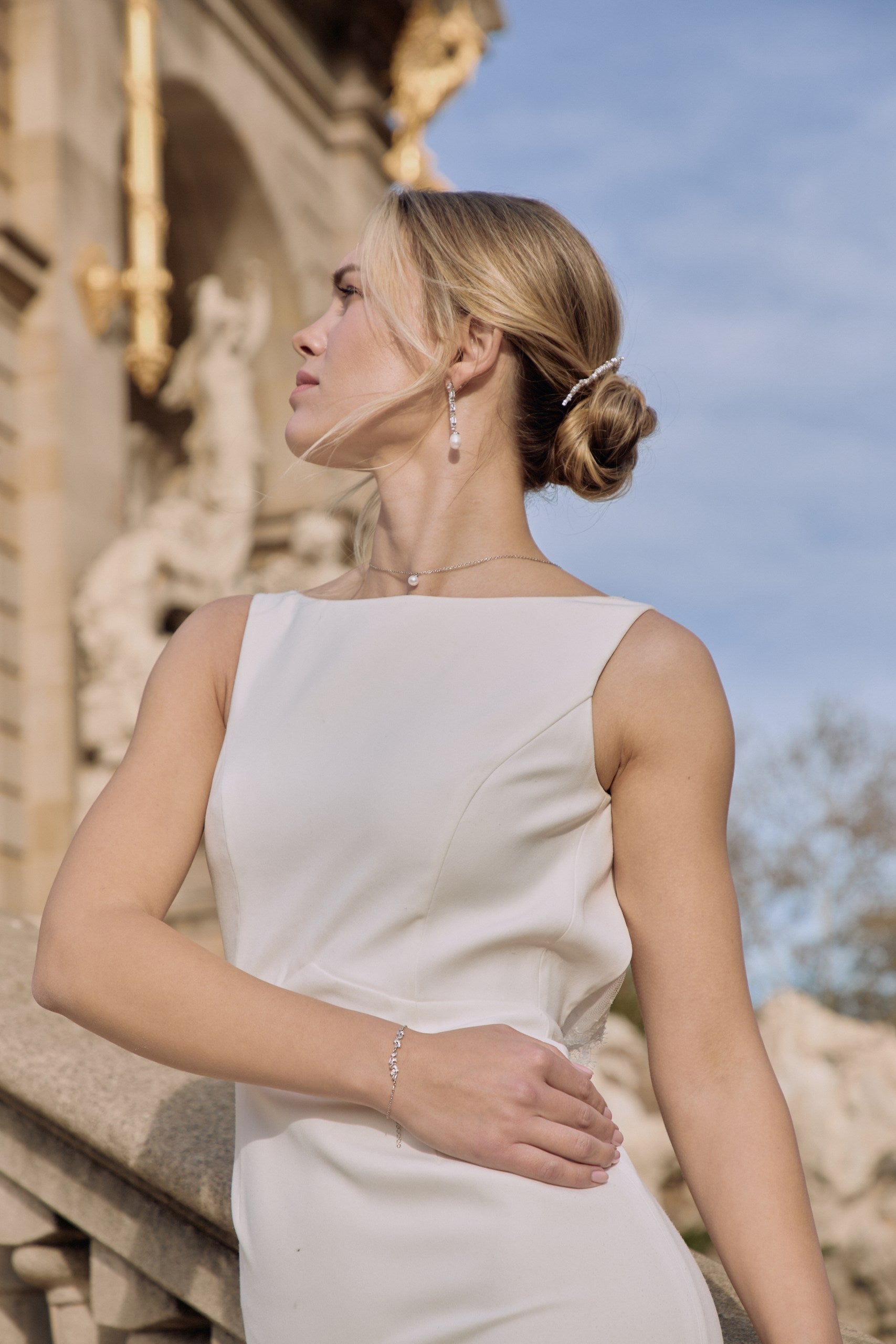 Fait à partir de zircons de formes géométriques, ce bracelet en chaînes à finition rhodium apportera une touche délicate et raffinée à votre tenue de mariée.
