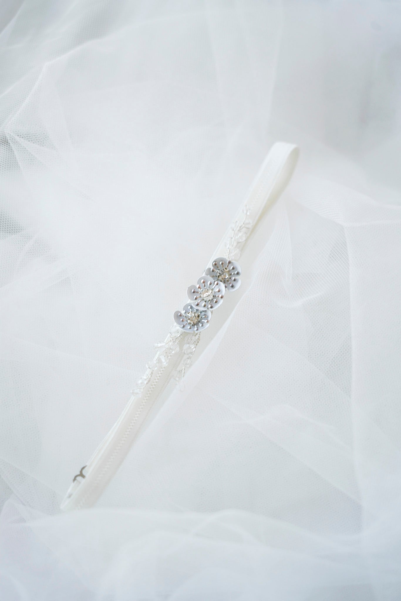 Malva est un magnifique accessoire de mariage qui offre une élégance grâce à son petit bouquet de fleurs et perles. Trois magnifiques fleurs métalliques argentées agrémentées de fines branches de perles et cristaux sur les cotées sont ajoutées a cette jarretière.