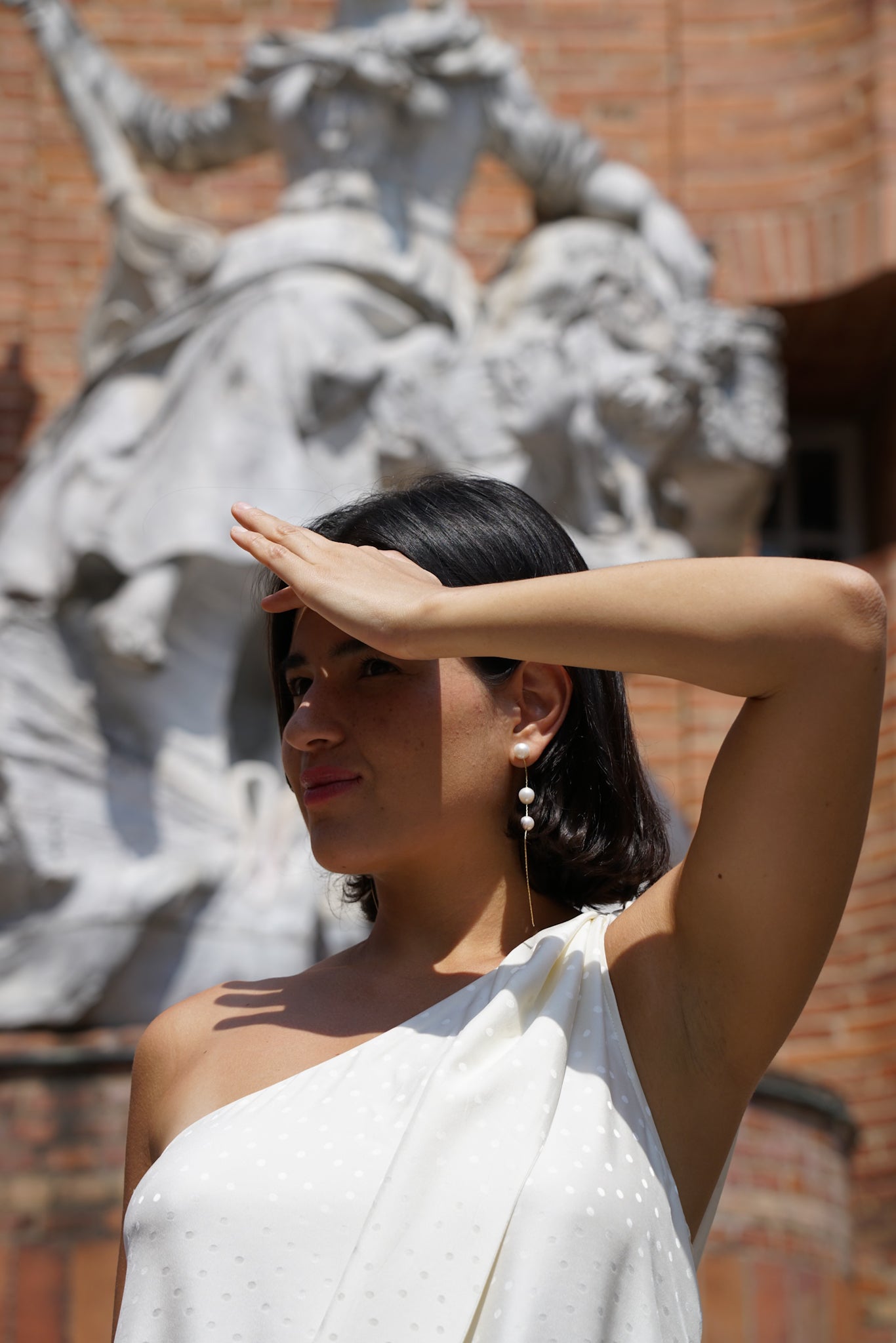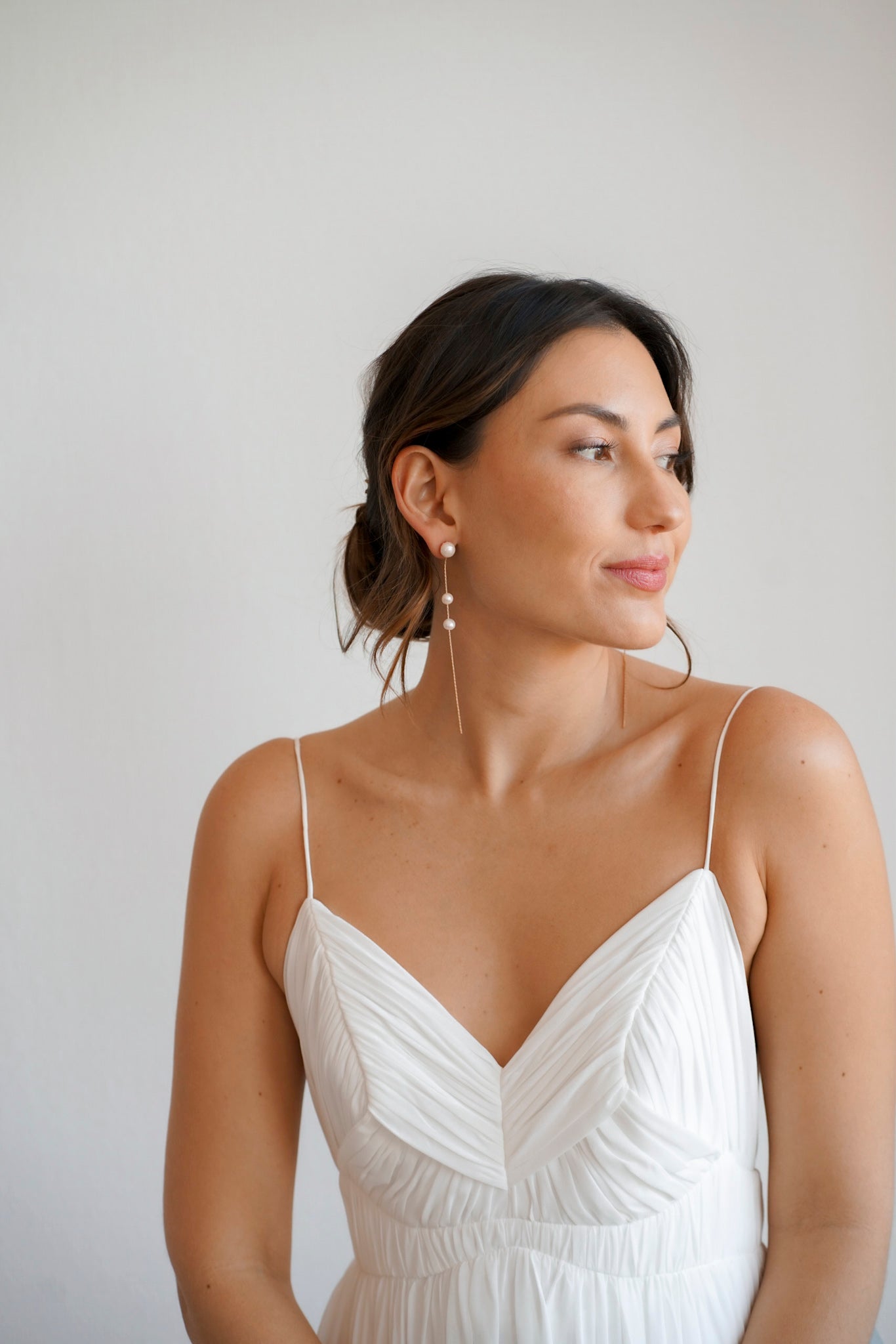 Boucles d'oreilles pendantes en or avec 3 perles blanches portées par une femme avec un chignon de mariage