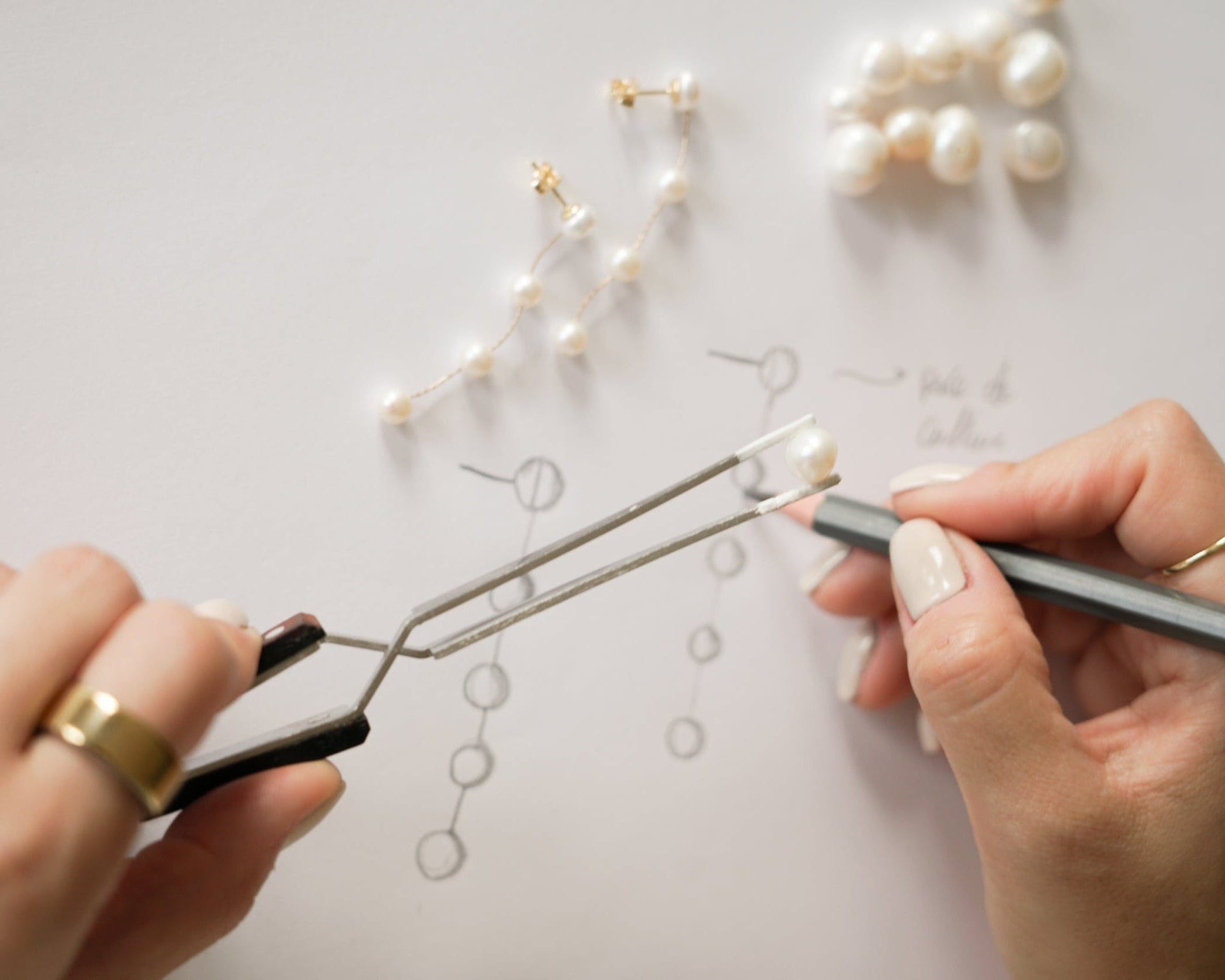 Chacun de nos bijoux est fabriqué à la main dans notre atelier, selon les gestes précis de la bijouterie traditionnelle : torsadage de fils, couture minutieuse, montage en queue de cochon, perçage et sertissage des perles.