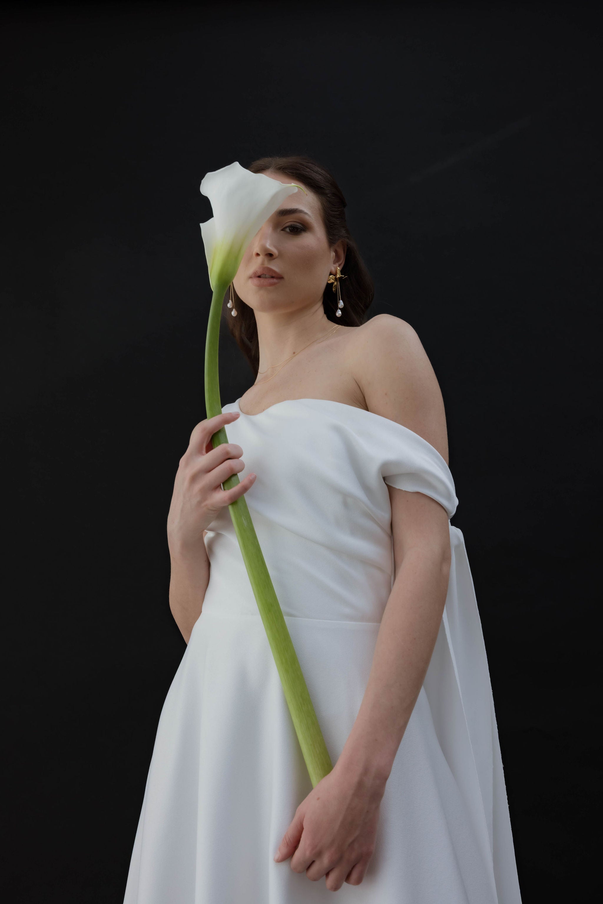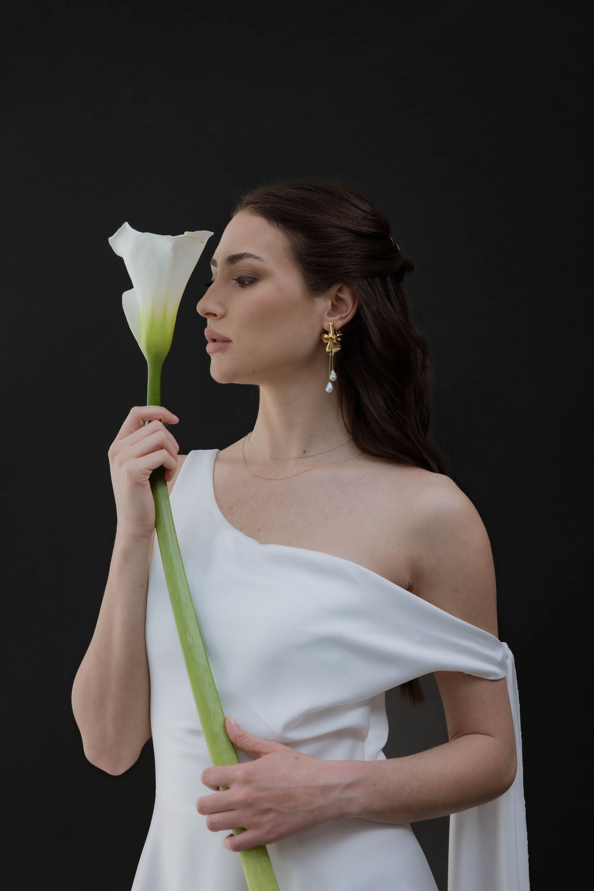 We wanted to capture the beauty of a flower in motion , light and alive, to create the Amore earrings : an iconic piece, full of grace and singularity , imagined for daring, romantic and modern brides.