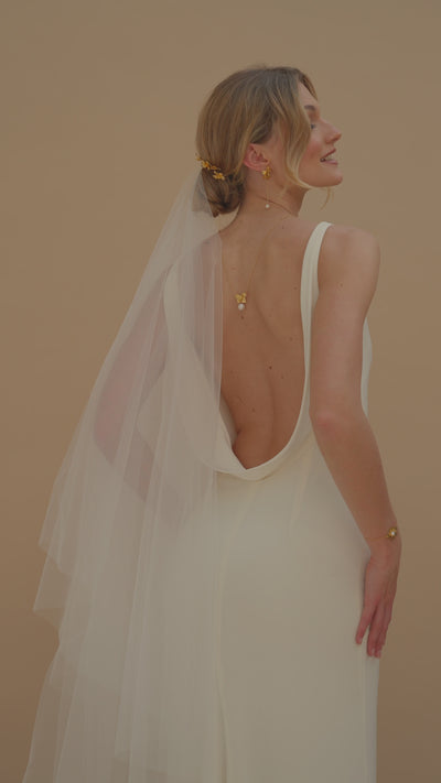 The light movement of the chain and the sparkle of the pearls bring an elegant presence without weighing down the face—perfect to complement a flowing, bohemian, or modern wedding dress.