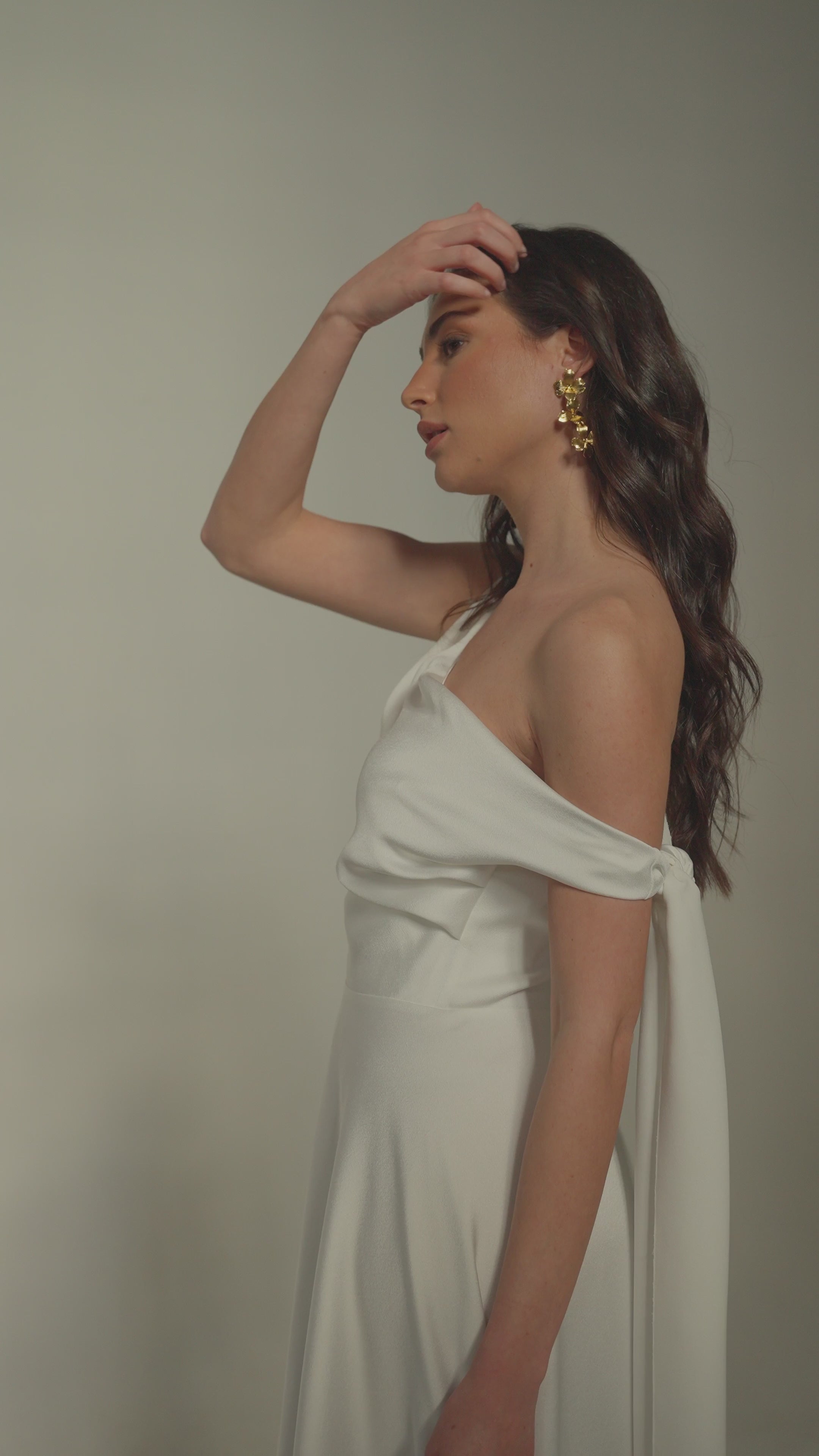 Mariée en jolie robe blanche fluide, cheveux lâchés avec de belles boucles d'oreilles longues florales, apportant une touche d'élégance et de romance à son look