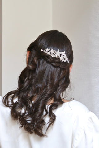 This hair comb or head jewel has been carefully made with sparkling silver-colored metal stars of different sizes. Each star has crystals (rhinestones) encrusted which gives a shiny and elegant touch.
