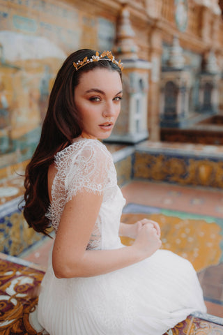 Empress is a crown intended to sublimate the bride on the most beautiful day of her life. This head jewel with floral, romantic and bohemian charm will attract all eyes and make the bride feel unique, feminine and sophisticated.