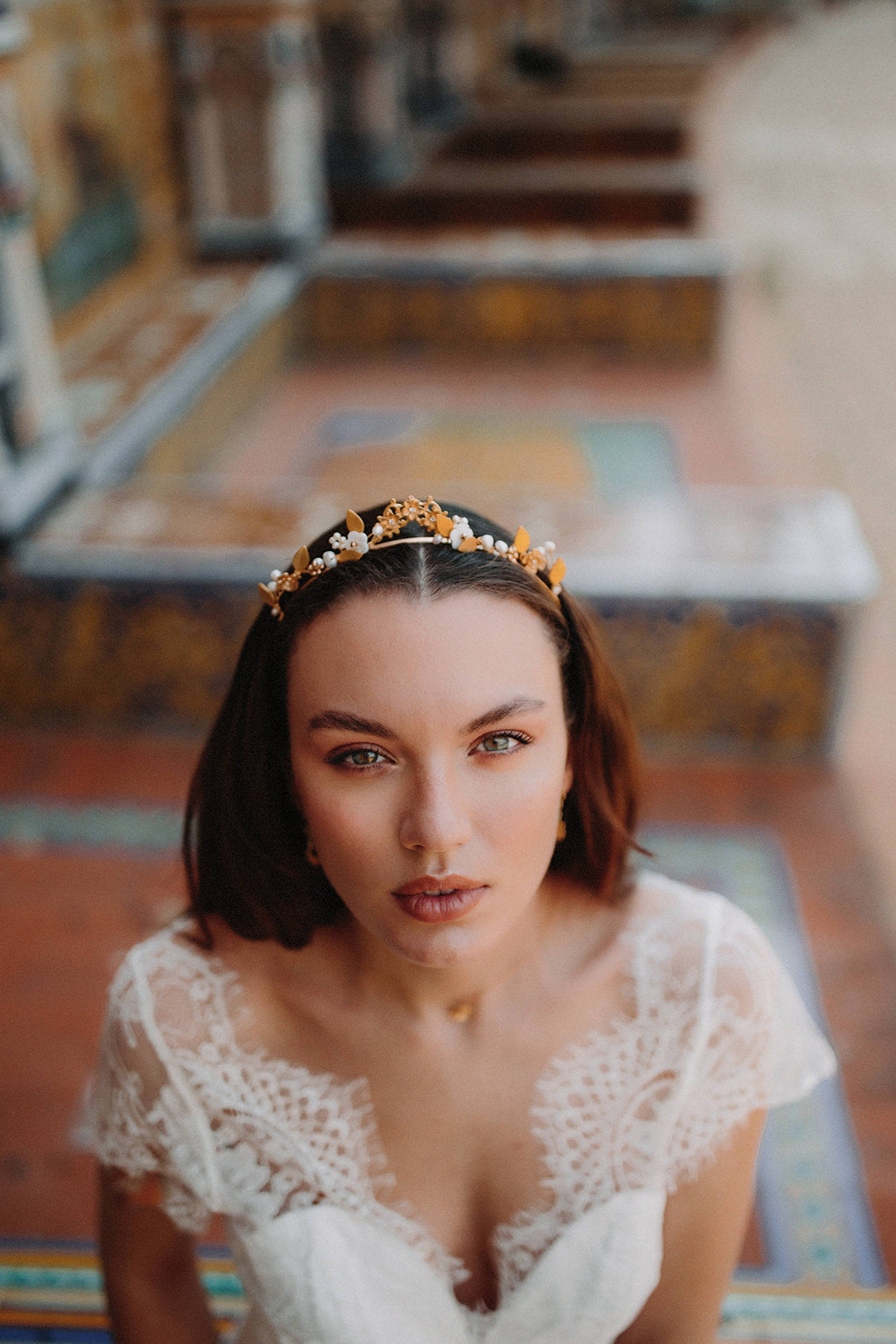 This floral wreath is made in our workshop with love and passion. It is delicately crafted with golden flowers, leaves, natural pearls, mother-of-pearl flowers and connectors. The result is a delicate, romantic and feminine floral crown.