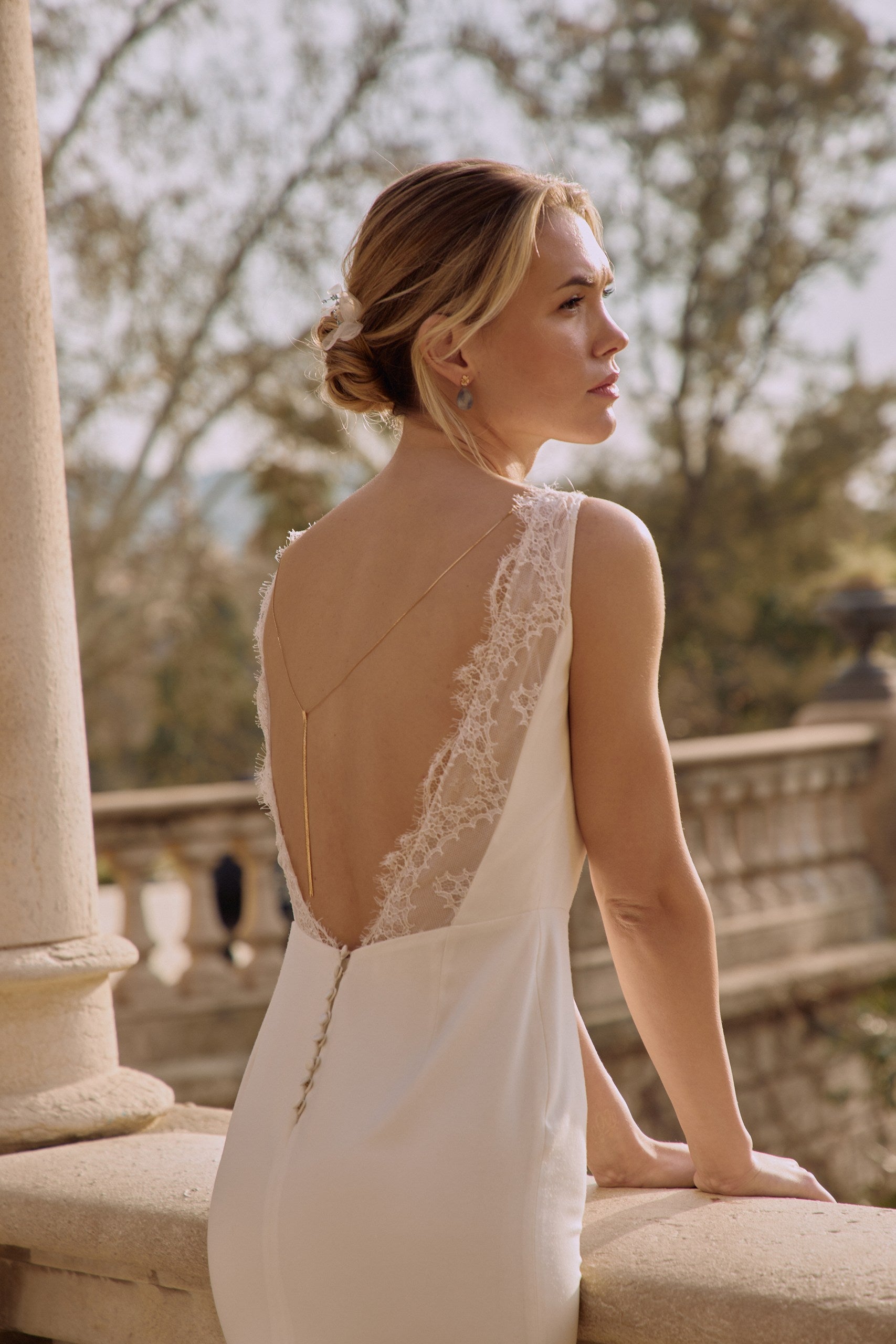 Jeune femme de dos montrant une robe à décolleter de dos avec un collier de dos minimaliste et un peigne en forme de nuage fait de perles naturelles