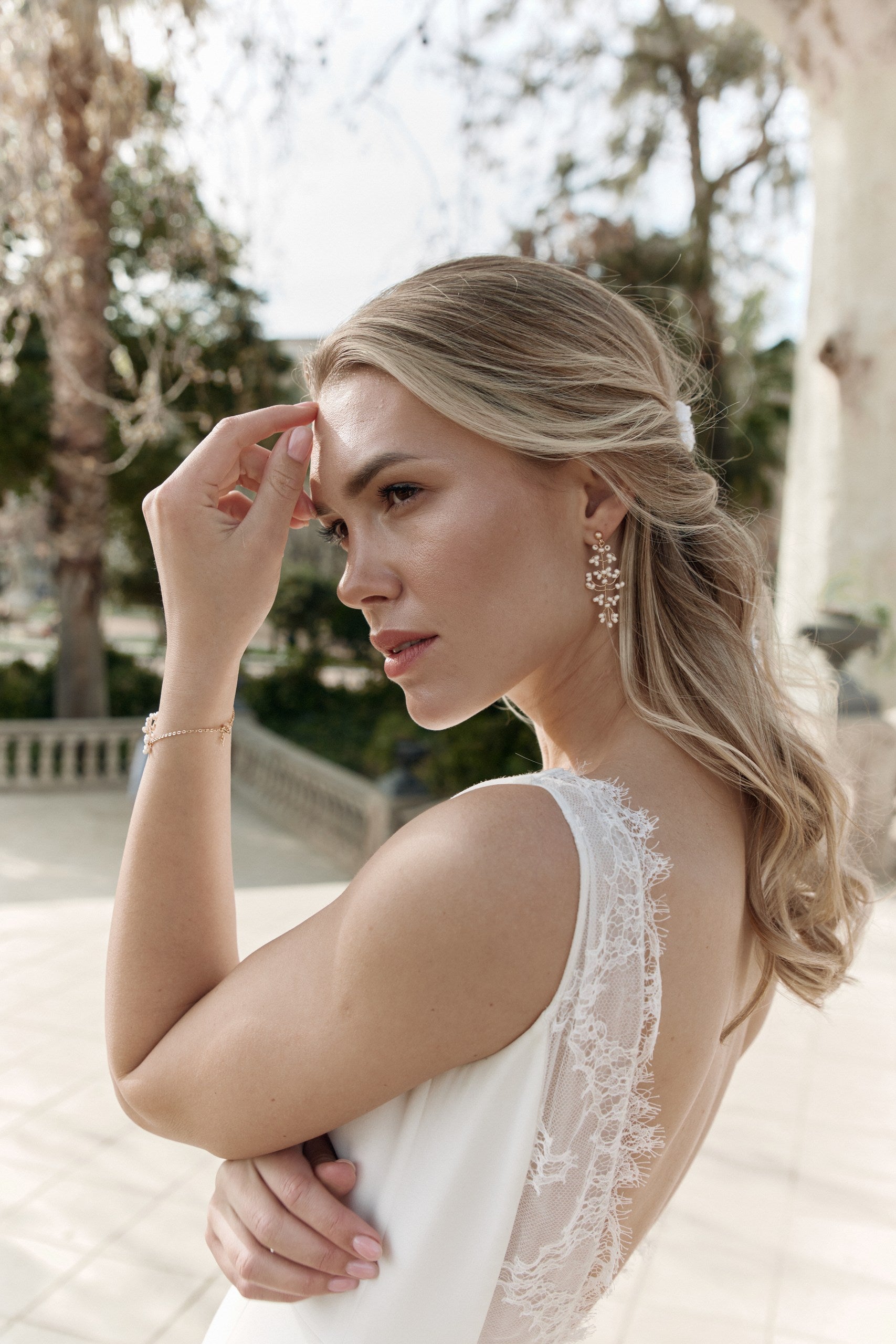 Jeune femme qui regarde sur le côté les bras croisés avec ses cheveux lachés mettant en avant ses boucles d'oreilles pendantes pour le mariage