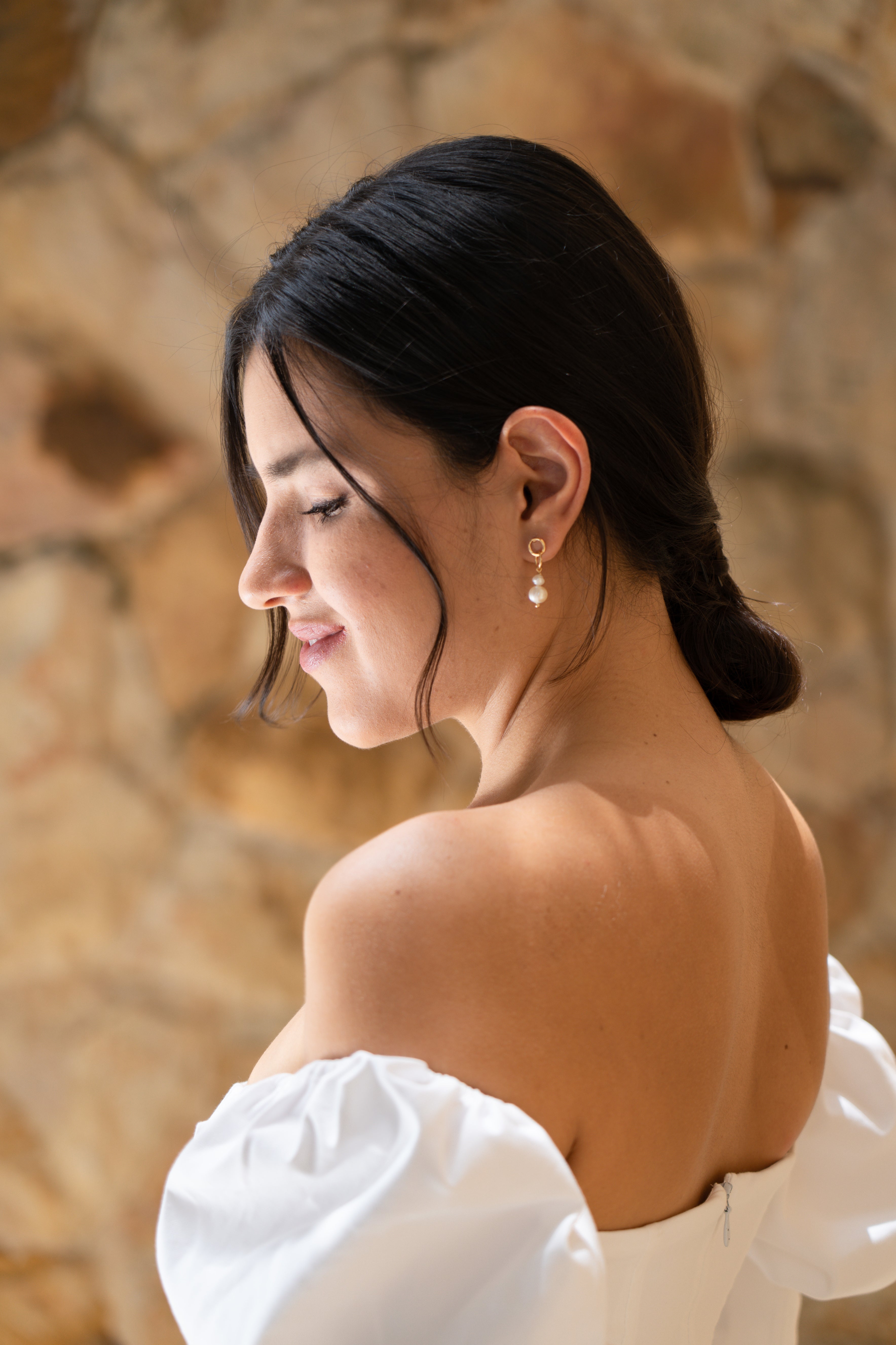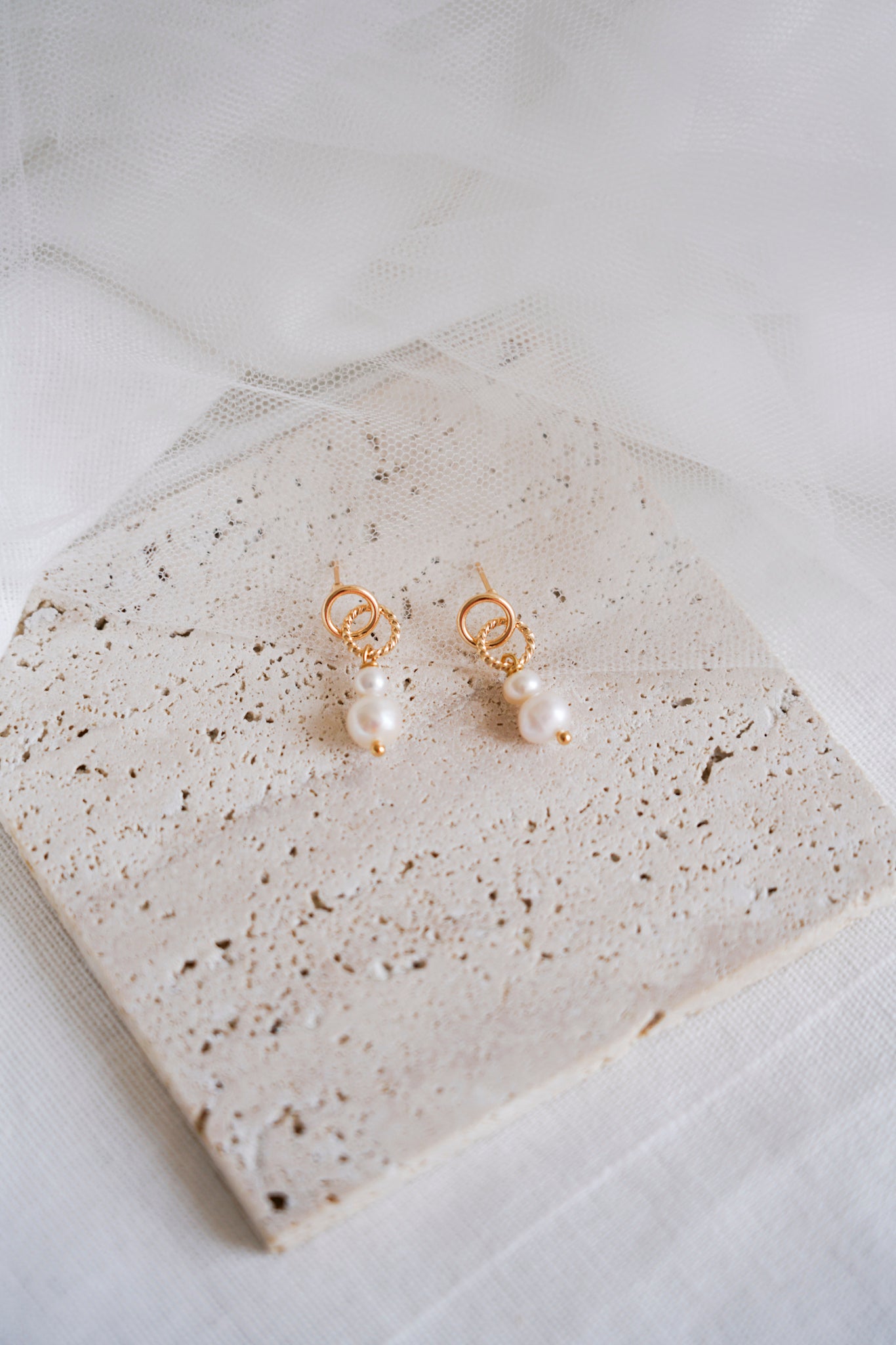These magnificent dangling earrings were made with two small, thin and delicate intertwined rings. These pieces are made of metal and then covered with a bath of 24k gold. From the last ring hang two natural freshwater pearls.