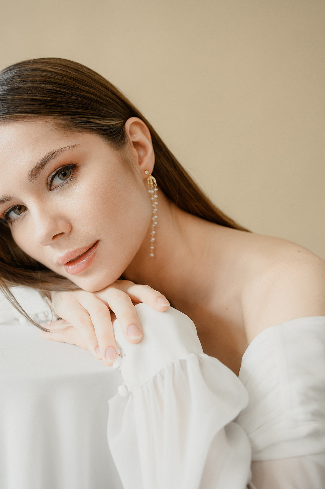 femme portant des boucles d'oreilles en chaines perlées et tenant son visage dans sa main