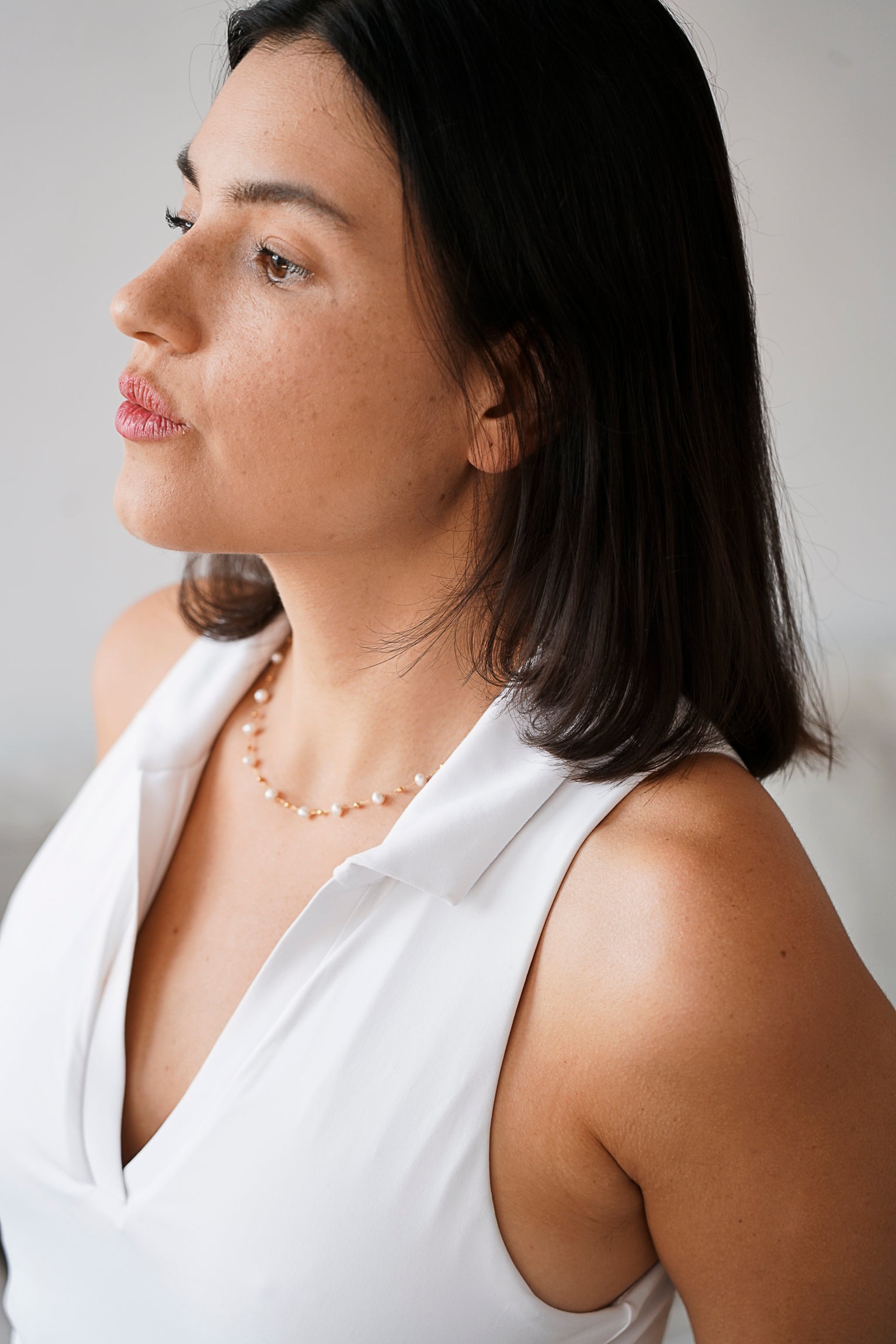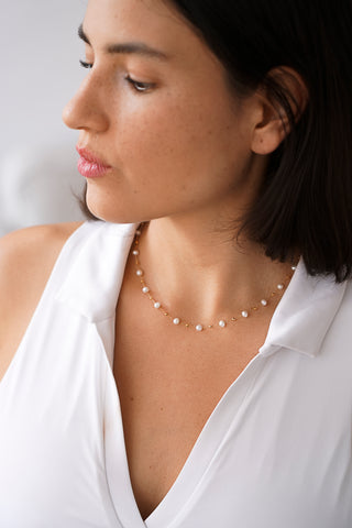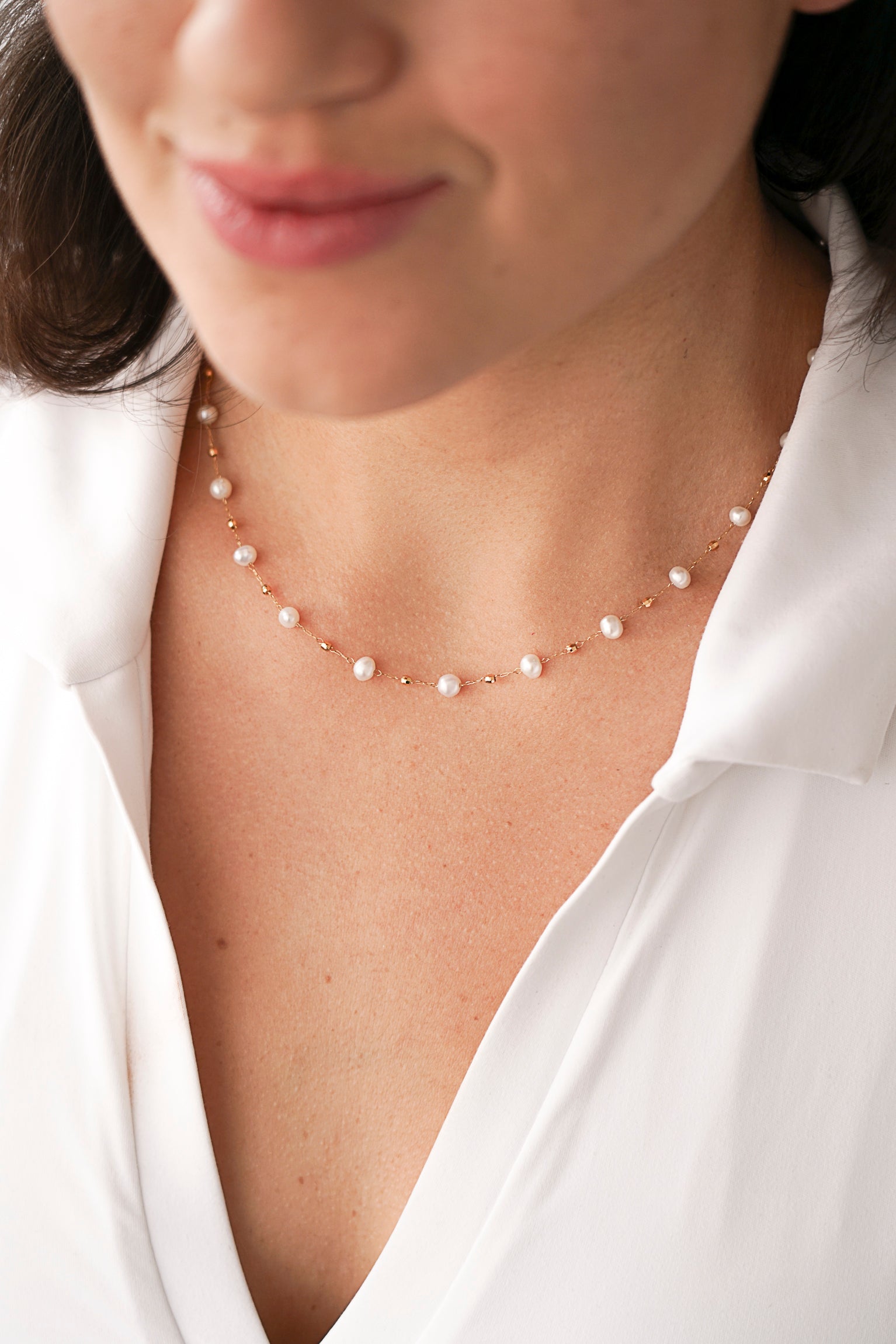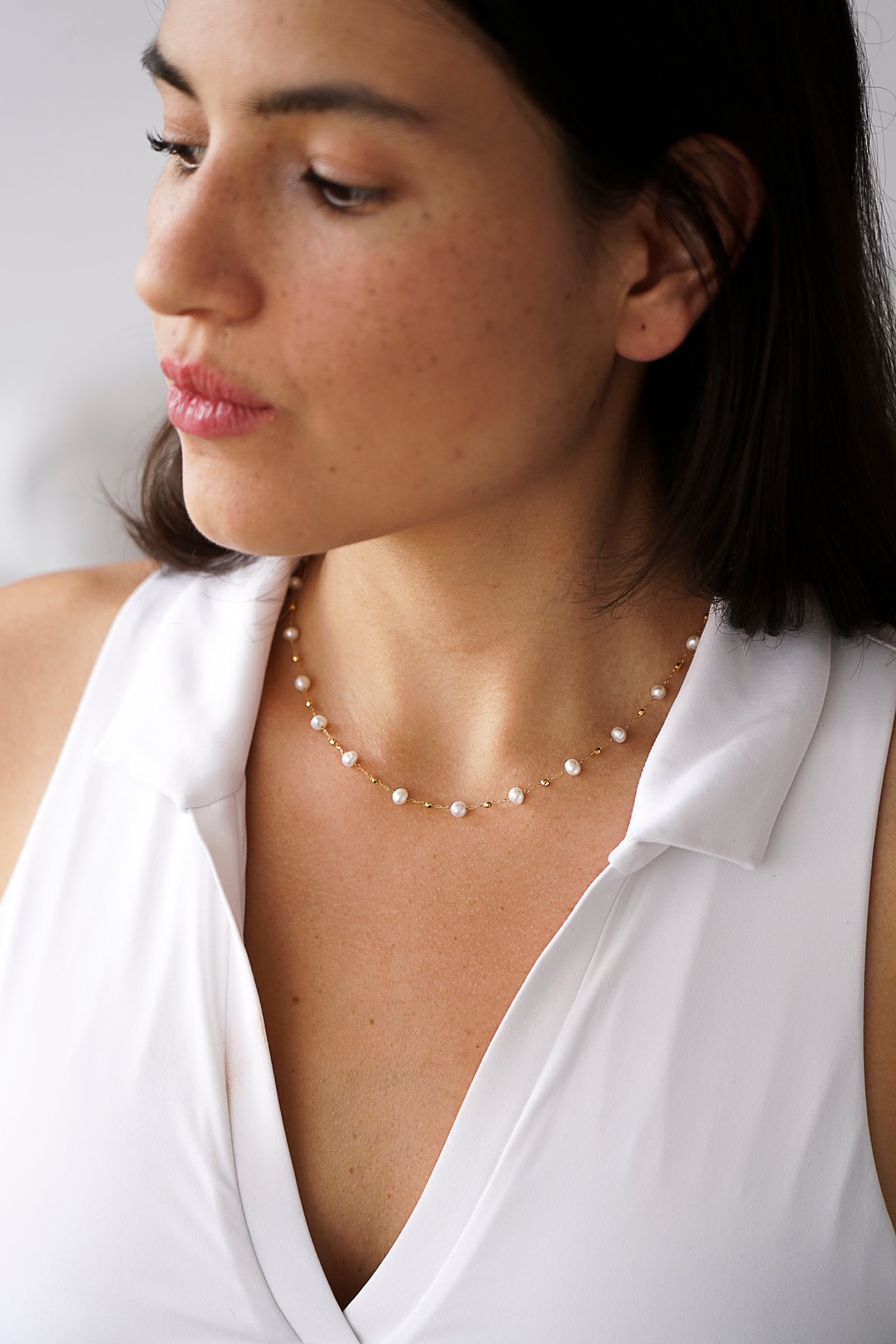 This magnificent necklace made from freshwater pearls and small faceted beads is the perfect piece of jewelry to accompany you every day. Being discreet and refined, it will add a touch of elegance and modernity to all your outfits.