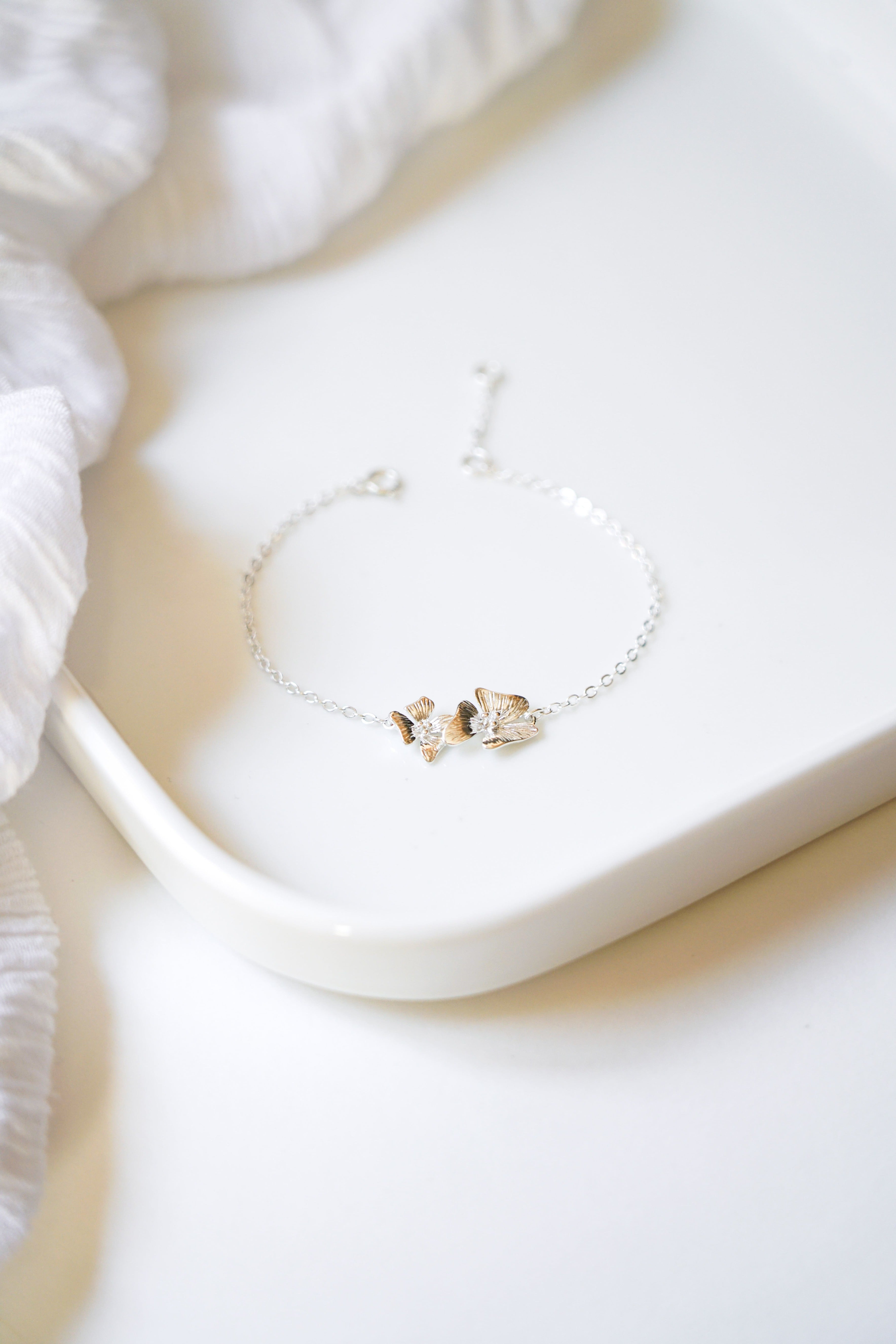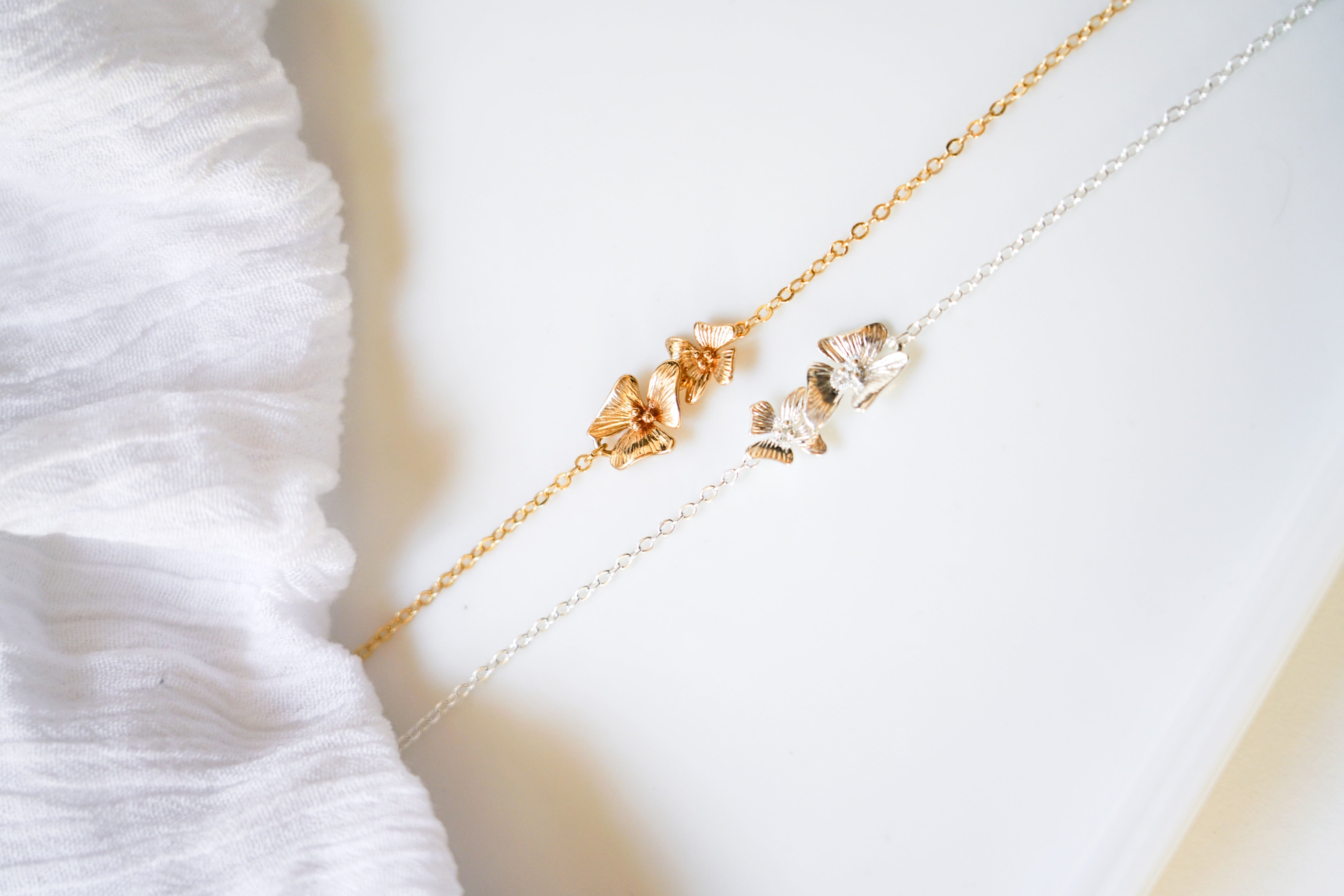 This jewel is made with very thin and delicate 24k gold or 925 silver plated chains. In the middle of the bracelet two pretty flowers add a romantic floral touch. Two colors are available, gold and silver.