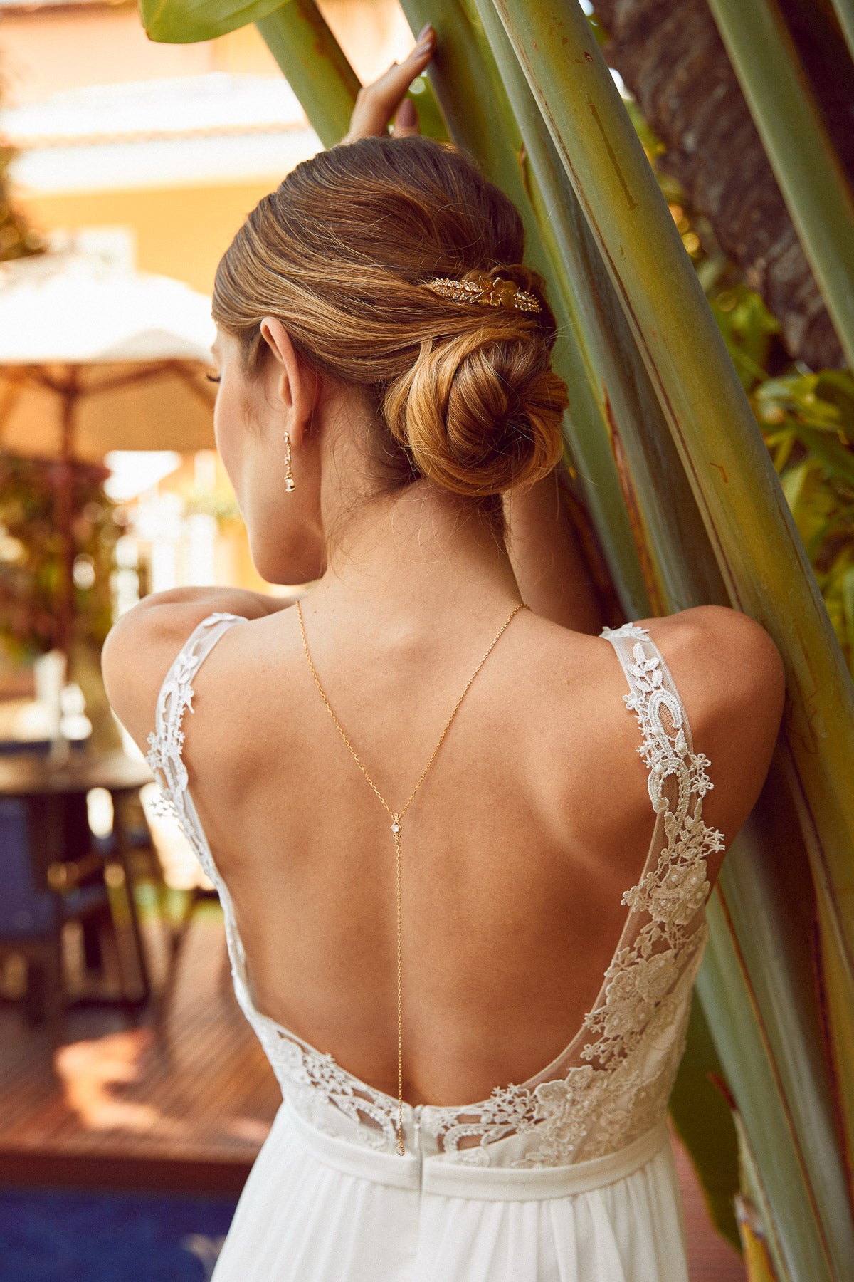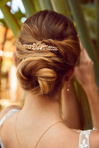 Peigne à cheveux de mariage doré fleuri porté sur un chignon de mariage bohème