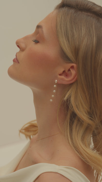 Purity and refinement intertwine in the GIORGIO earrings, designed for modern brides who love precious simplicity. A vertical line of natural pearls stretches lightly along the neck, creating a slender and luminous silhouette.