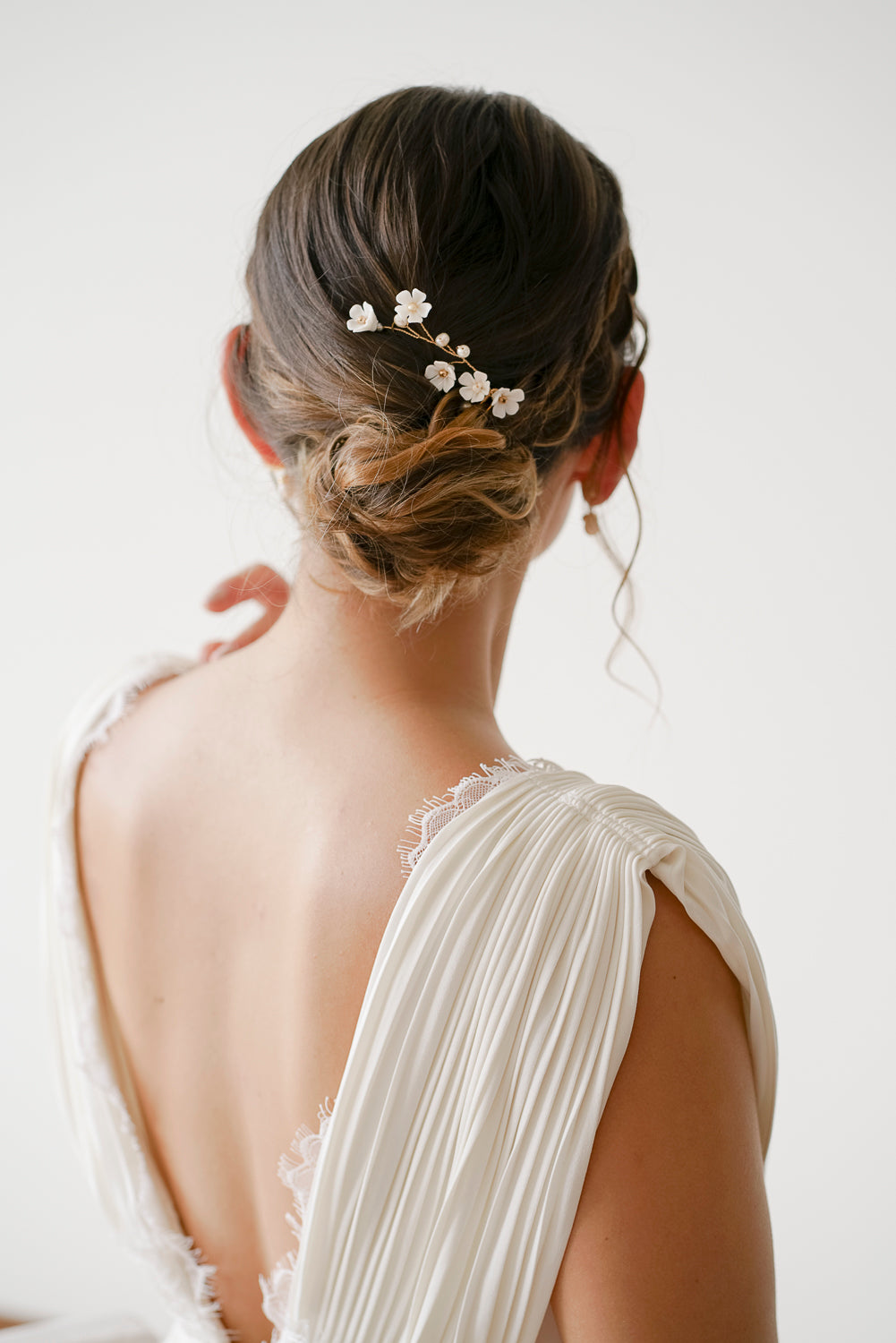 These pretty hair accessories are handmade by our designers. They are made with flowers modeled by hand in white clay. This hair jewel is malleable, which will allow you to easily adapt it to the shape of your hairstyle.