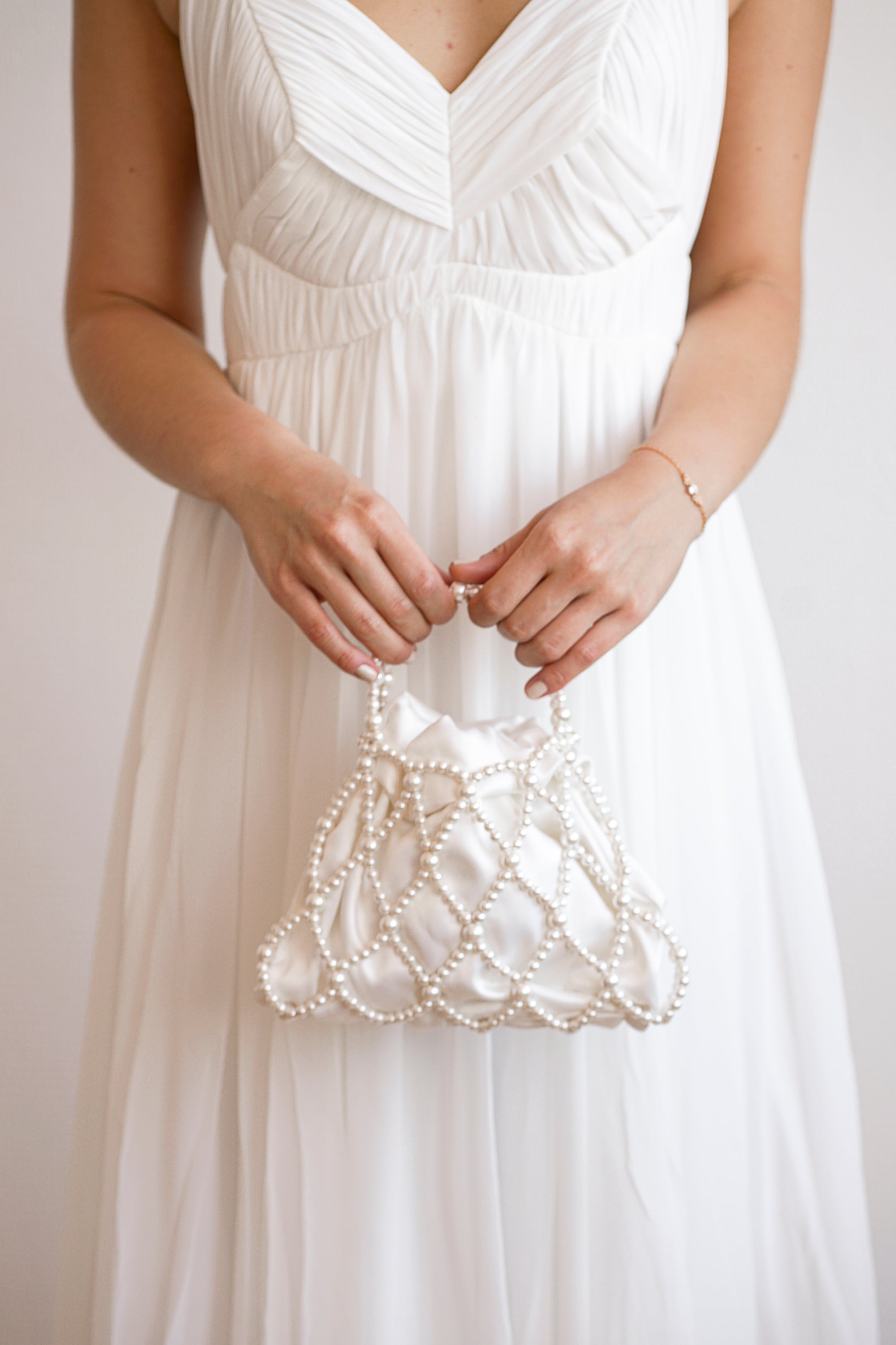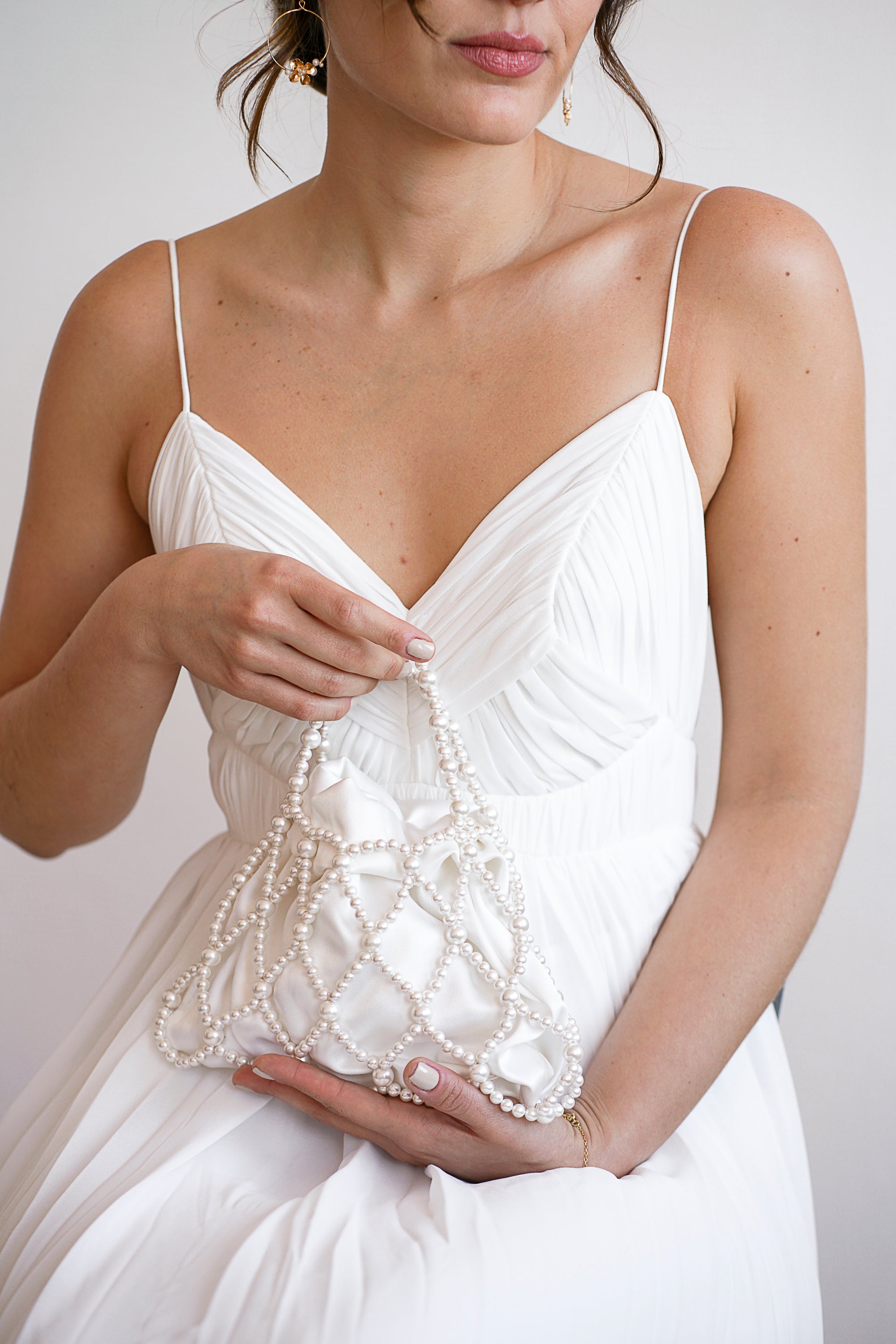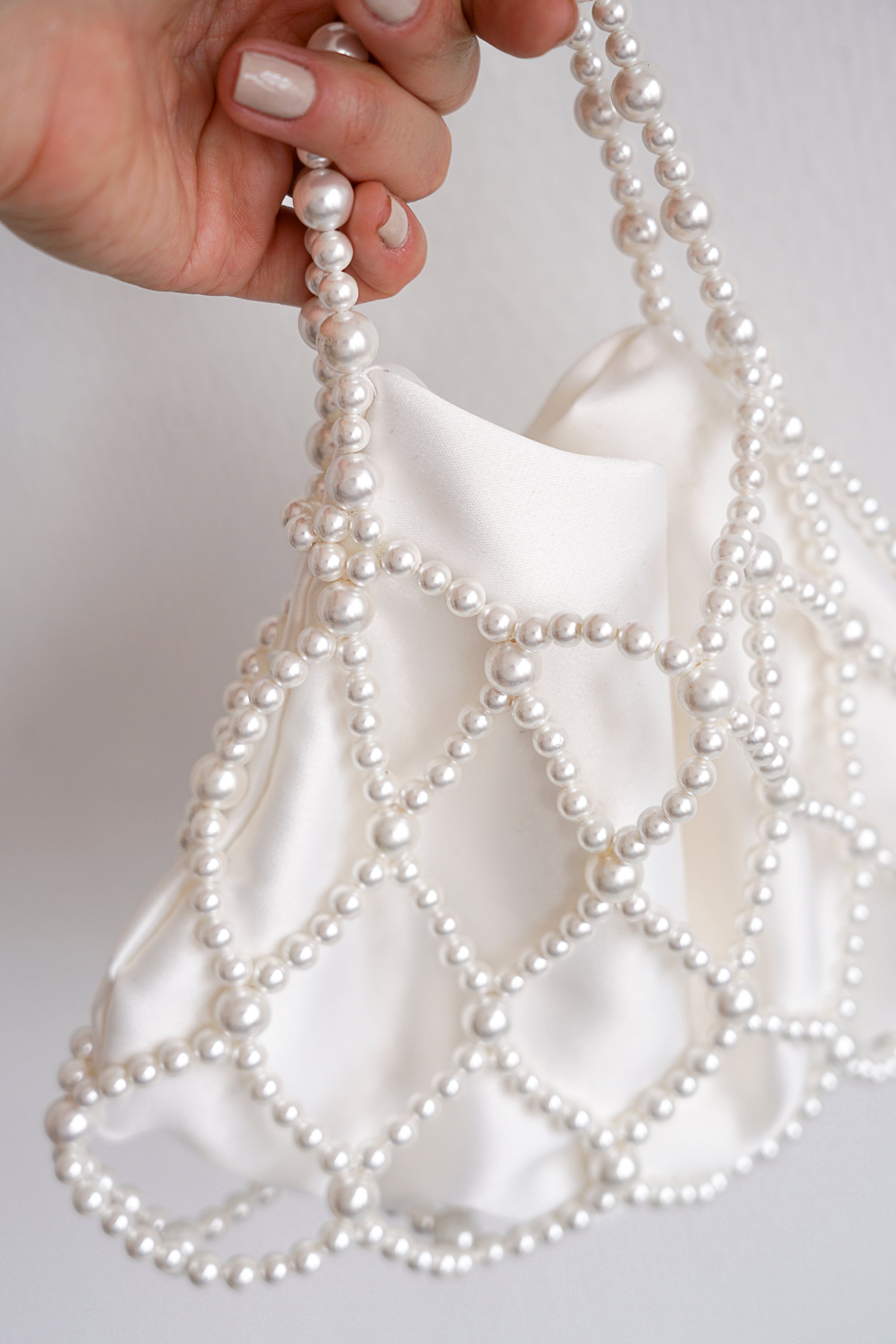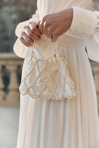 This pretty bohemian bridal bag is made of Shell Beads, forming a triangle, and a white fabric to carry all your essentials on your most beautiful day.