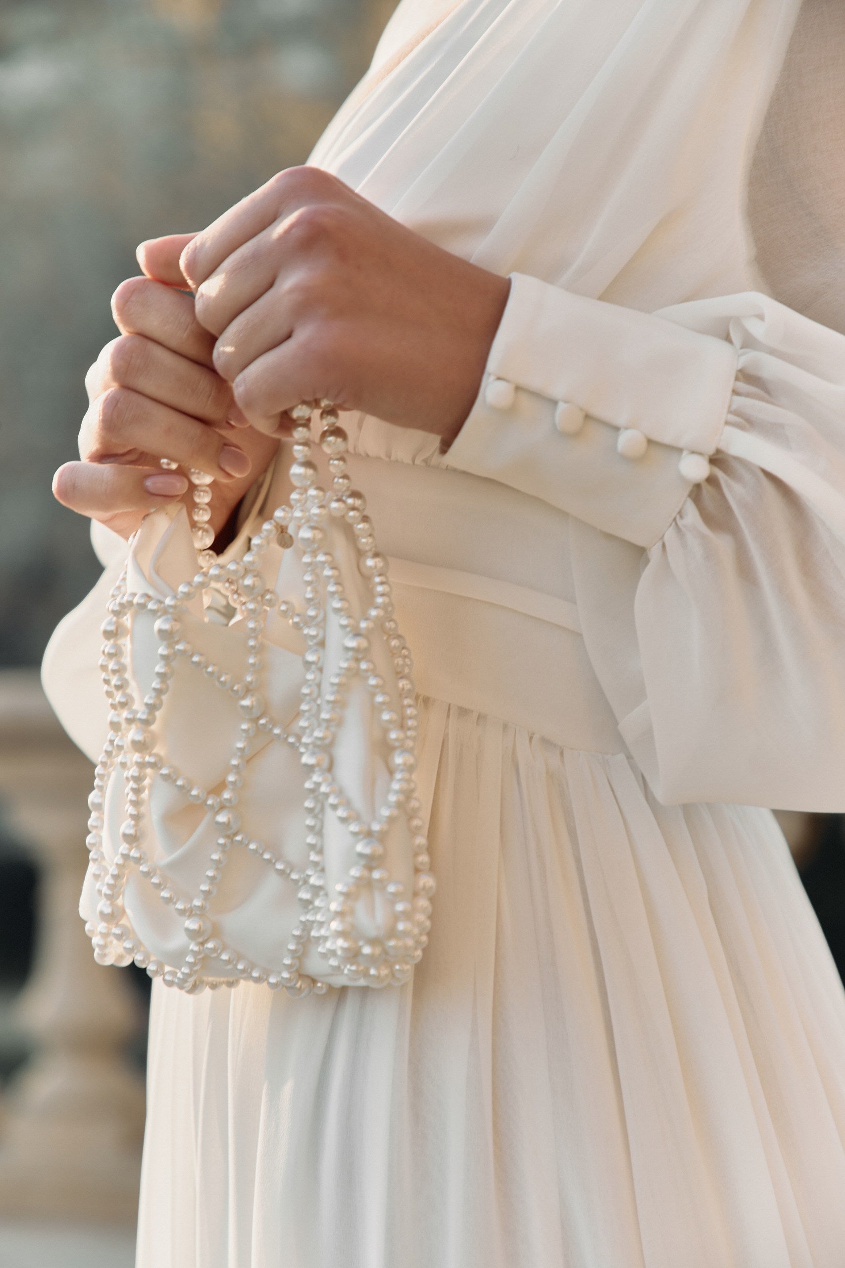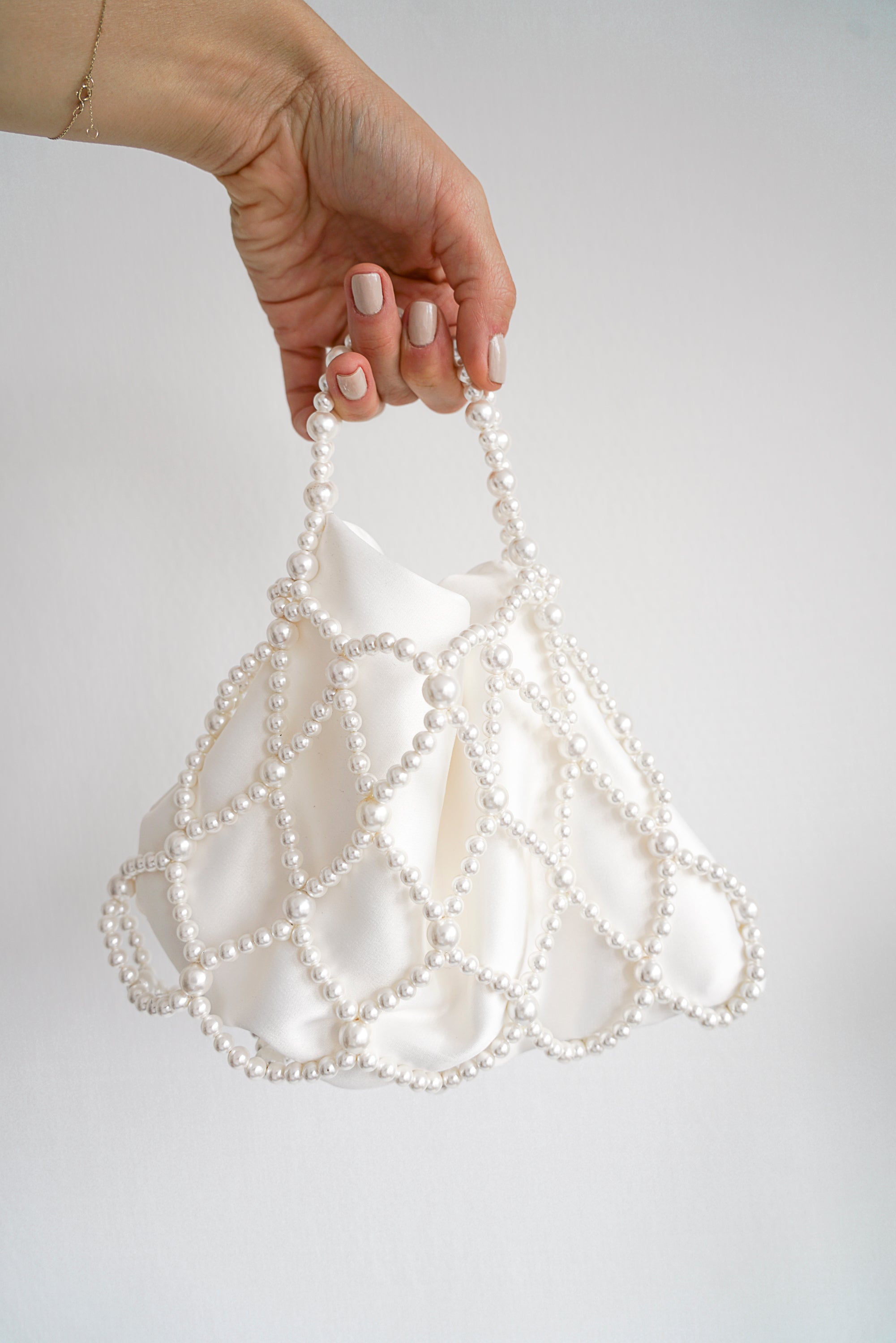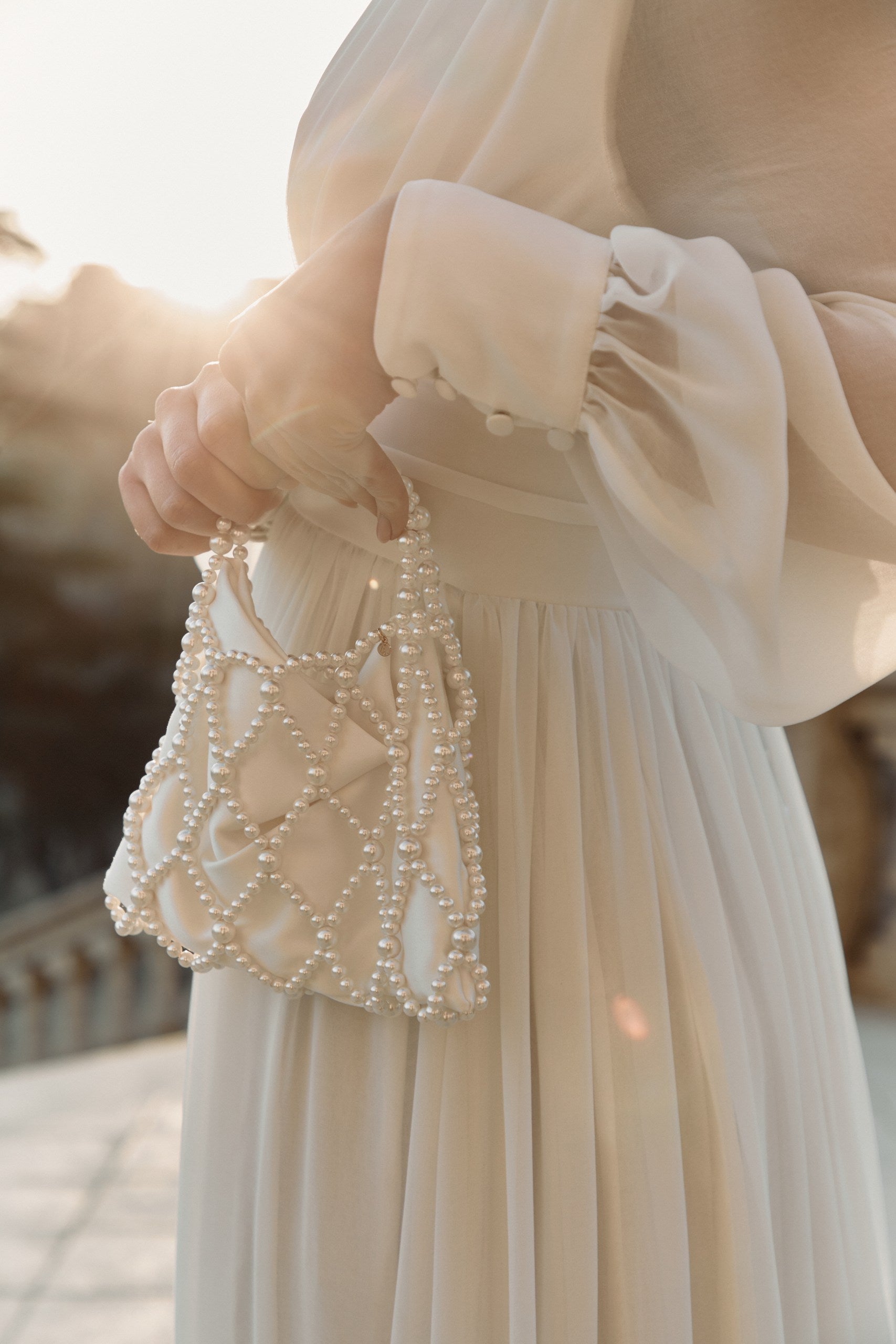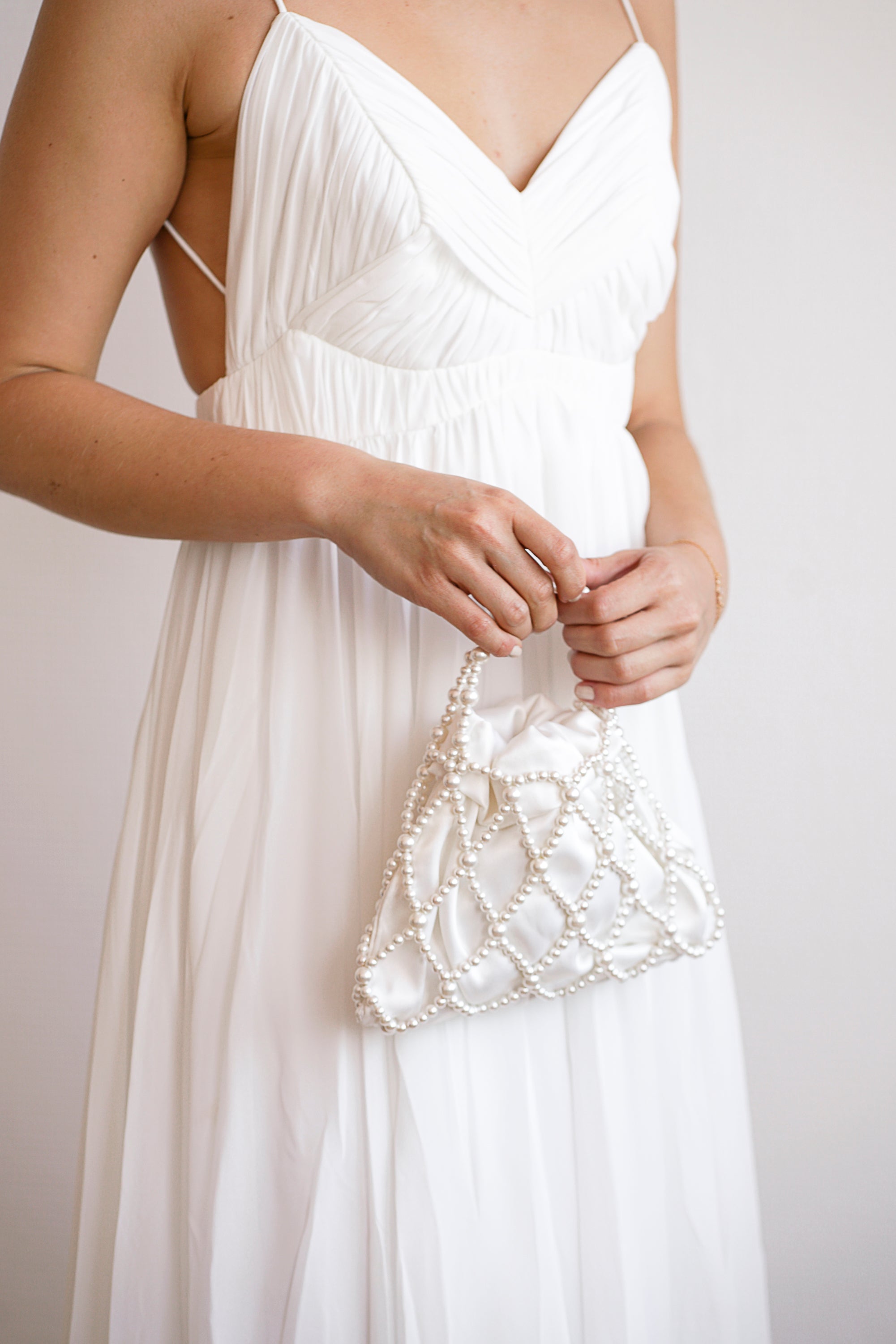 This pretty bohemian bridal bag is made of Shell Beads, forming a triangle, and a white fabric to carry all your essentials on your most beautiful day.
