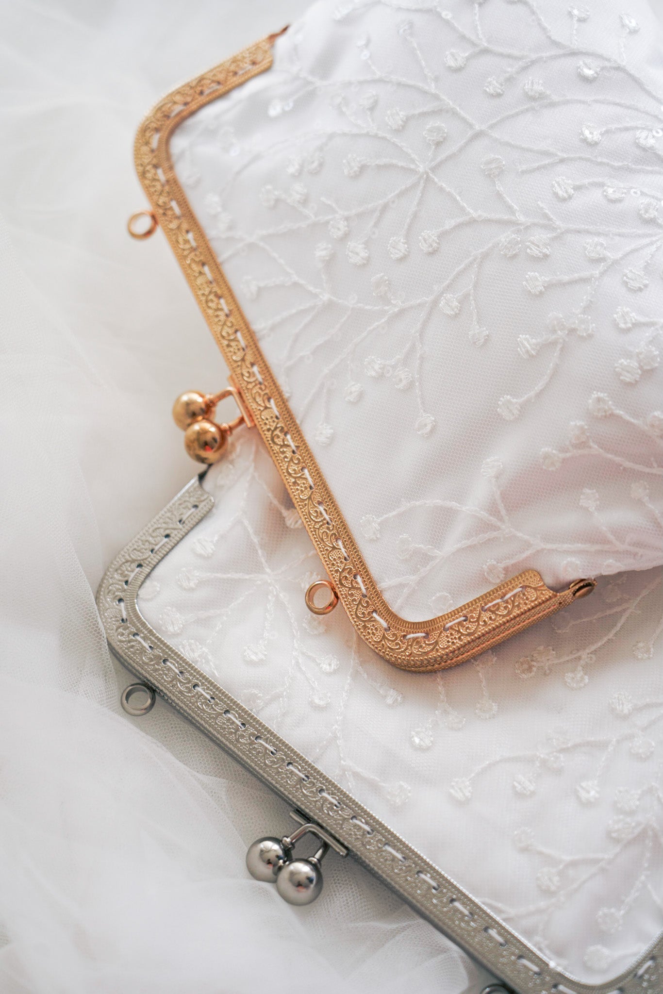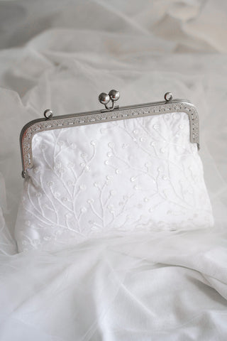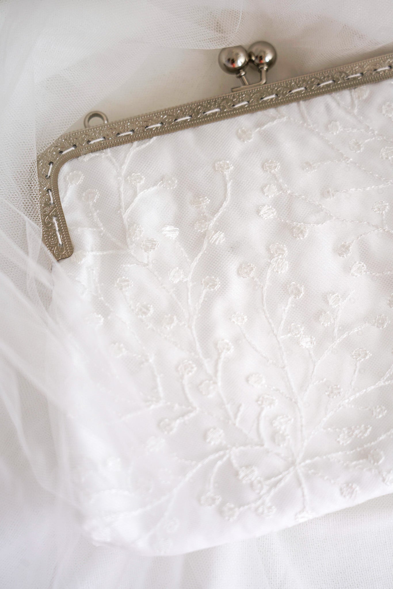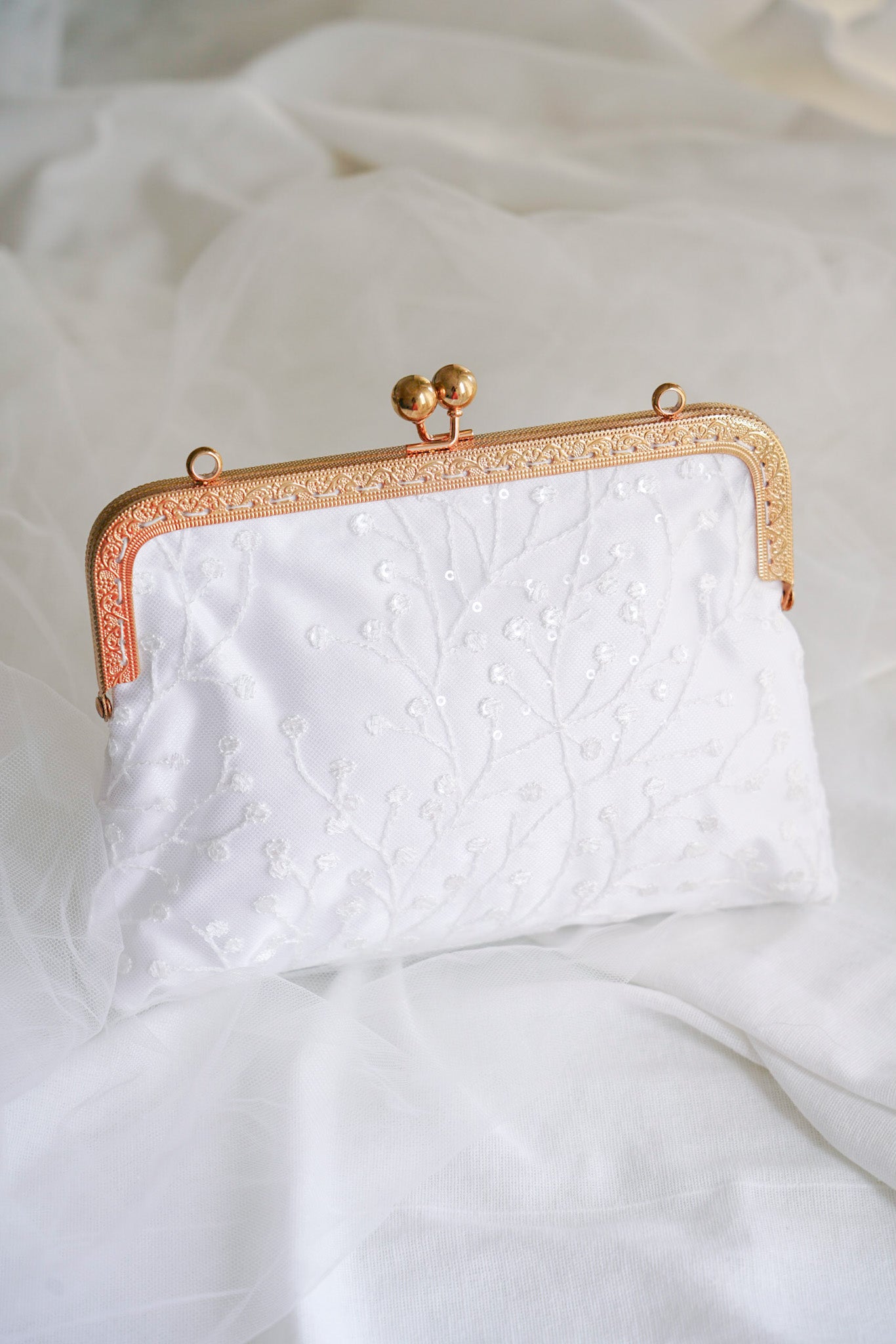 This beautiful, elegantly styled bridal bag is made with beautiful floral patterned lace adorned with small transparent and slightly shiny sequins. The lining and base of this bridal bag are made with 100% cotton fabrics. Its magnificent white interior brings charm.