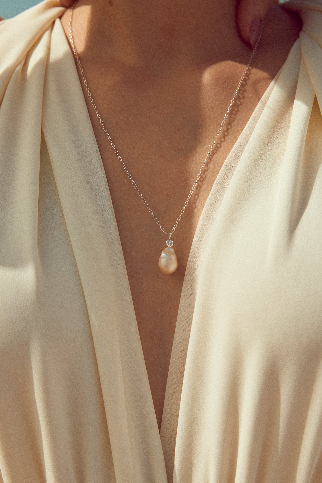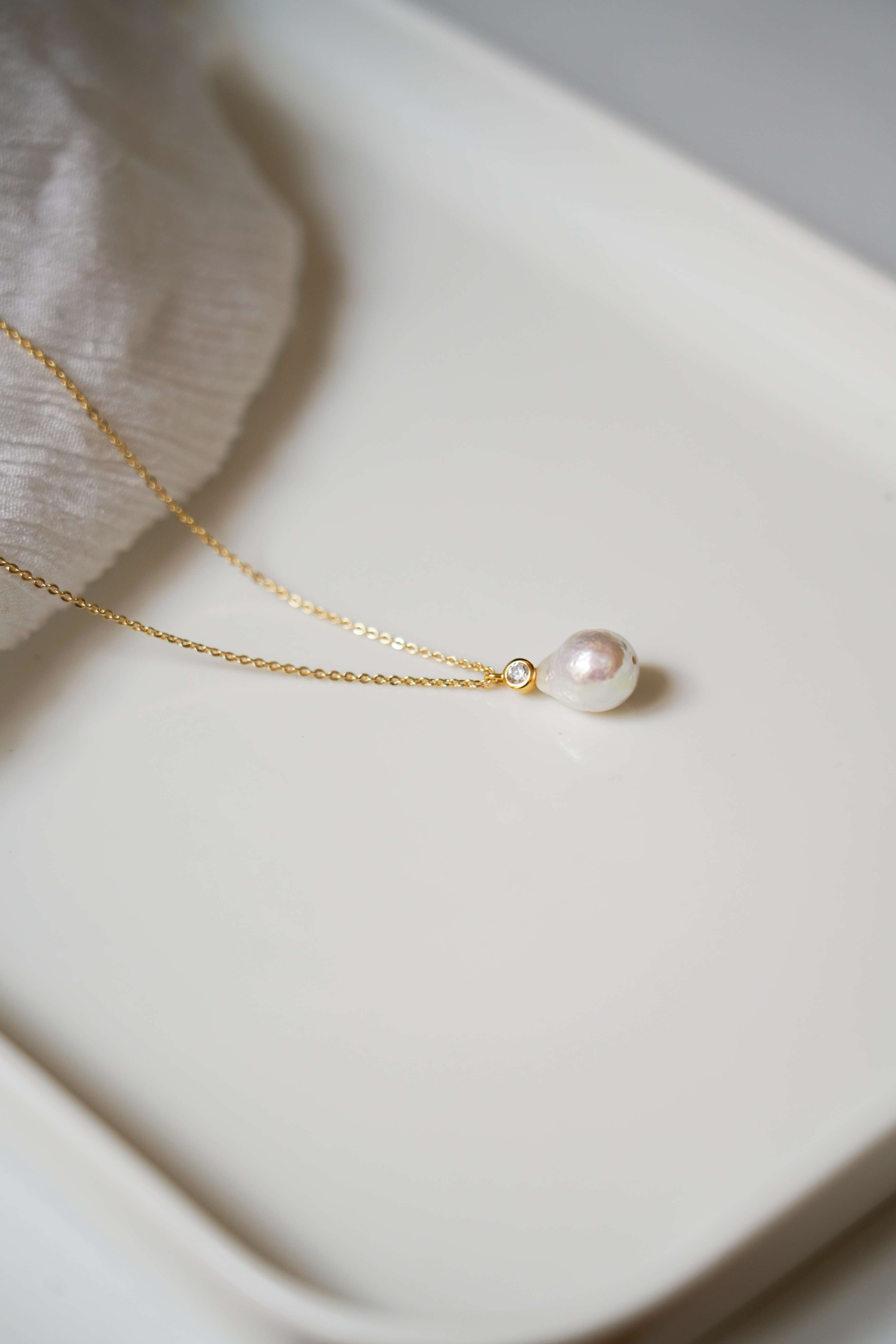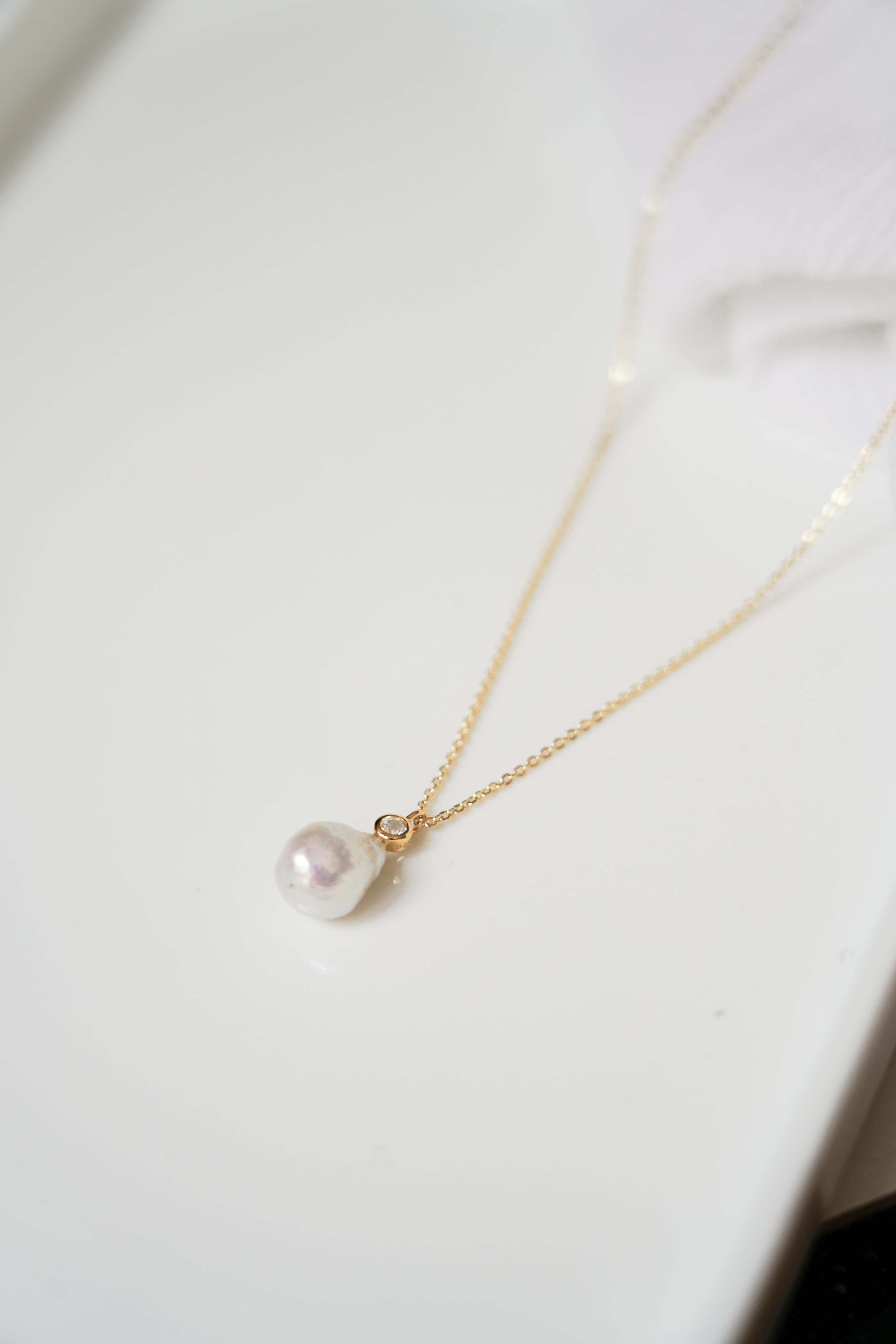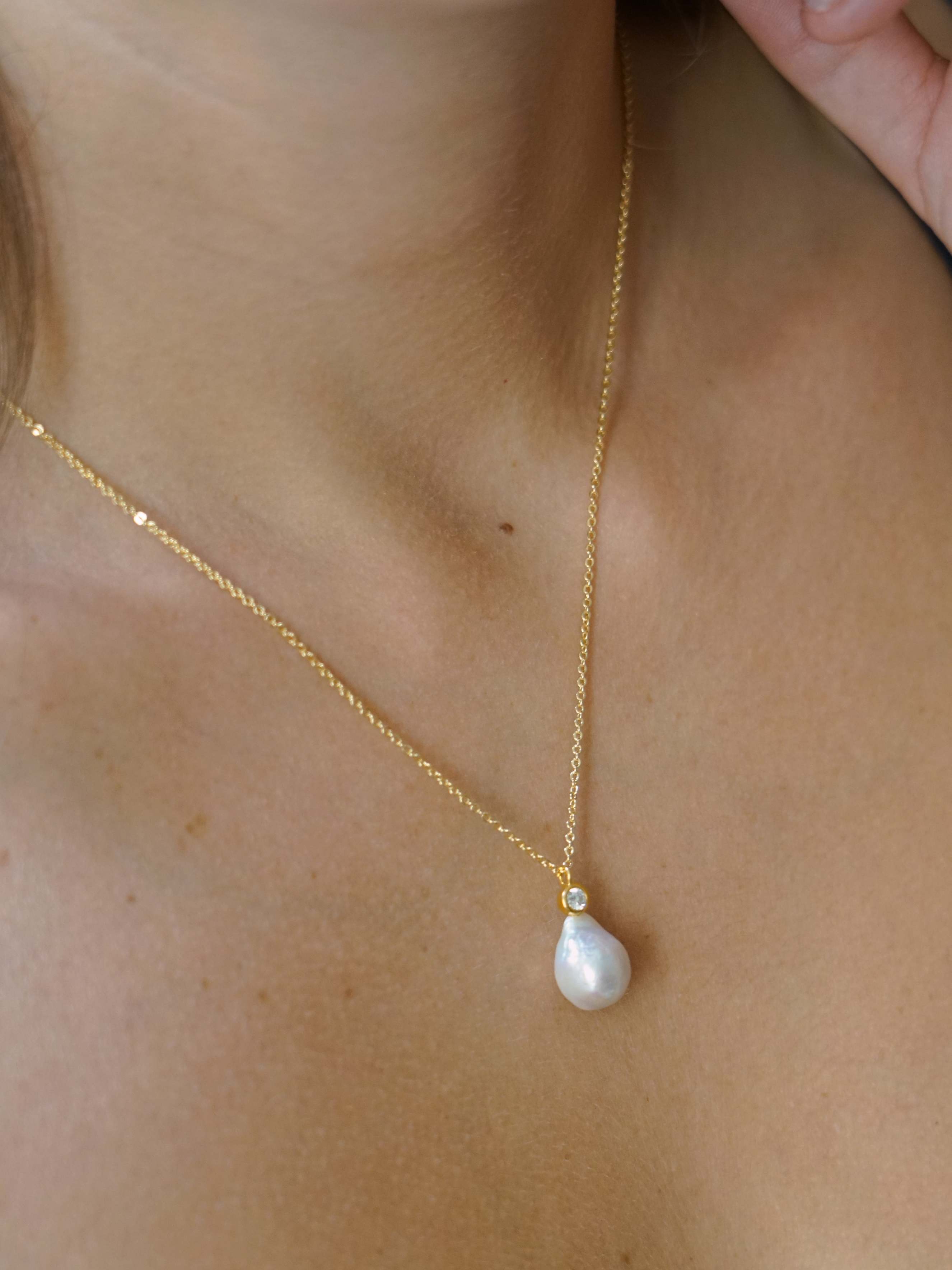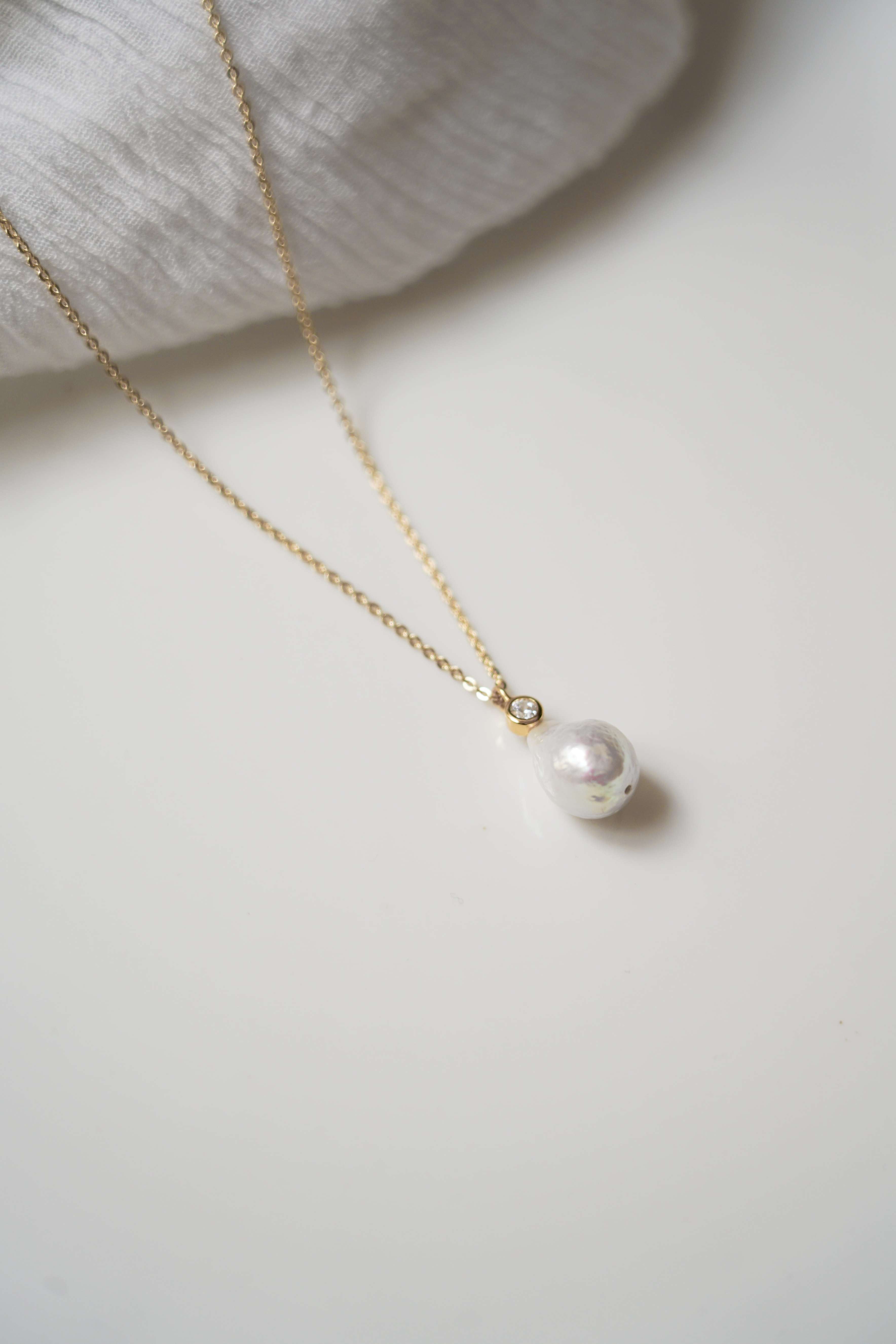This pretty necklace, simple and elegant, is composed of a fine and delicate chain plated in 24k gold, from which hangs a small zircon adorned with a natural pearl with structure, raw pearl effect.