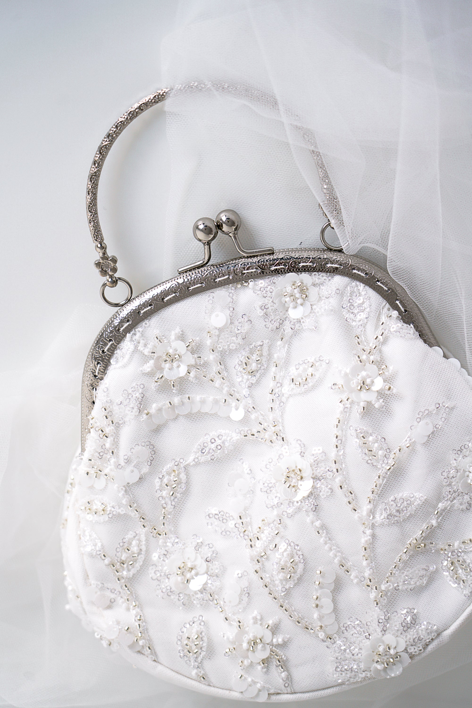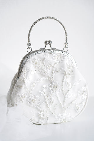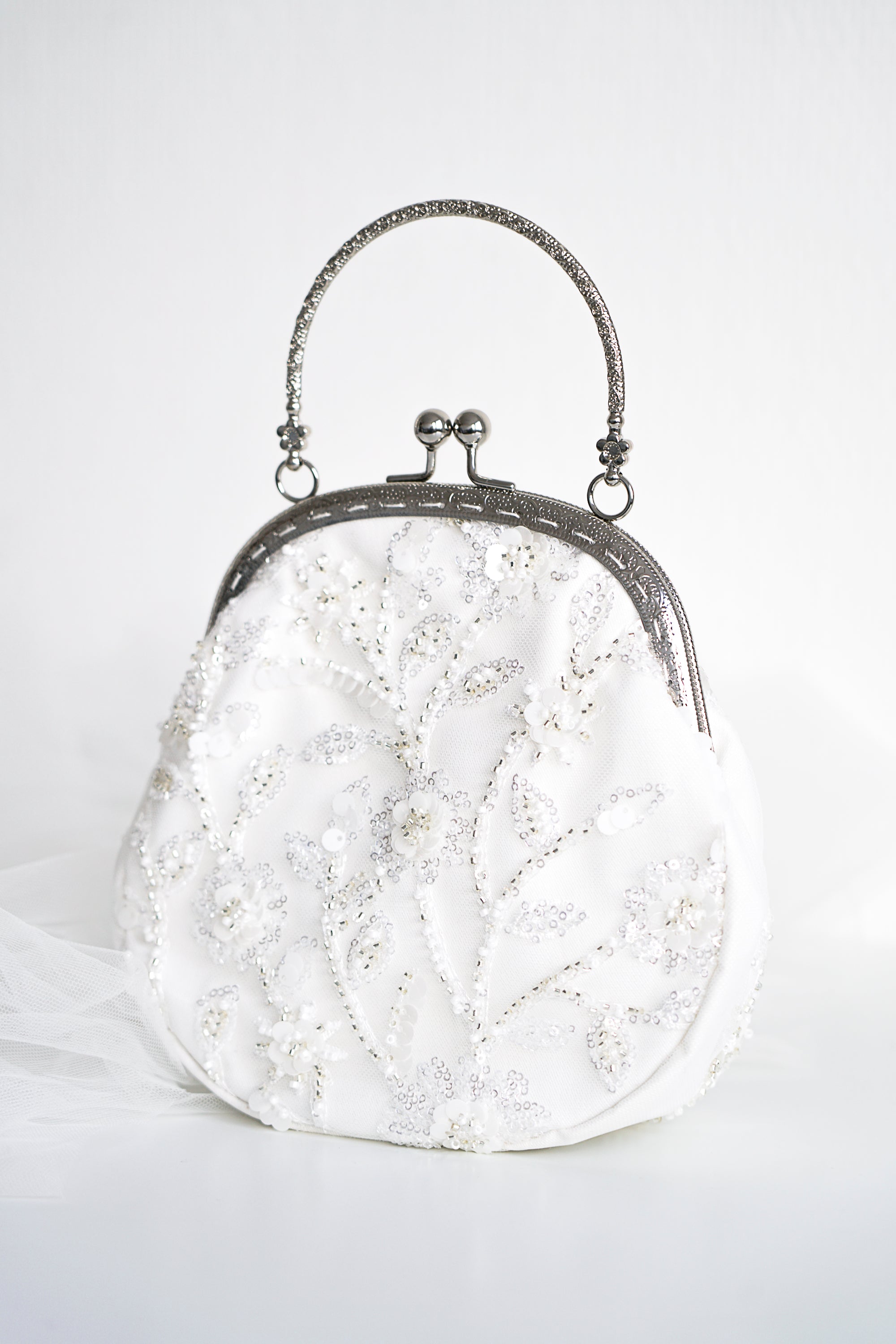 Ce magnifique sac ou pochette de mariée de style élégant et glamour est fabriqué avec une magnifique dentelle aux motifs floraux ornée de perles et sequins. La doublure et base de ce sac de mariée est faite avec des tissus 100% coton. Son magnifique intérieur bleu clair apporte du charme et ce "quelque chose de bleu".