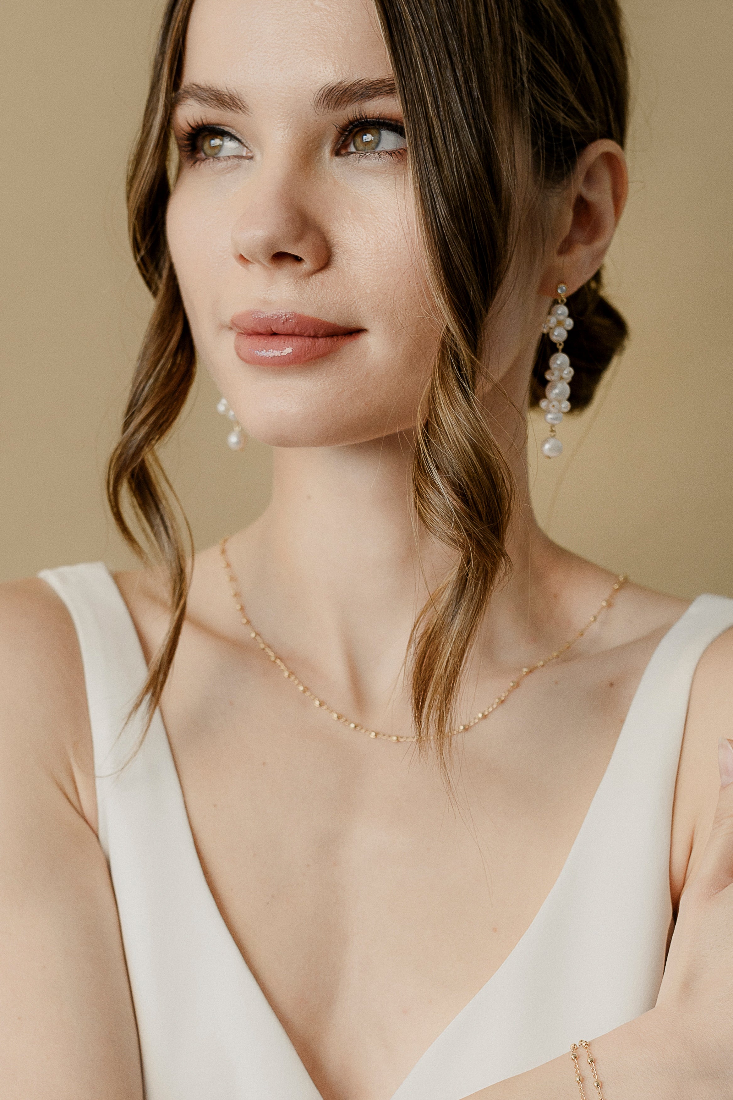 femme regardant vers la gauche, avec une coiffure de mariage et deux meches qui tombe sur son visage et des boucles d'oreilles en perles naturelles moderne