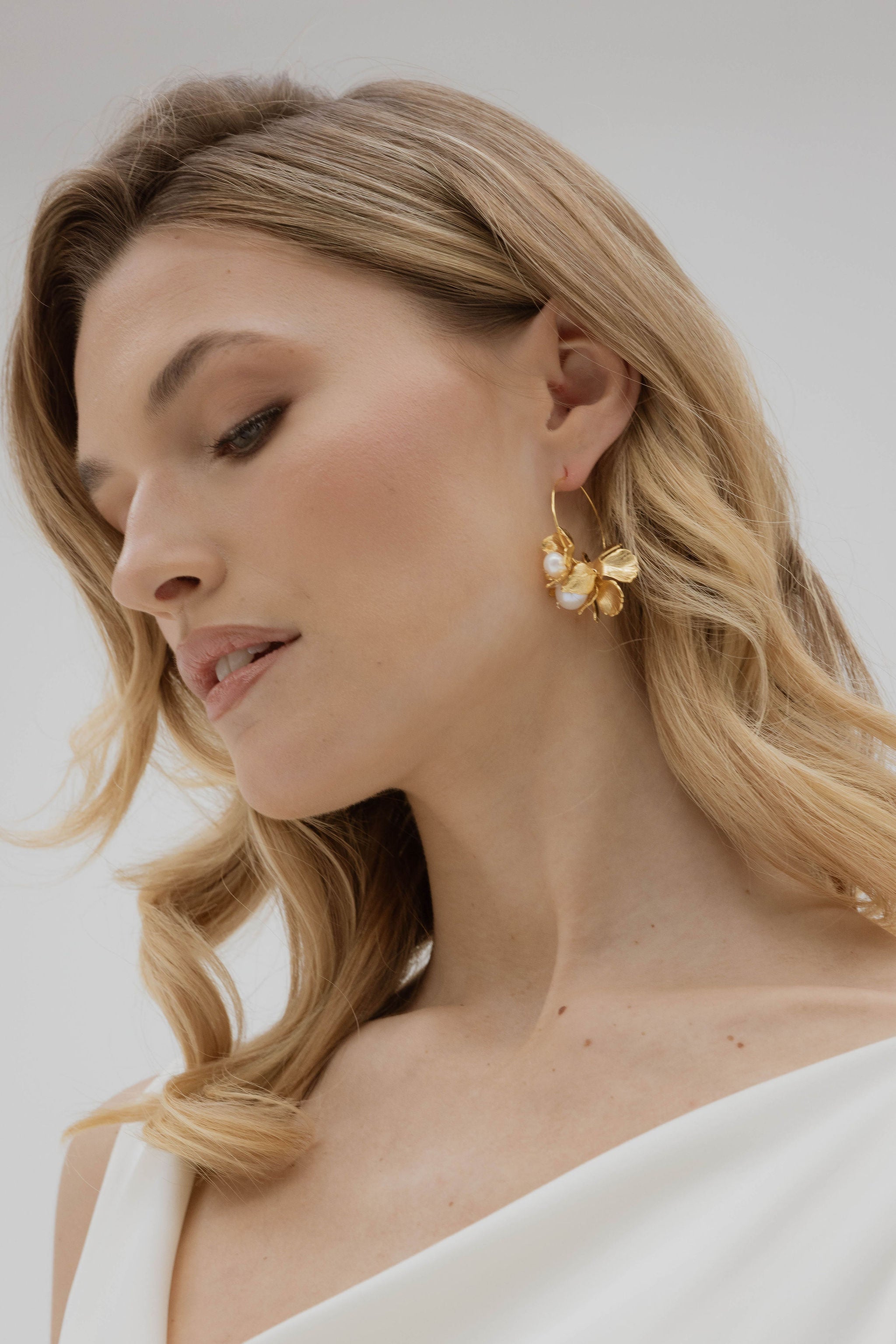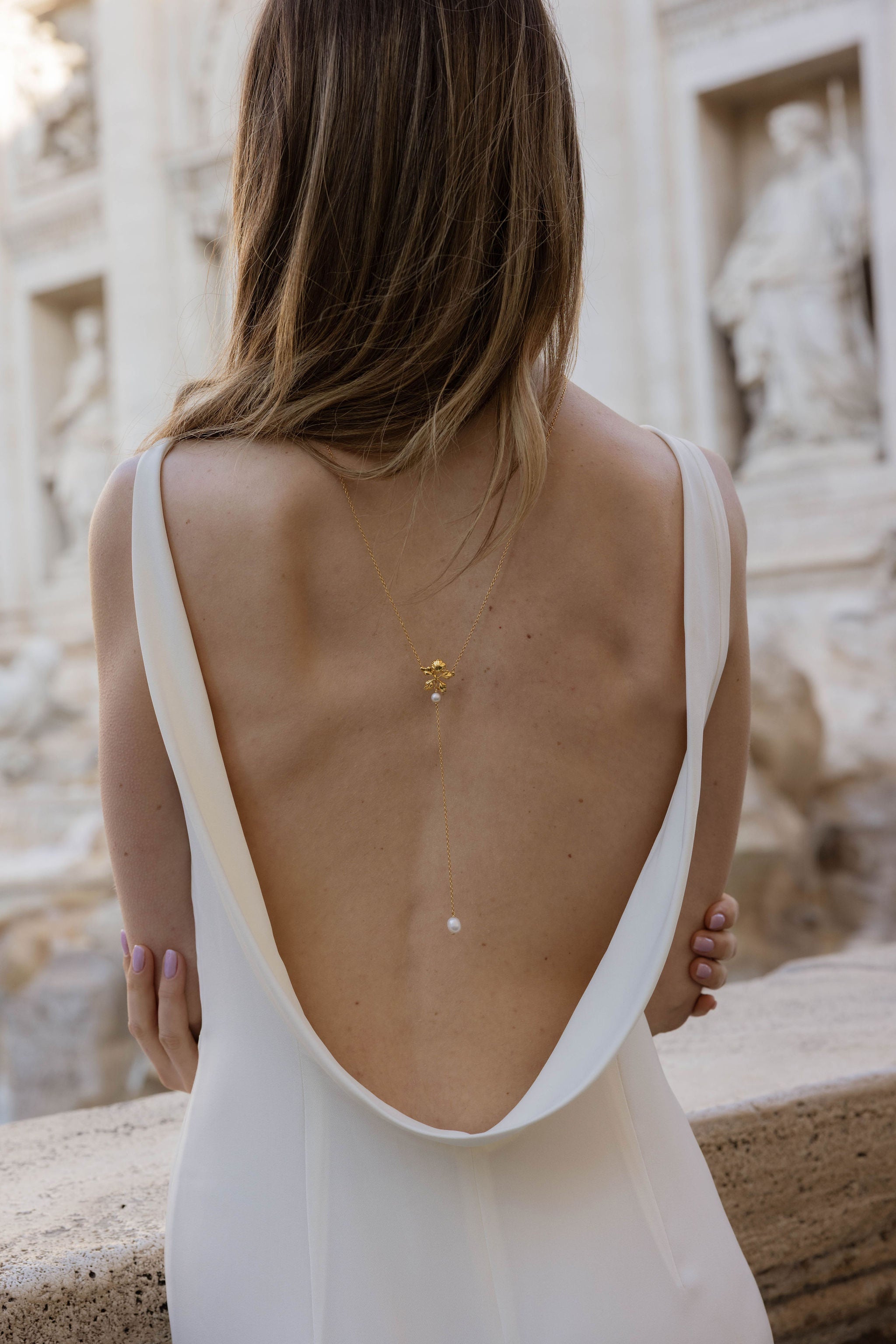 La parure Roma réunit des fleurs dorées, des perles naturelles de culture et une élégance discrète, déclinée en boucles d’oreilles, colliers de dos de différentes longueurs et bracelet. Chaque pièce s'harmonise parfaitement avec les autres, pensée pour sublimer votre silhouette avec grâce.
