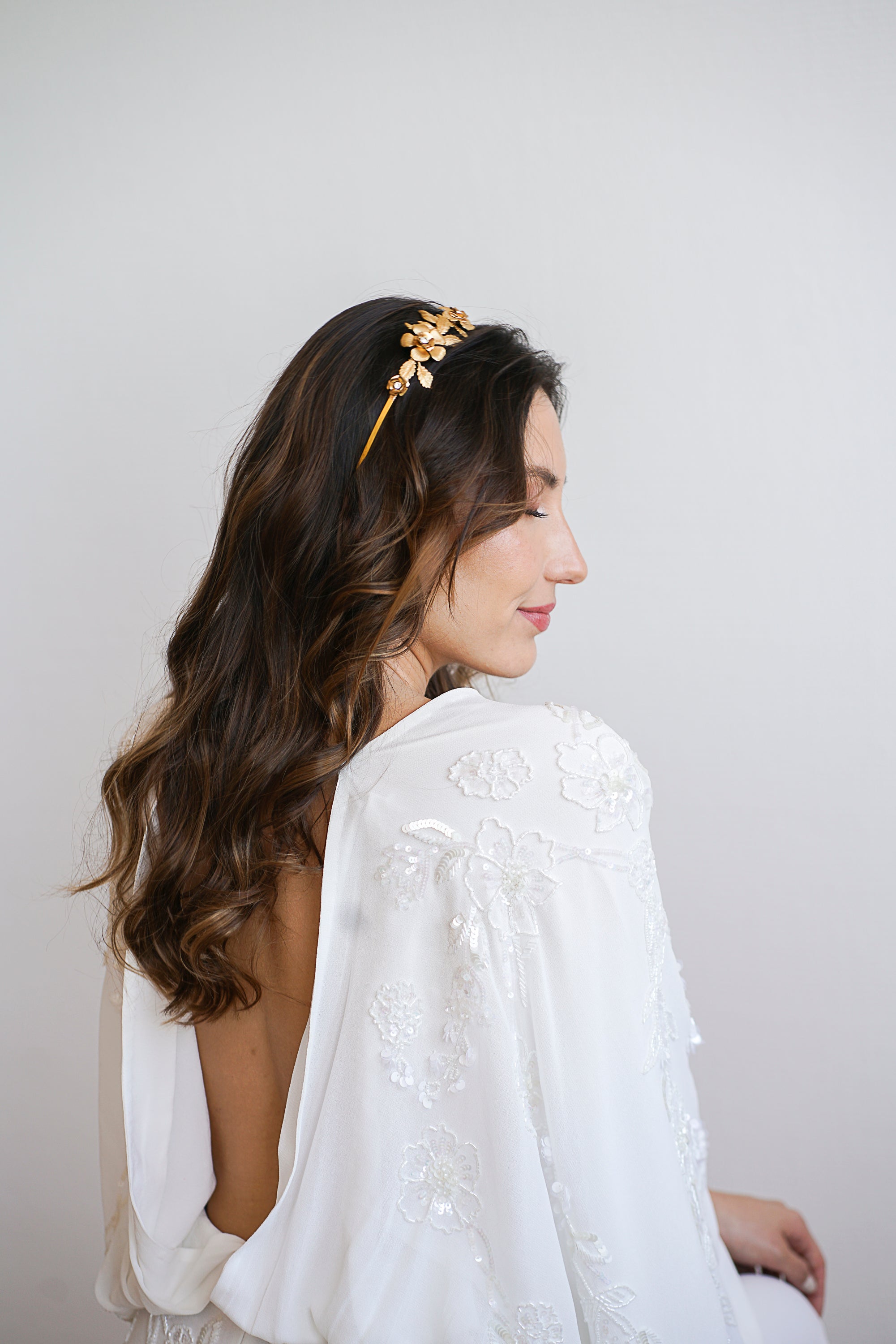 Ce magnifique bijou de tête a été conçu pour orner une coiffure de mariée au style romantique, florale et bohème.