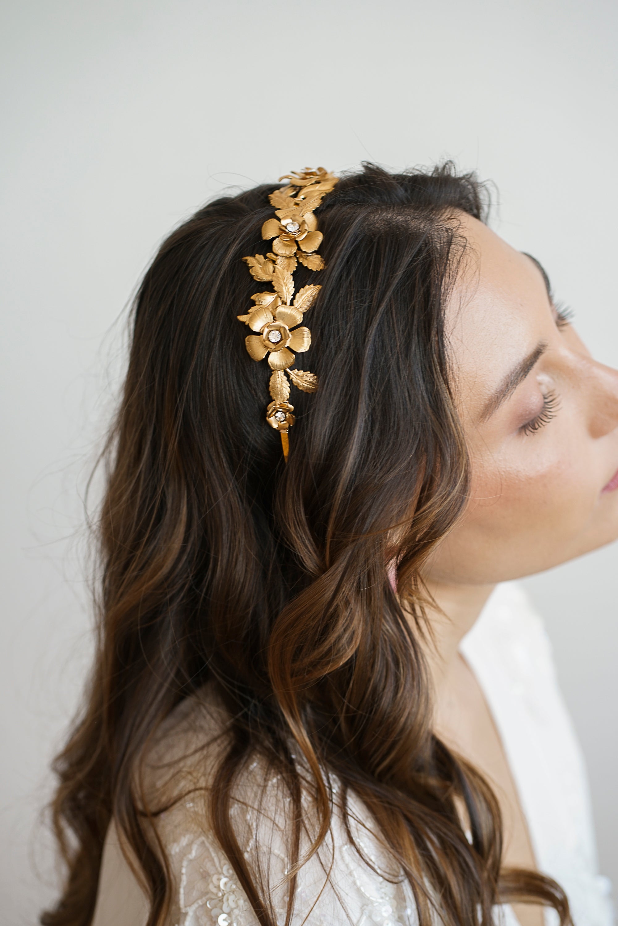 Cette couronne a été fabriquée avec des fleurs et feuilles métalliques dorées. Chaque petite fleur a été assemblée avec délicatesse et amour pour donner forme a un arrangement floral harmonieuse et délicat. Des cristaux Swarovski viennent ajouter une touche d'élégance et délicatesse tout le long du serre-tête. C'est une pièce très légère sublimera somptueusement quelque soit votre coiffure de mariée.
