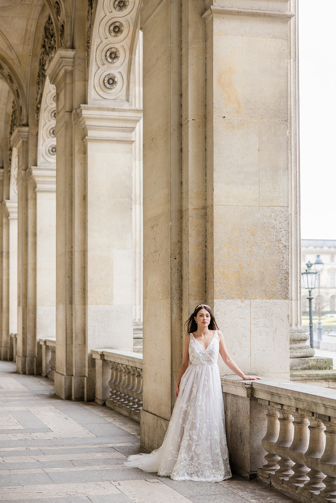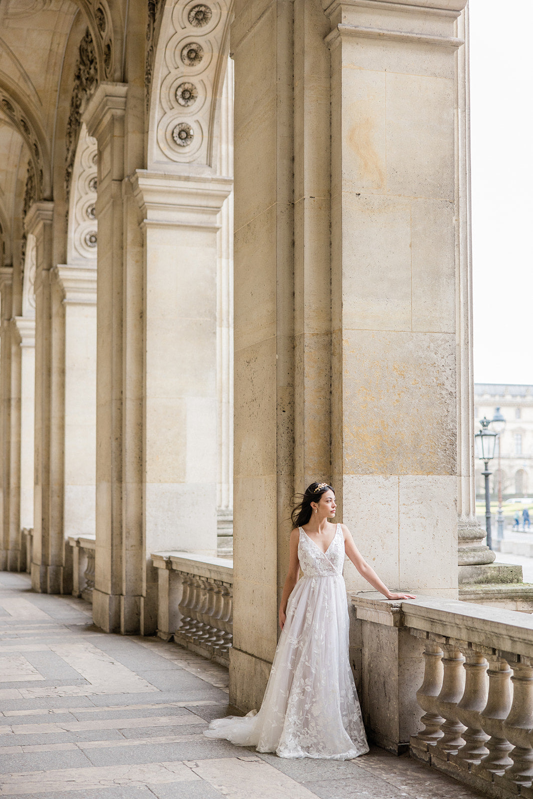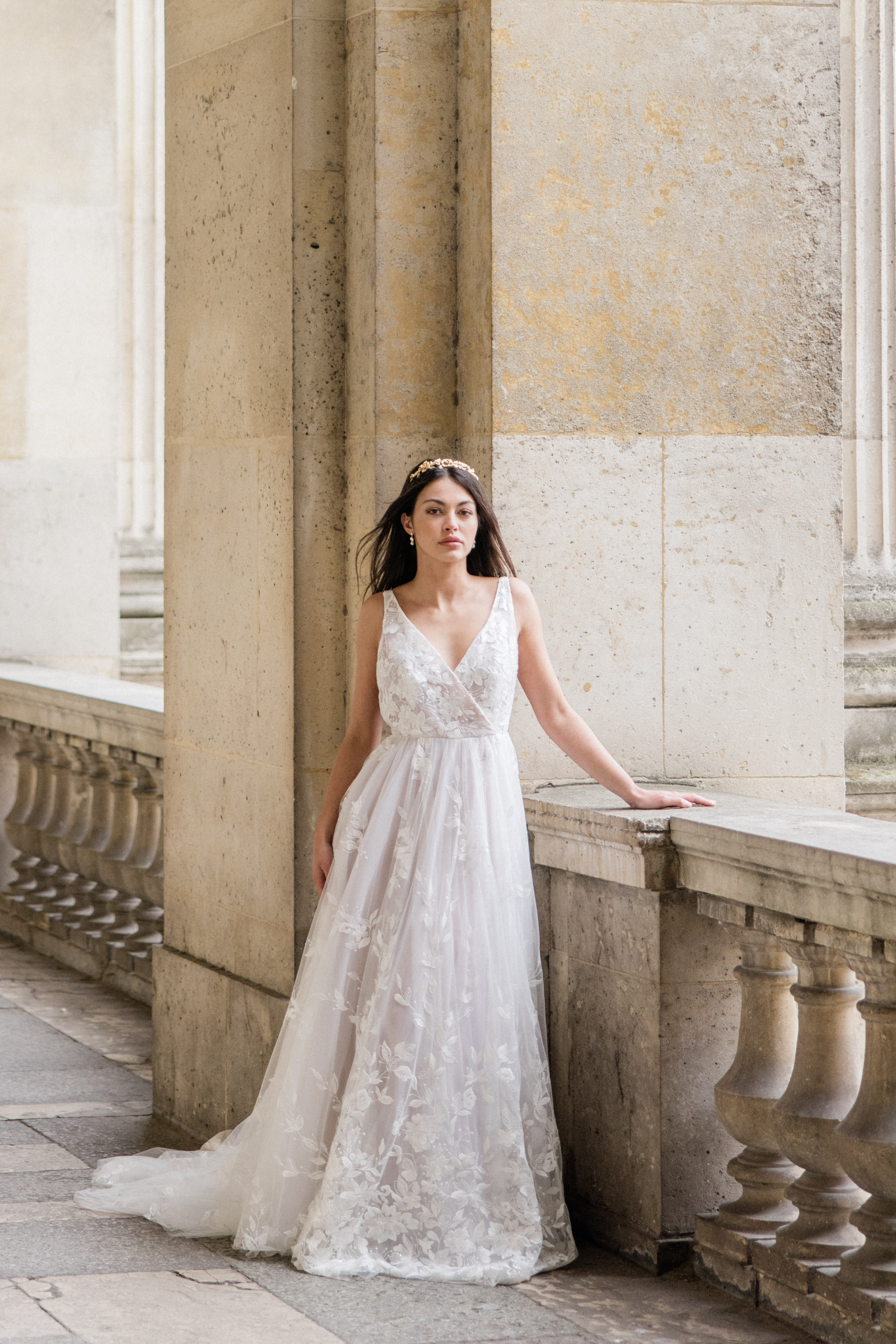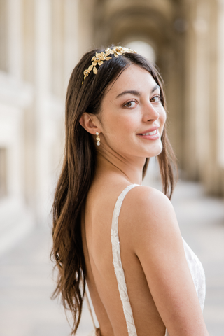 Mariée à Paris avec couronne de fleurs en or style bohème et boucles d'oreilles minimalistes en cristaux et perles