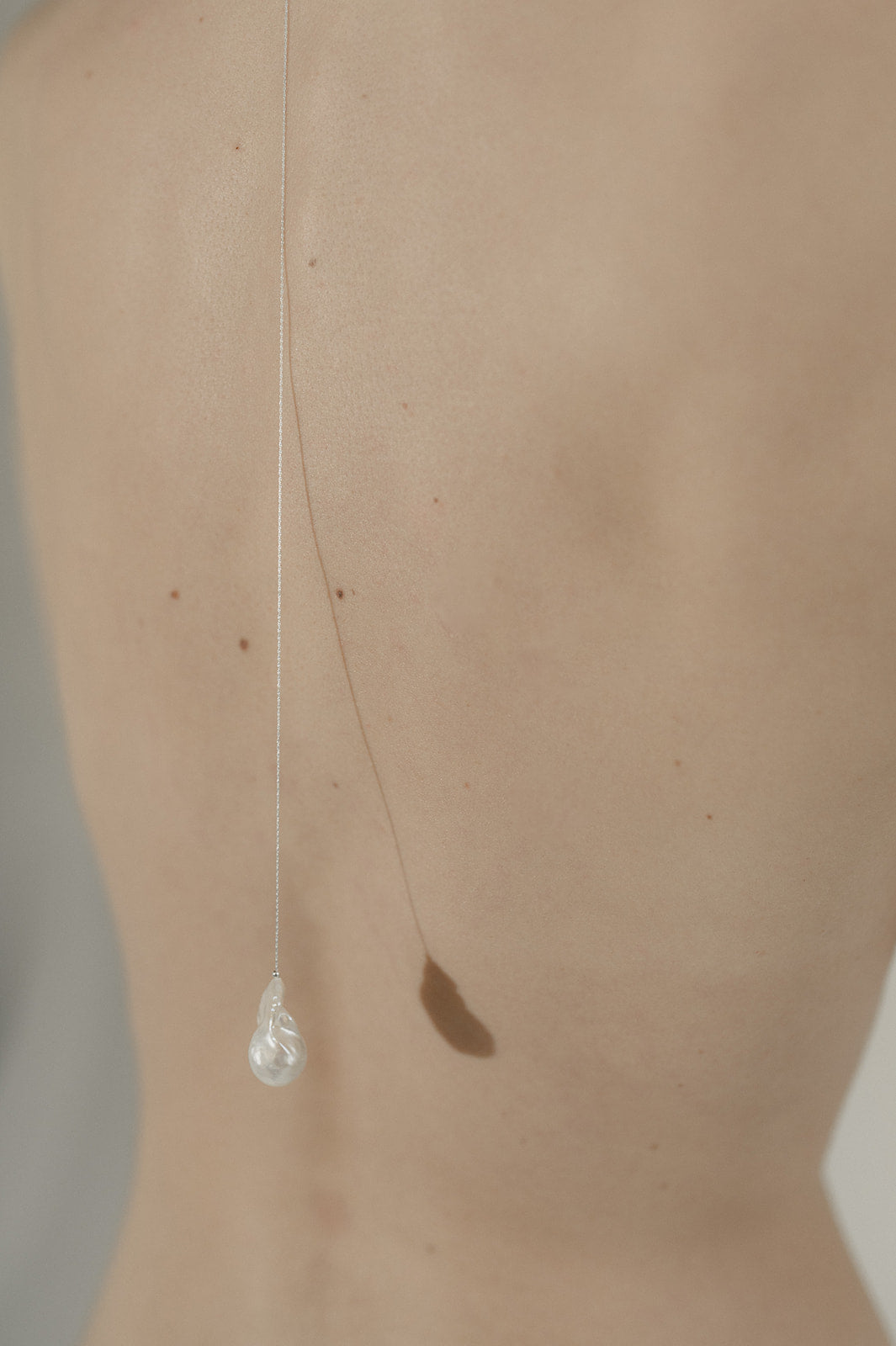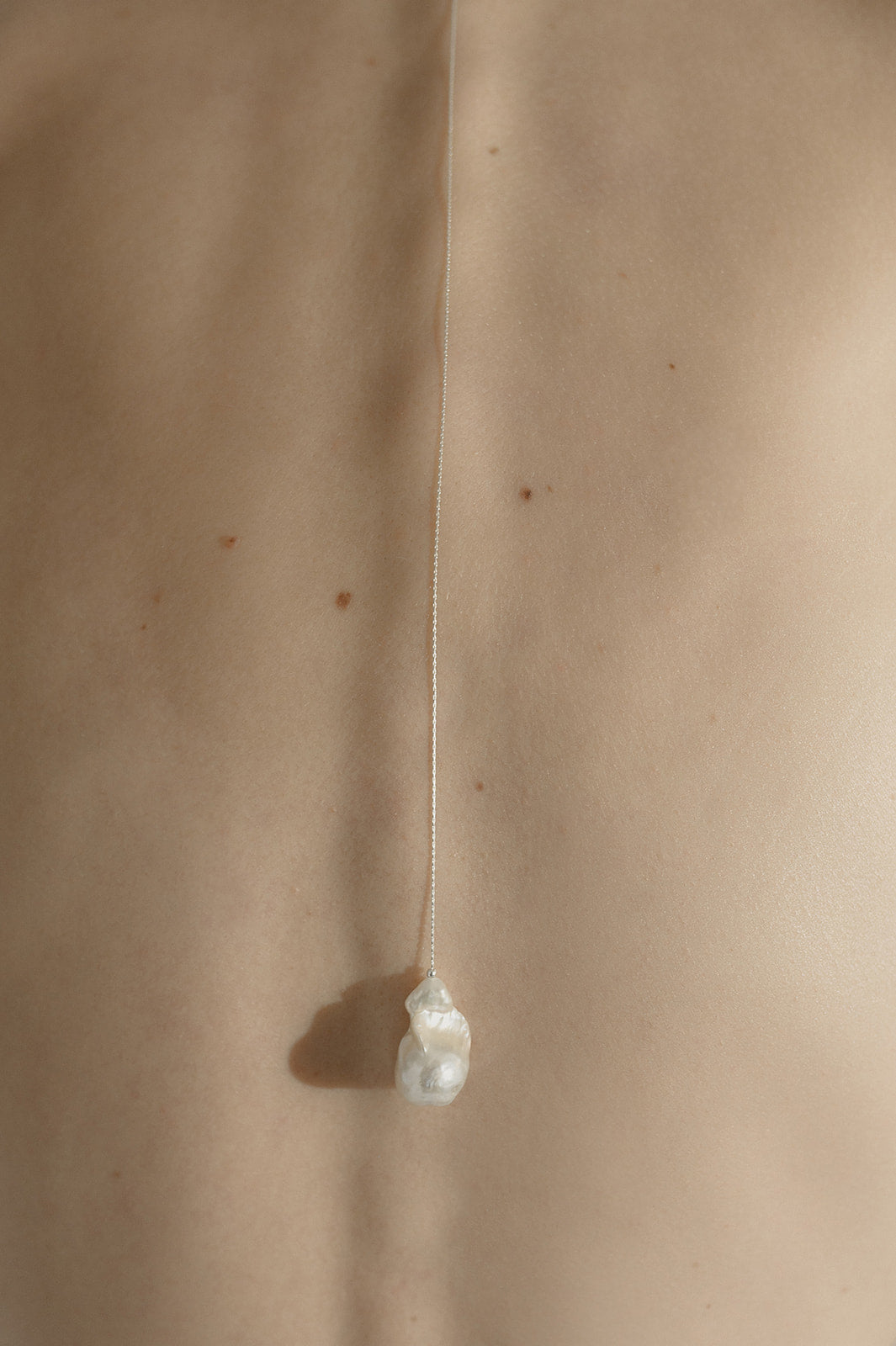 dos d'une femme portant un collier de dos argenté avec une perle naturelle baroque