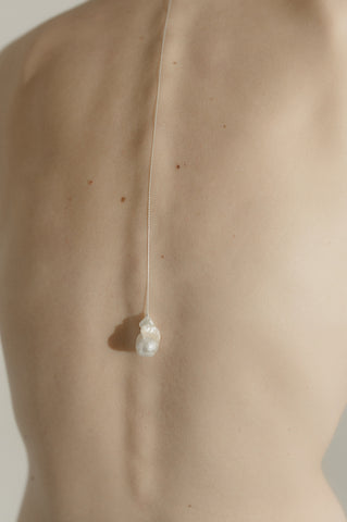 Nous avons créé des bijoux à la hauteur de la personnalité de la mariée moderne, minimaliste et audacieuse. C'est ainsi que nous avons conçu ce collier de dos, mettant en avant la spontanéité de la nature et sa beauté singulière grâce à des perles baroques. Rien ne semble plus inspirant et contemporain que les perles naturelles dites sauvages ou baroques. Leurs irrégularités et leur iridescence nous captivent infiniment.