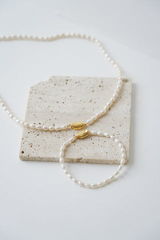 collier et bracelet de perles naturelles avec la même attache doré posé sur une table blanche