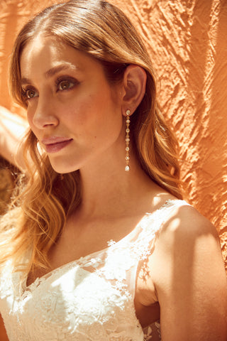mariée portant des boucles d'oreilles longues pendantes en or et cristaux style vintage et romantique