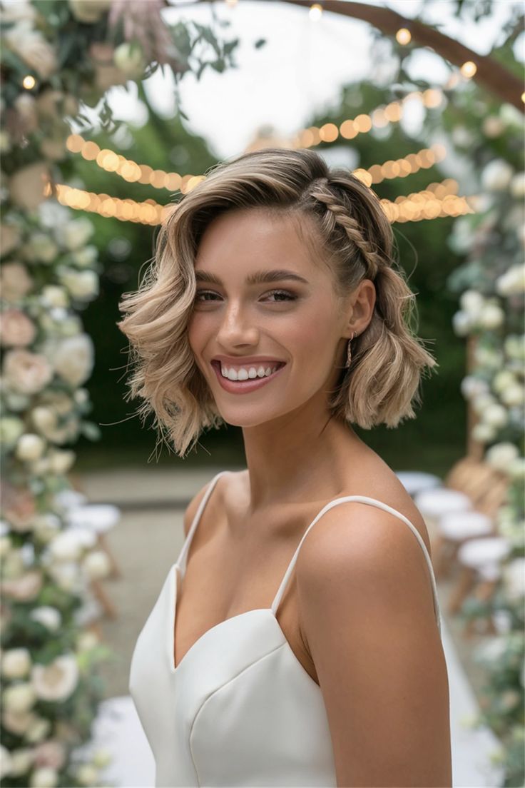 Si vous préférez une touche plus romantique, la queue-de-cheval basse et texturée est une excellente option. Avec des ondulations légères ou des mèches délicatement lâchées autour du visage, elle offre une allure bohème et douce, parfaite pour un mariage champêtre ou en plein air. Les cheveux très courts peuvent être stylisés avec un effet de torsades ou de boucles pour recréer ce look avec élégance.