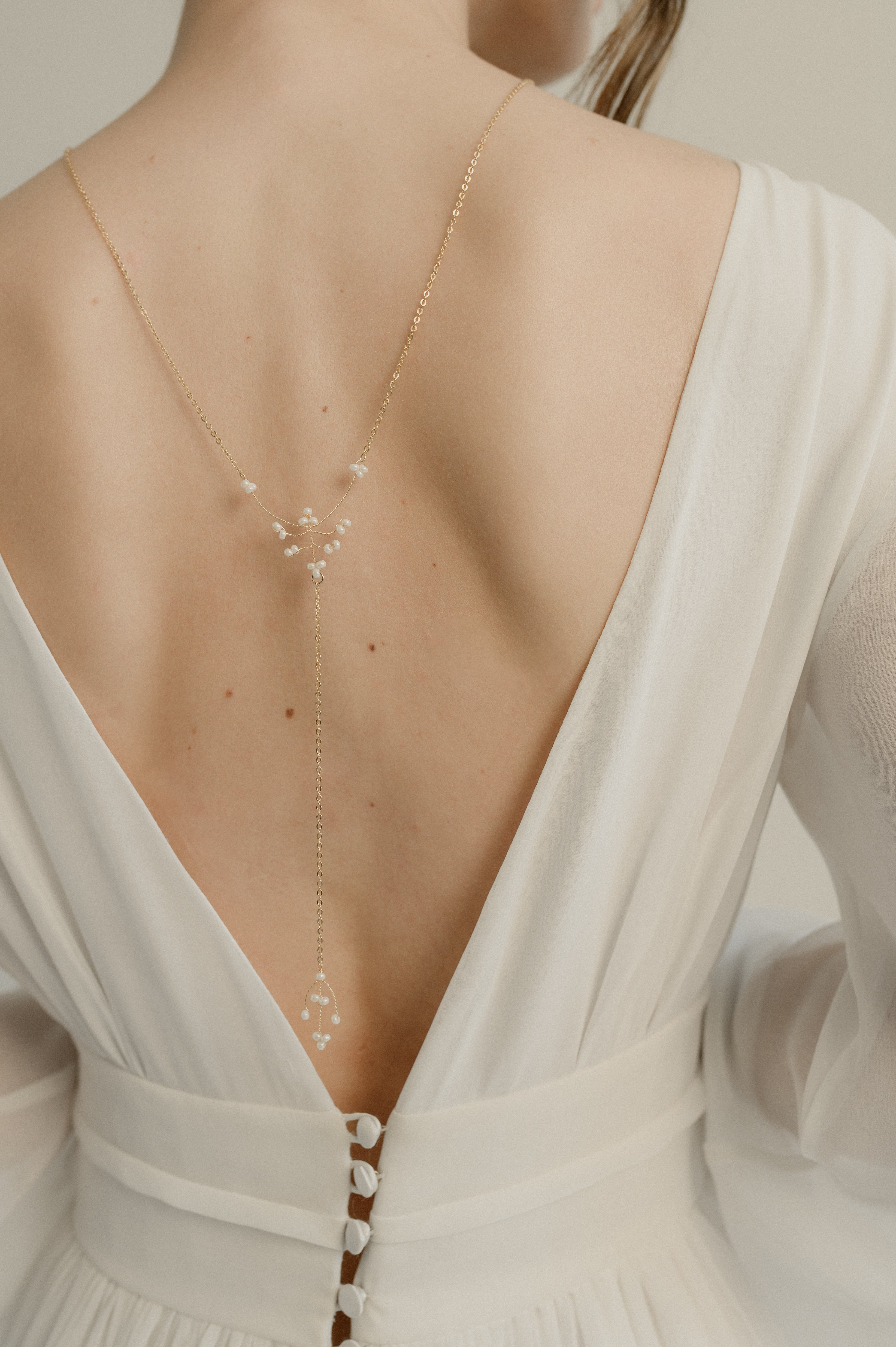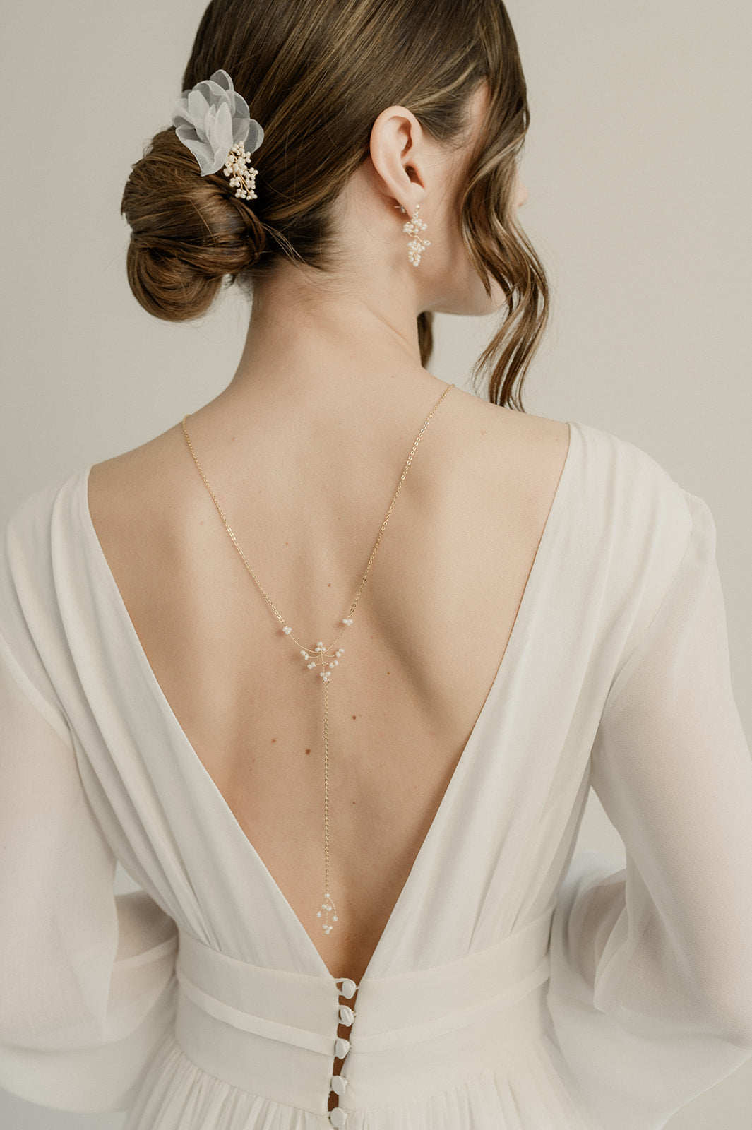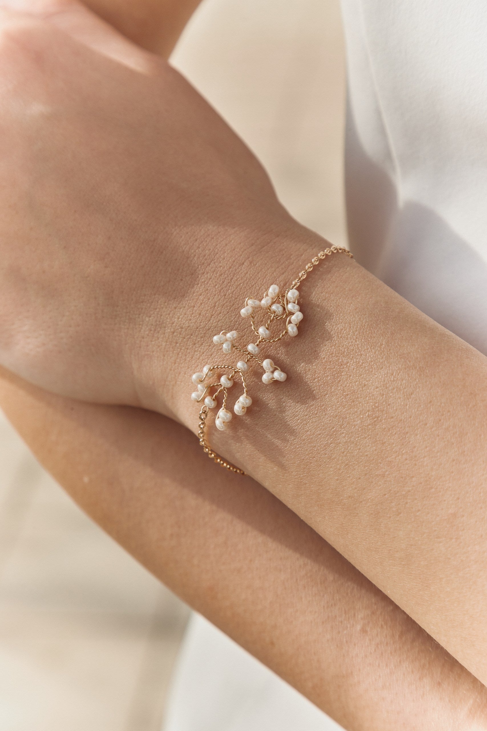 Conçue pour une mariée romantique, féminine et élégante, cette parure de bijoux se caractérise par la délicatesse des perles rocailles torsadées avec du fil doré ou argenté. Tissées pour donner une forme et une structure symétrique et unique, ces perles suspendues nous captivent et nous inspirent.