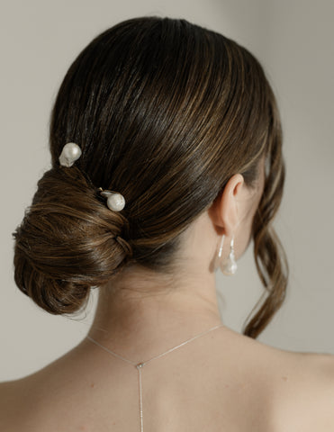 femme de dos qui est coiffée avec un chignon et de spics à cheveux en perle baroque