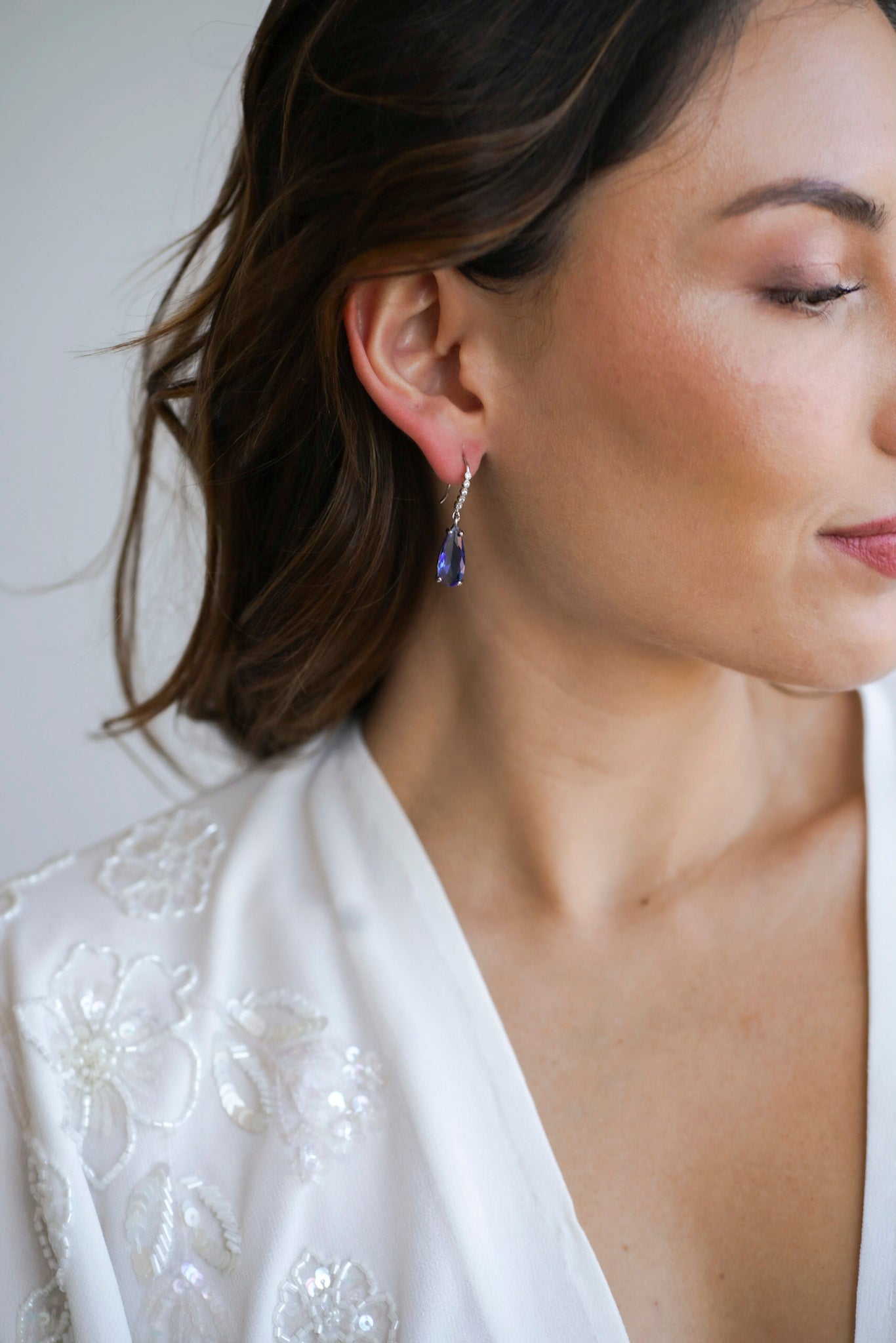 Nos boucles d'oreilles Aster, sont de belles boucles d'oreilles conçues pour apporter ce "quelque chose de bleu" (something blue selon la tradition anglaise) que vous recherchez pour votre tenue de mariée.