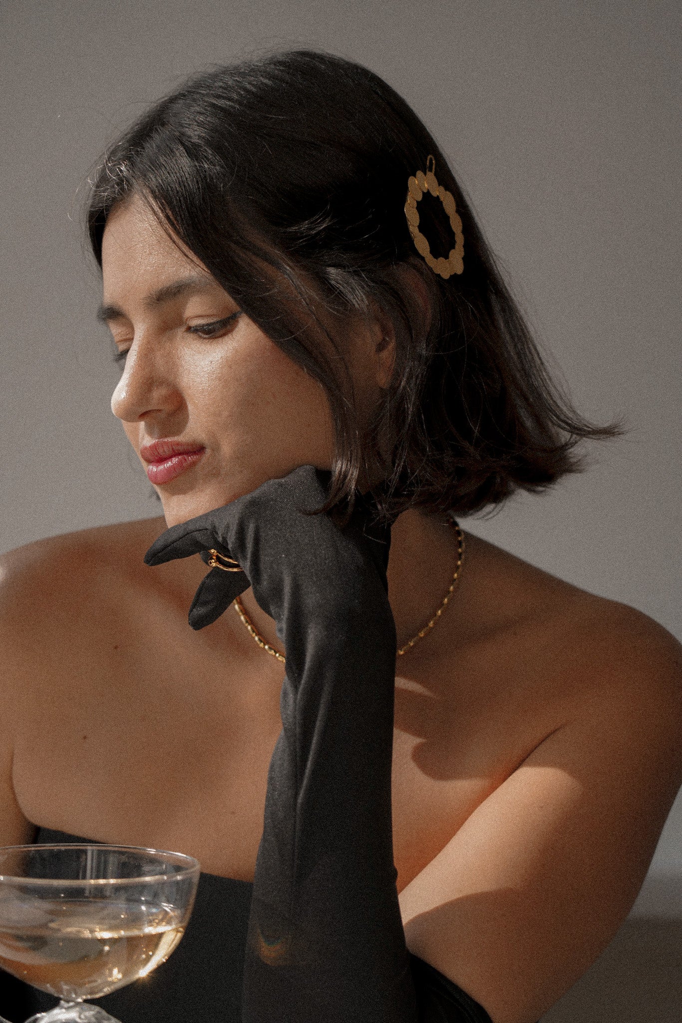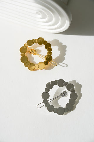 Atomes est une barrette artisanale, fabriquée à la main en bronze pur. Son design élégant prend la forme d’un cercle composé de disques de tailles variées. Pour garantir une finition durable et de haute qualité, elle est disponible en plaqué or 24k ou en argent.