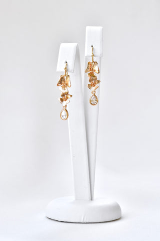 Ces jolies boucles d'oreilles fleuries, sont fabriquées avec deux petites fleurs fines et délicates de tailles différentes. De chaque arrangement floral pend une petite goutte de cristal transparent. Toutes les pièces dorées de ce bijou de mariage sont faites en métal recouvert d'un bain d'or de 24k.