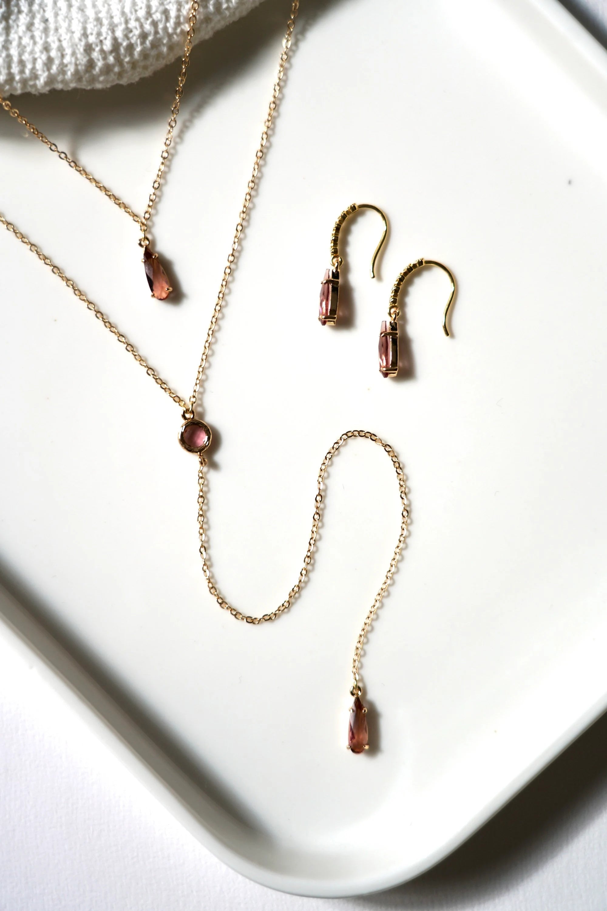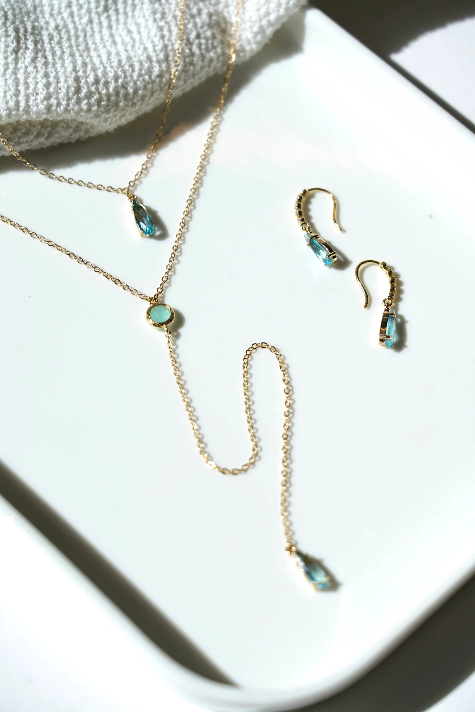 Cette création a été fabriquée avec des chaines très fines et délicates plaquées en or de 24 k. Ce bain en or assurera une couleur résistante et durable du bijou. Des gouttes allongées avec des pierres en verre bleues sont placées sur le devant et à l'arrière du collier. Une goute ronde est placée au milieu du dos pour un effet romantique.