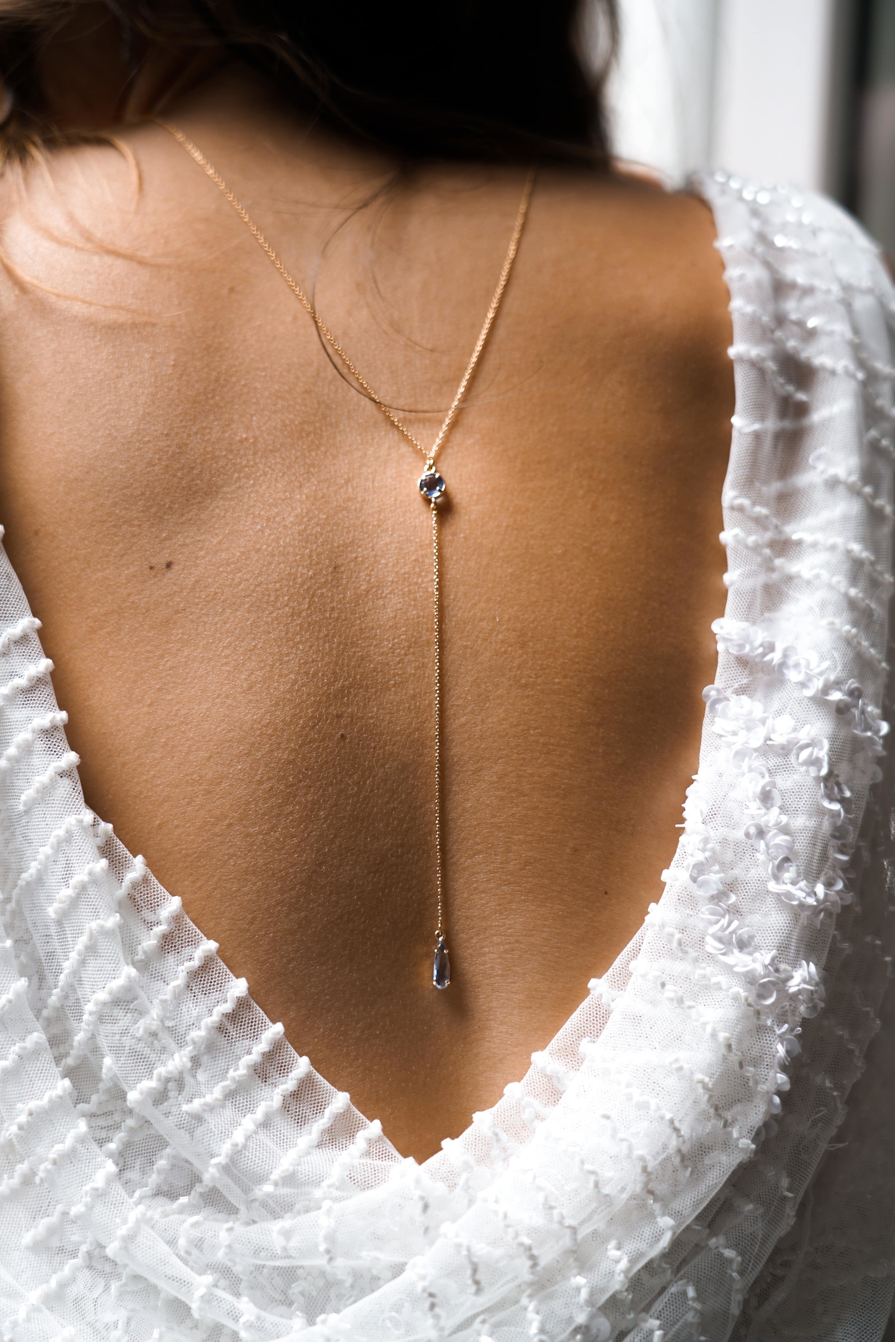 Magnifique collier pour un décolleté de dos avec des pierres bleues. Ce joli bijou de mariée est conçu pour la tradition de mariage "quelque chose de bleu".