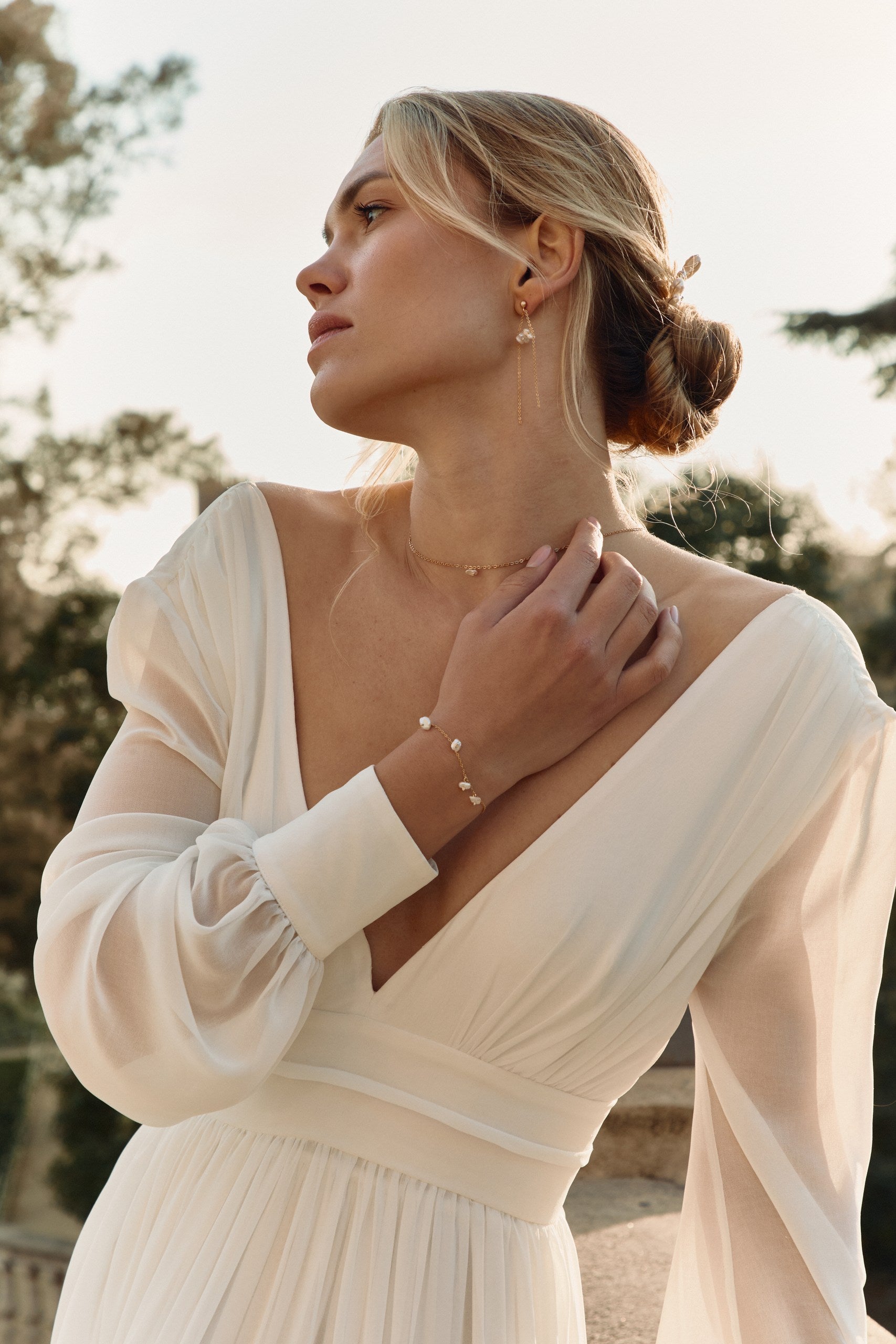 Pour la collection 2024, notre ambition était de créer une parure audacieuse et moderne tout en restant élégante et délicate. Colibri incarne parfaitement cette vision, avec un ensemble de bijoux aériens, souples et très légers qui ajoutent une touche délicate à votre tenue de mariée.