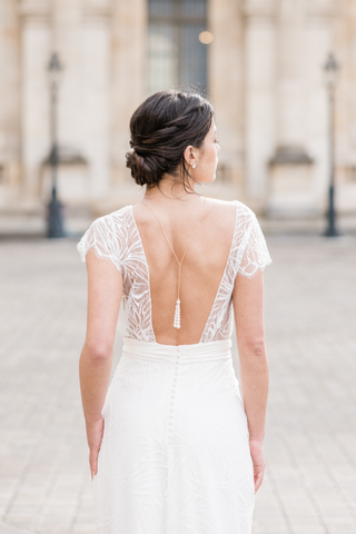 Mariée avec grand décolleté de dos dans une robe en dentelle accessoirisé d'un collier de dos à pompom de perles