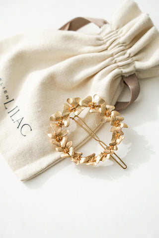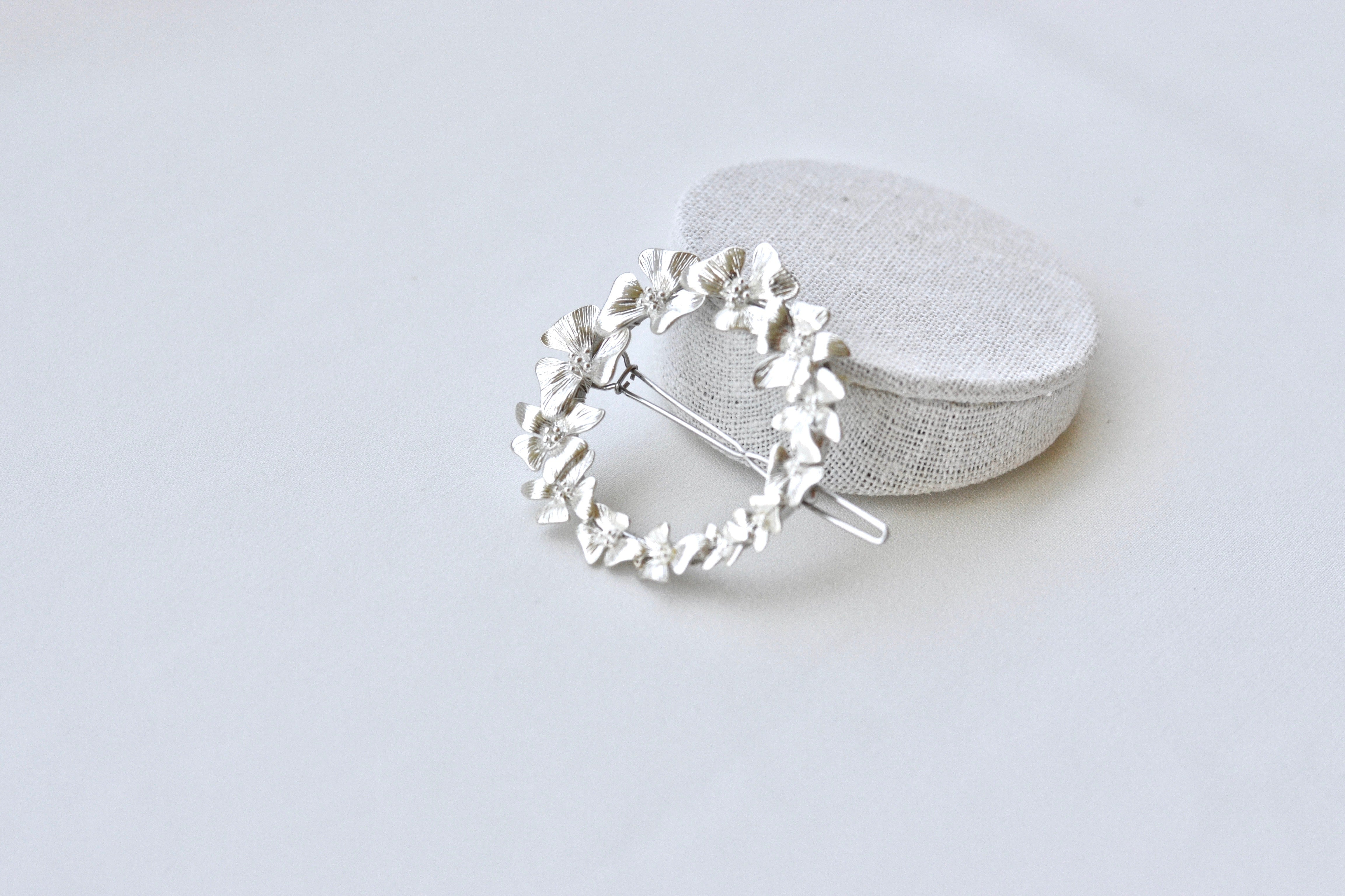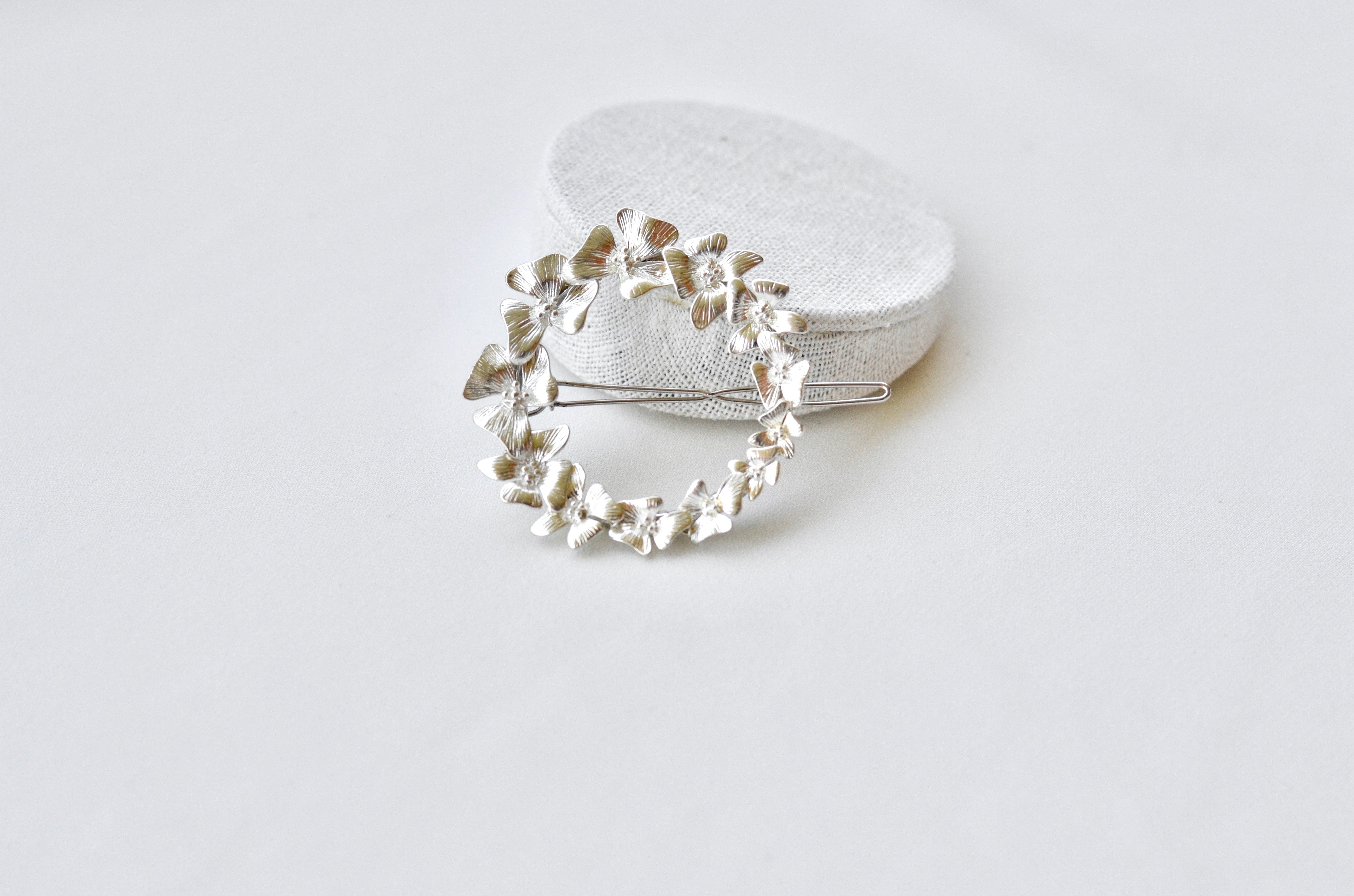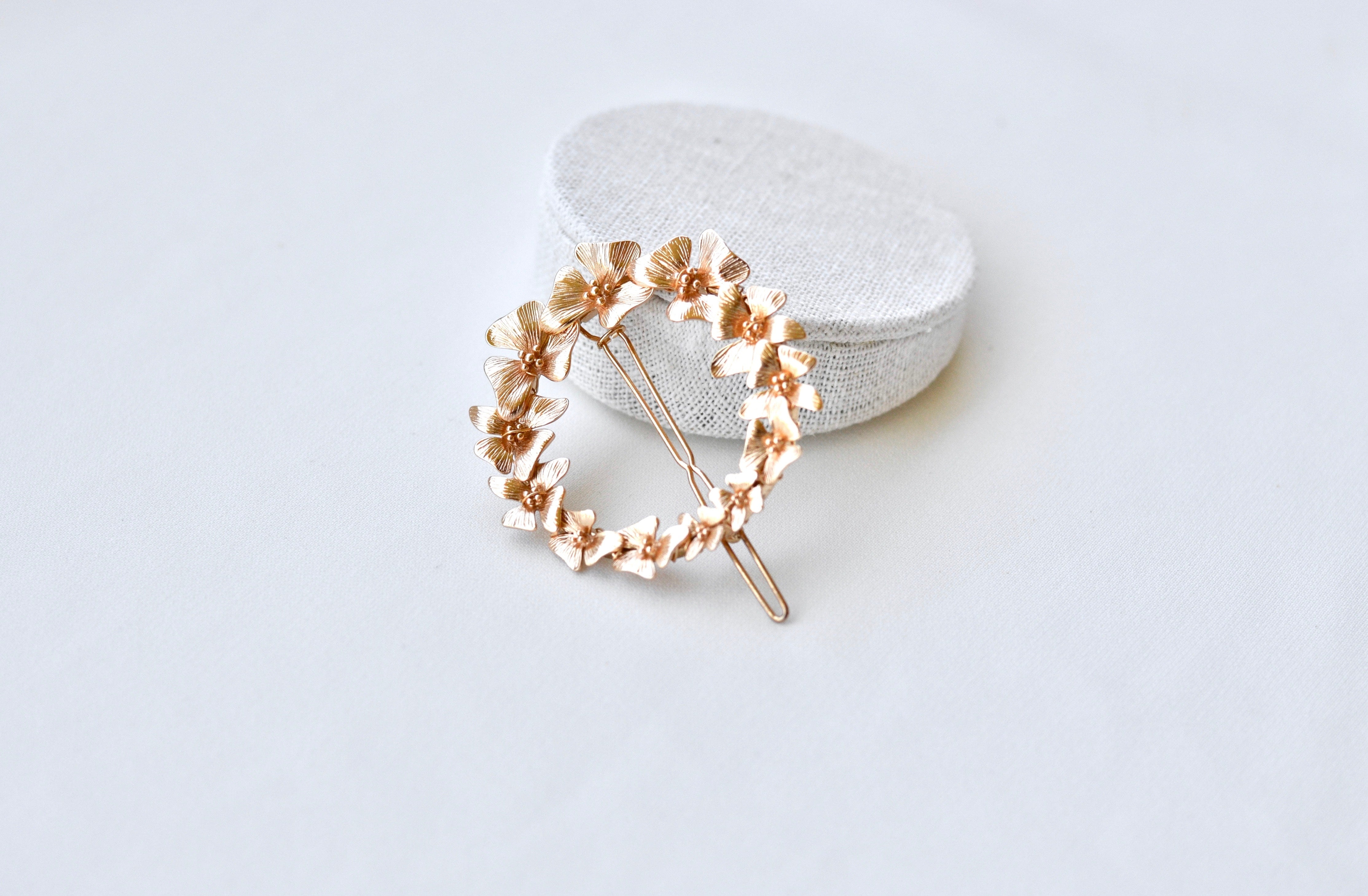 Ce joli accessoire de coiffure est fait avec une barrette en forme de cercle qui a été ornée de fleurs délicates et romantiques. Chaque fleur est faite en métal et est baignée d'or ou d'argent pour une finition lisse et durable.