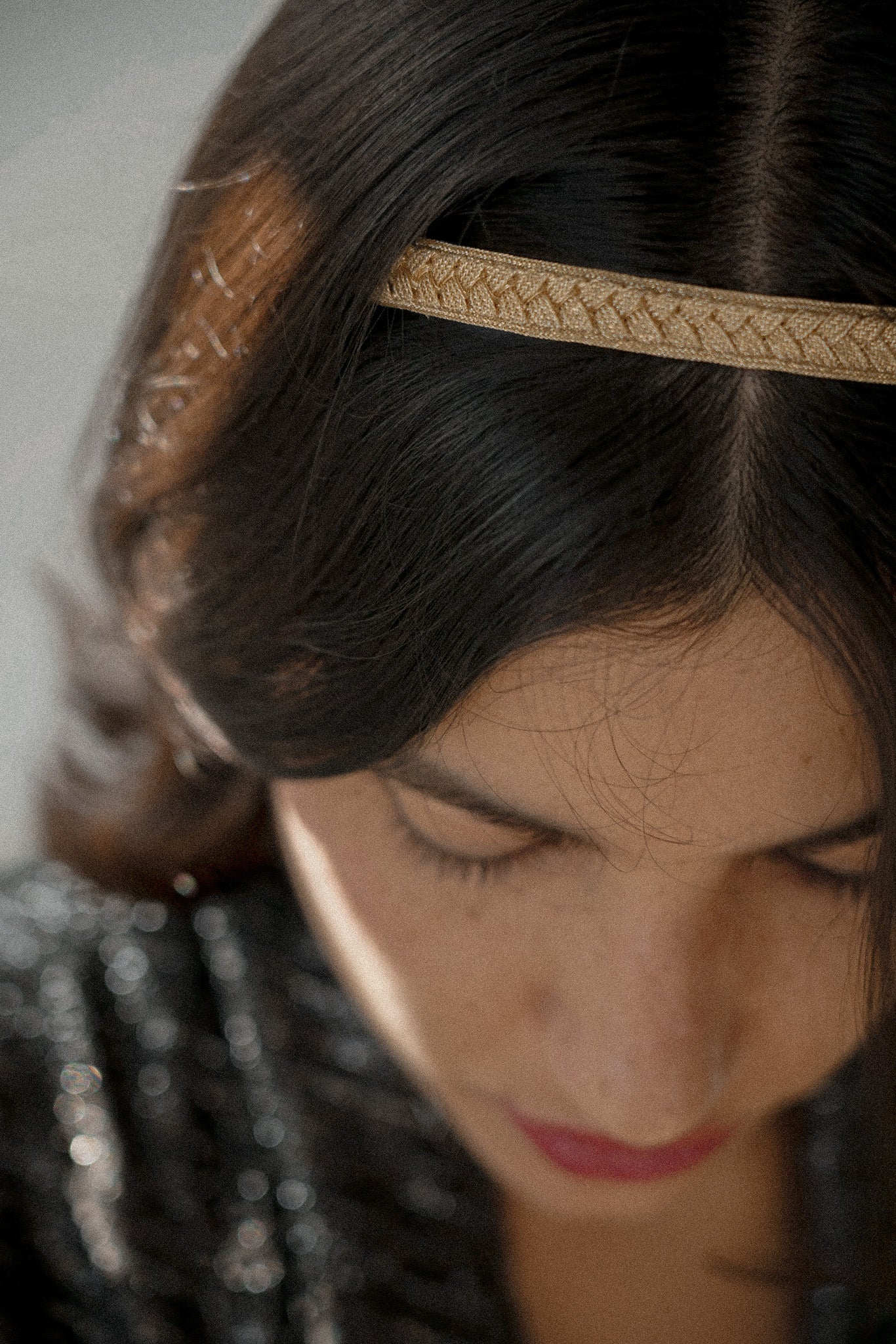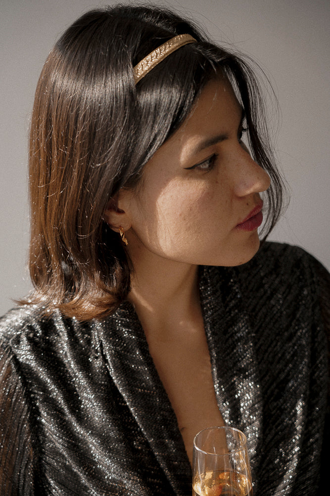 Ce joli bijou de tête est fait à partir de fils à l'aspect métallique soigneusement tressés. Le motif de tressage est tout à fait unique, évoquant celui d'une tresse.  À l'arrière, ce bijou de tete, est cousu soigneusement à un élastique noir, assurant ainsi son ajustement parfait à toutes les tours de tête.