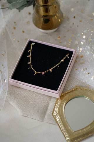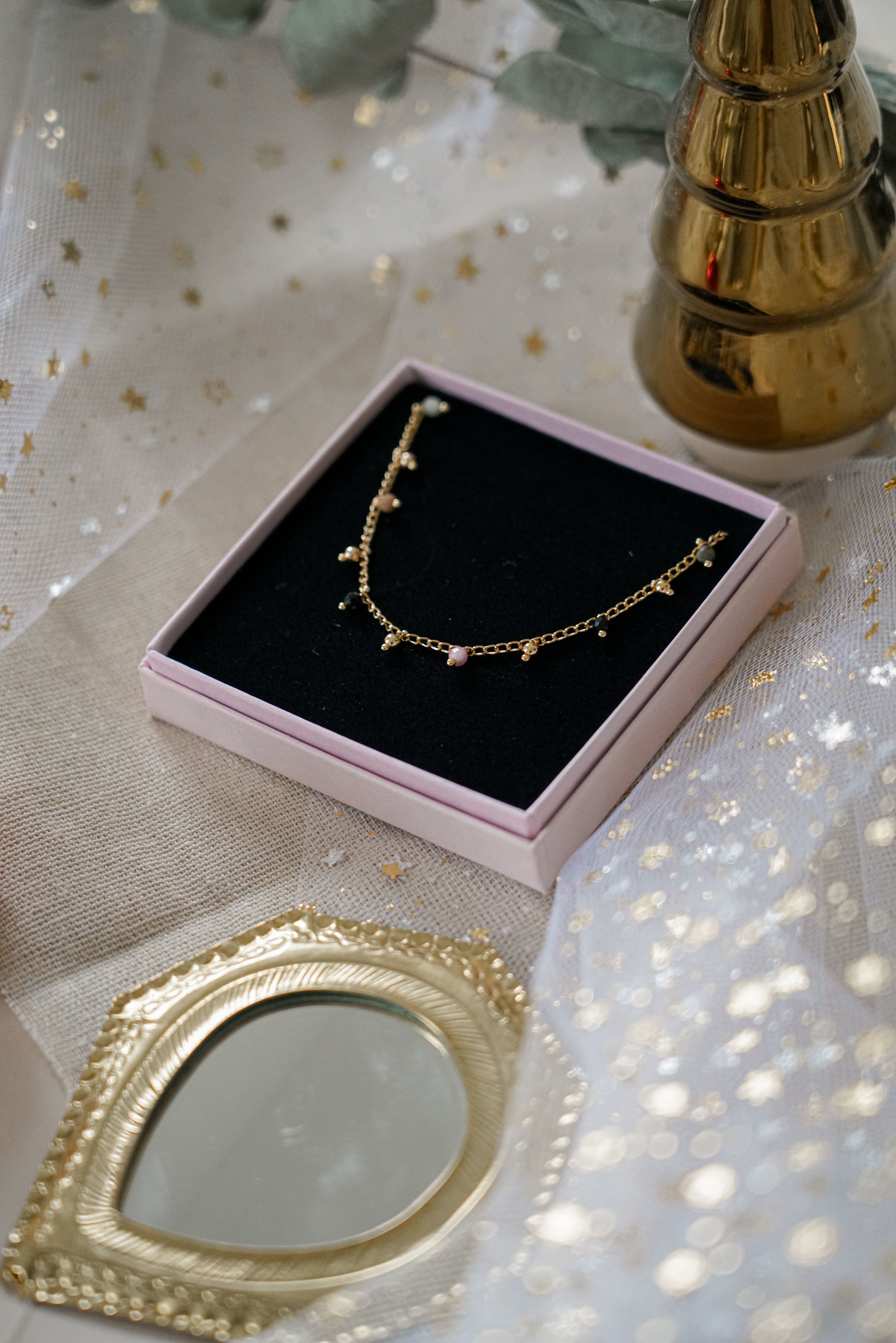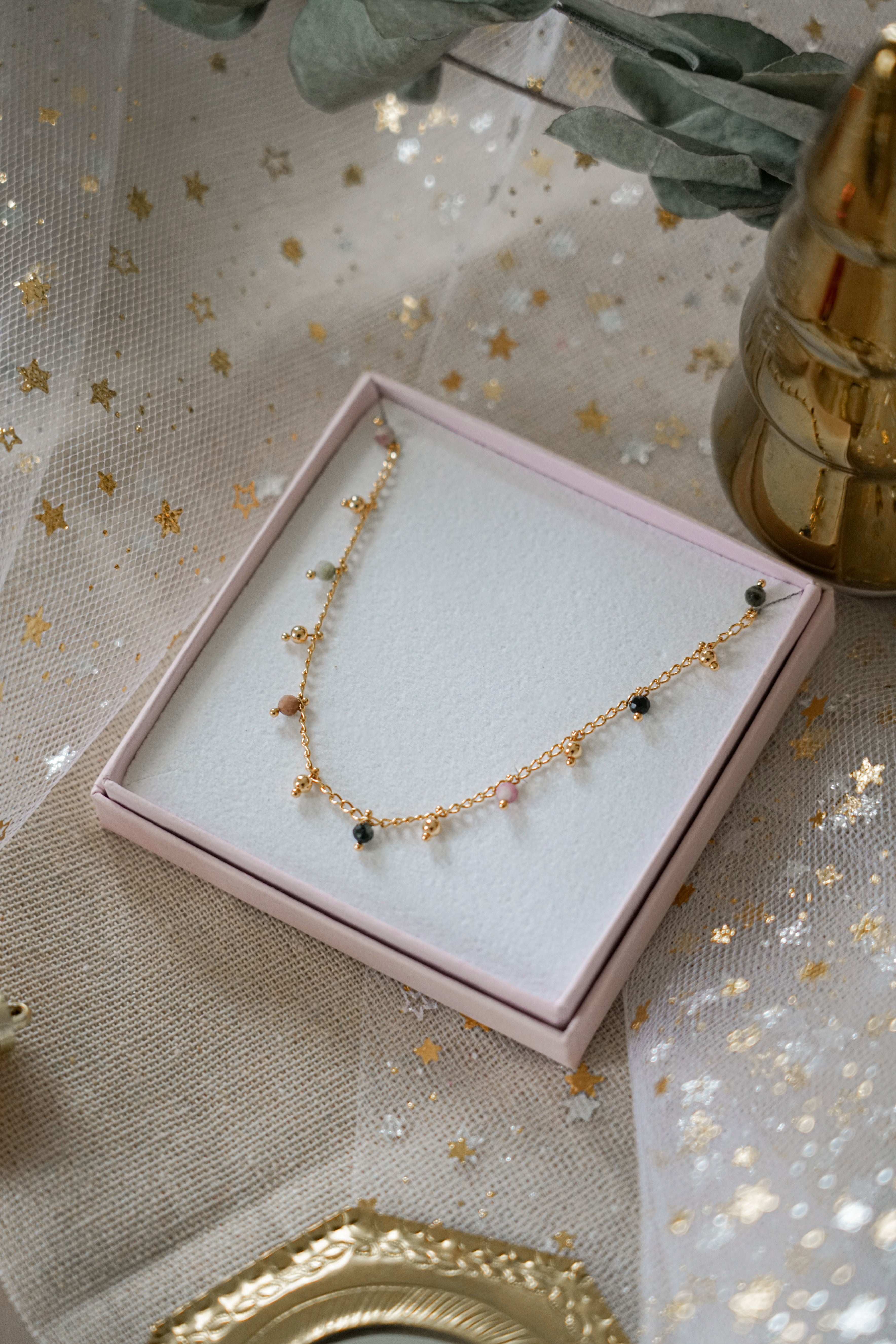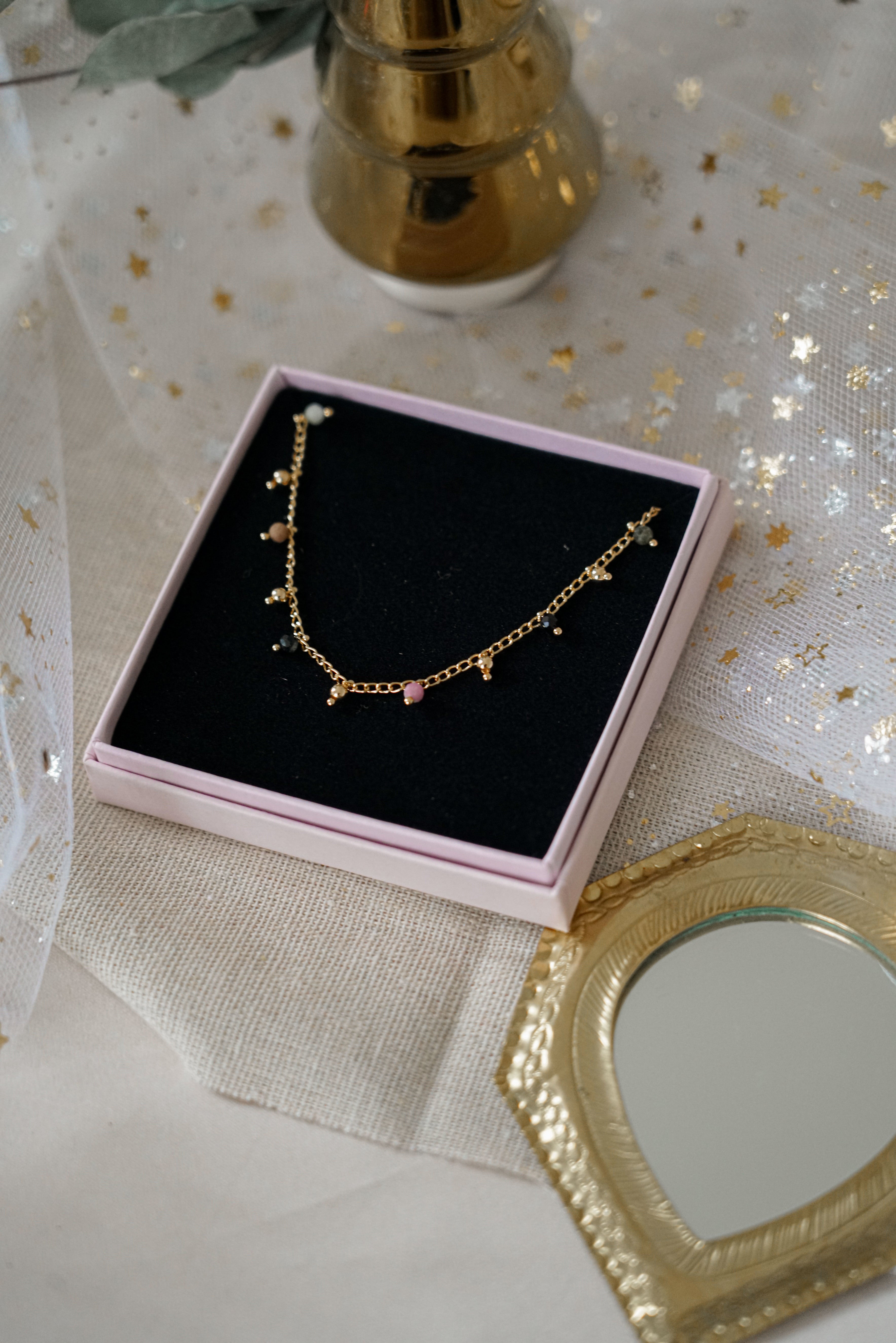 Ce joli bijou est fabriqué avec des chaînes plaquées en or de 18k fines et délicates. Des jolies pierres naturelles tourmaline qui viennent agrémenter et ajouter une touche intemporelle et colorée.