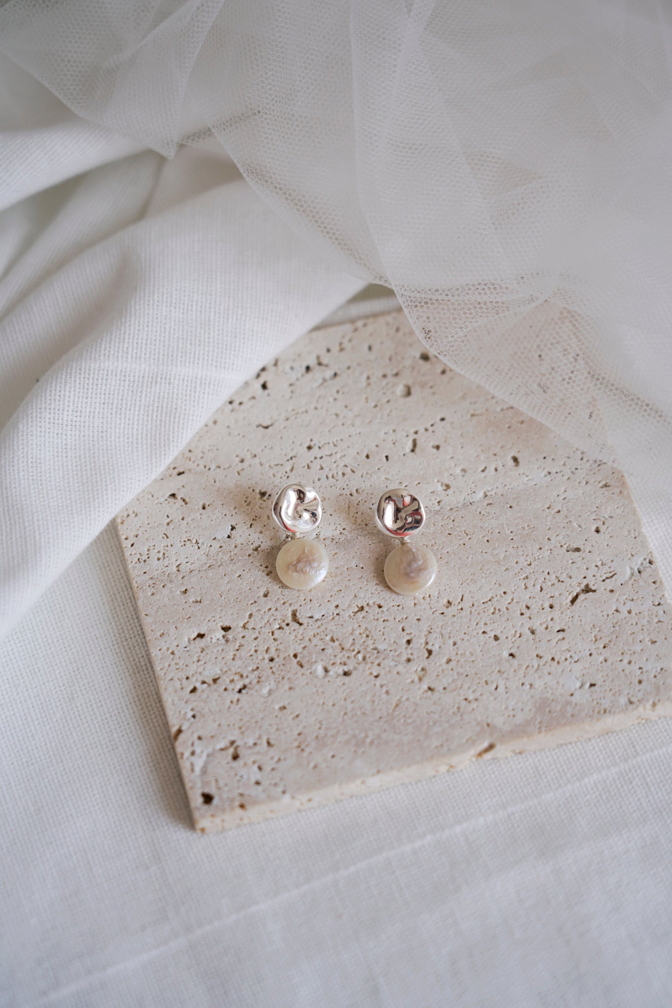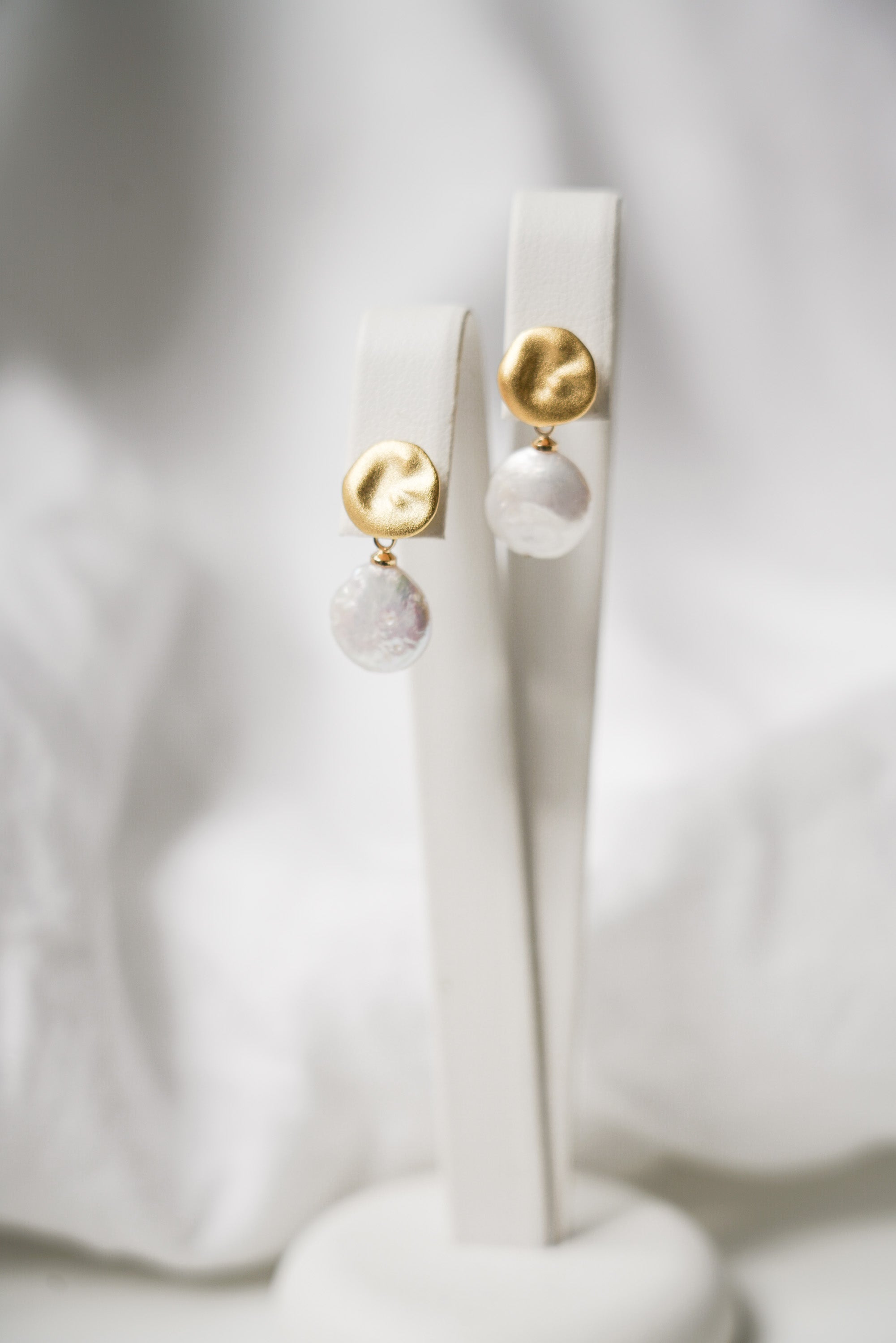 Ces belles boucles d'oreilles sont fabriquées à partir d'un poussoir en forme de disque avec superficie irrégulière mais lisse et brillante. De cette jolie base pend une perle ronde elle aussi de superficie irrégulière et aux reflets iridescents. Les parties dorées ou argentées de ce bijou sont faites en argent 925 et pour obtenir cette couleur dorée les pièces sont plaquées en or 18k.