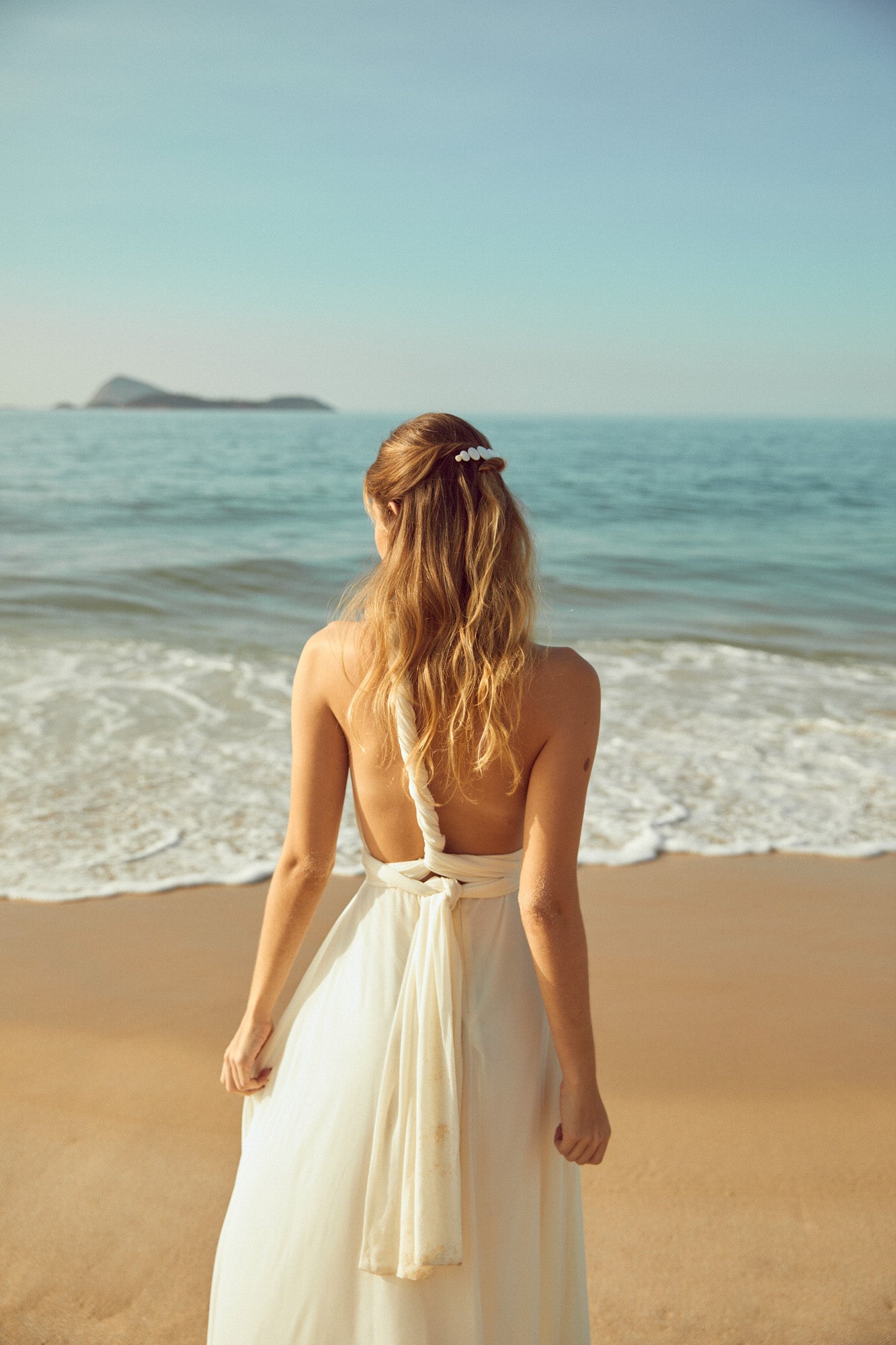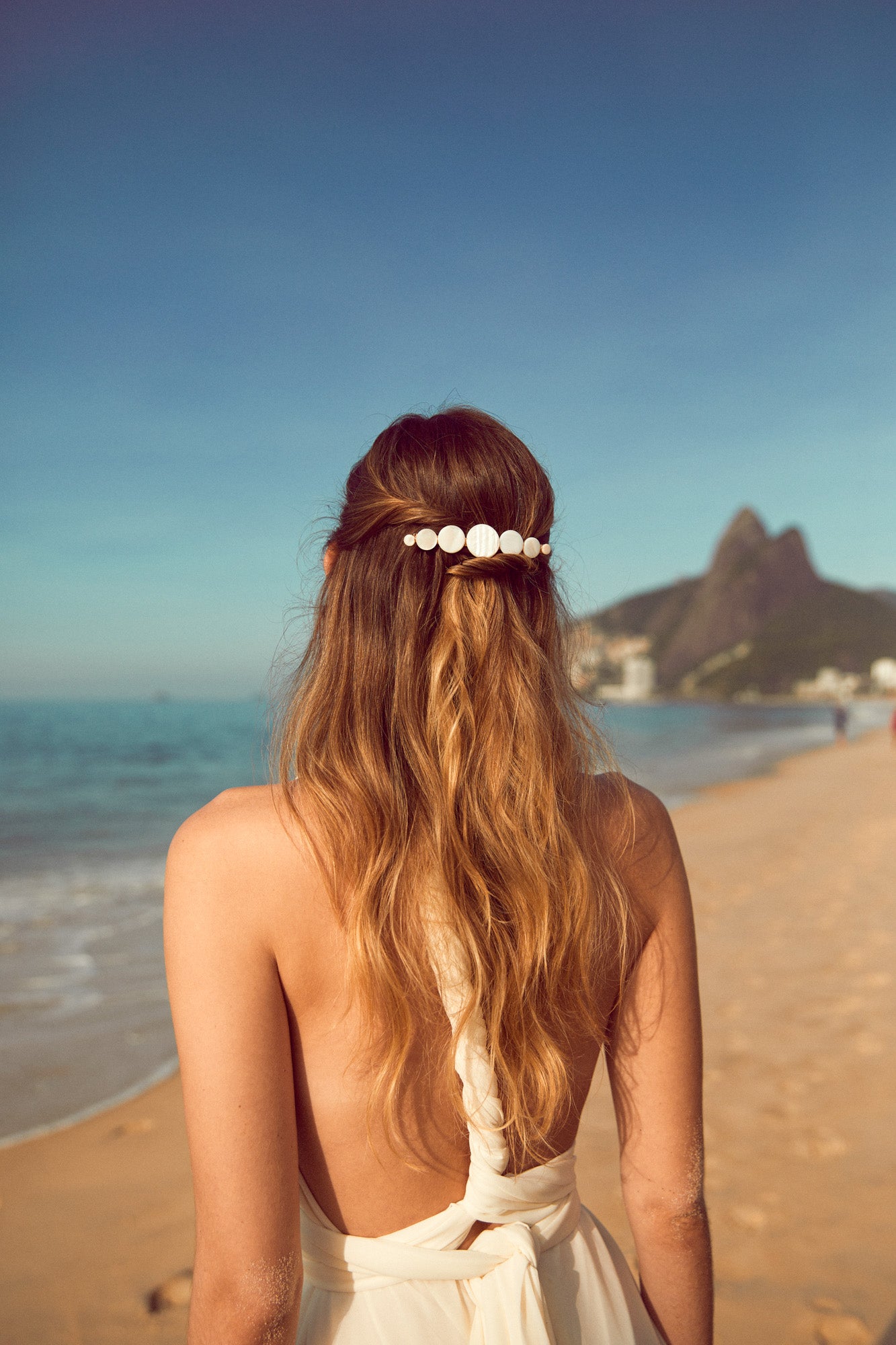Cette belle pince à cheveux a été pensée pour orner et illuminer une belle demie queue de cheval. Sa forme allongée vous permettra de regrouper vos cheveux et les attacher de forme simple et rapide sur l'arrière de la tête. Essayez de beaux cheveux wavy pour obtenir un look romantique et frais.